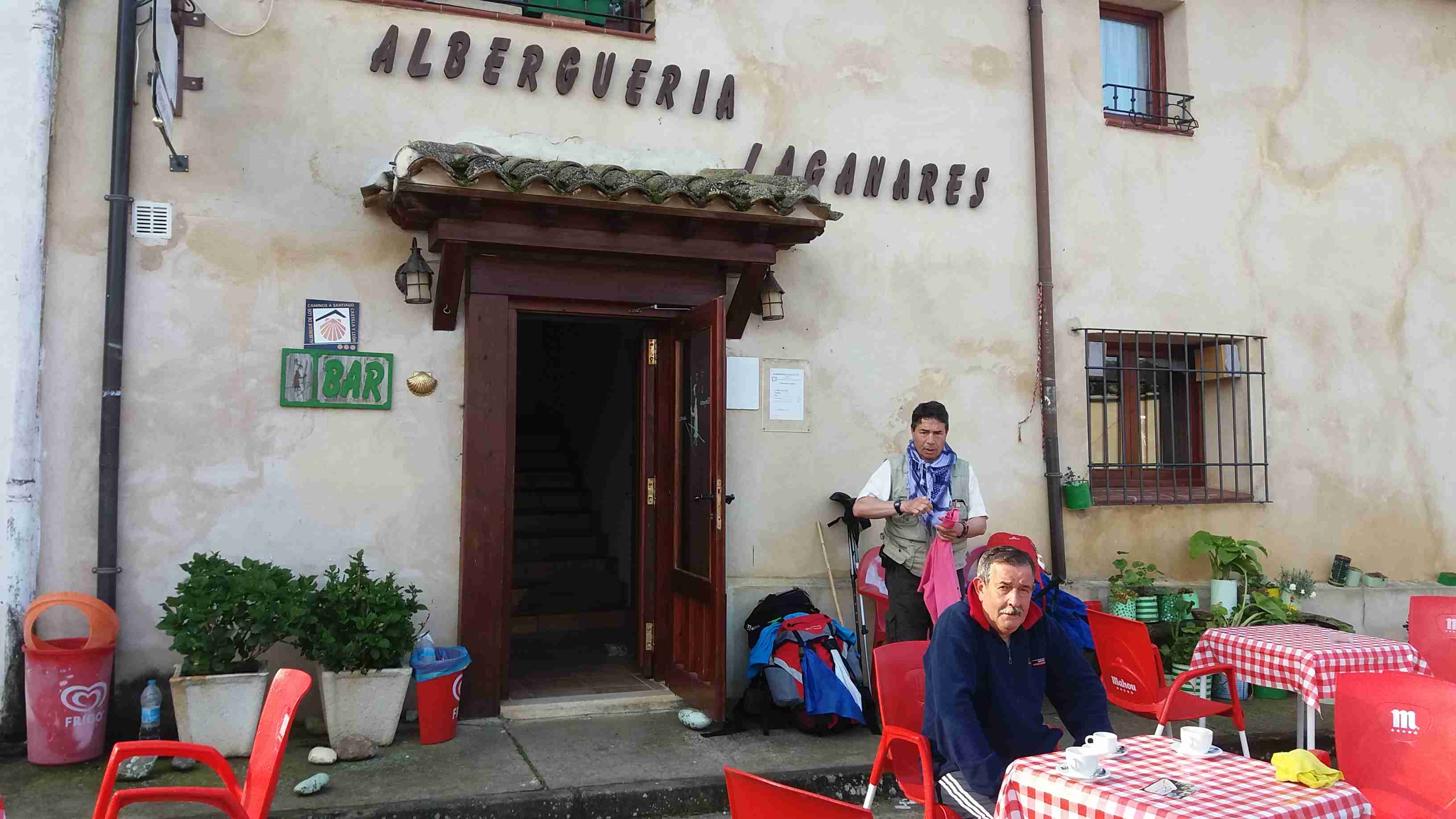 Poco tiempo después llegamos a San Nicolás del Real Camino. Nos detenemos en la Alberguería Laganares a tomar un café y cambiar la camiseta ya sudada. Muchos peregrinos pasan de largo mientras otros se detienen junto a nosotros.