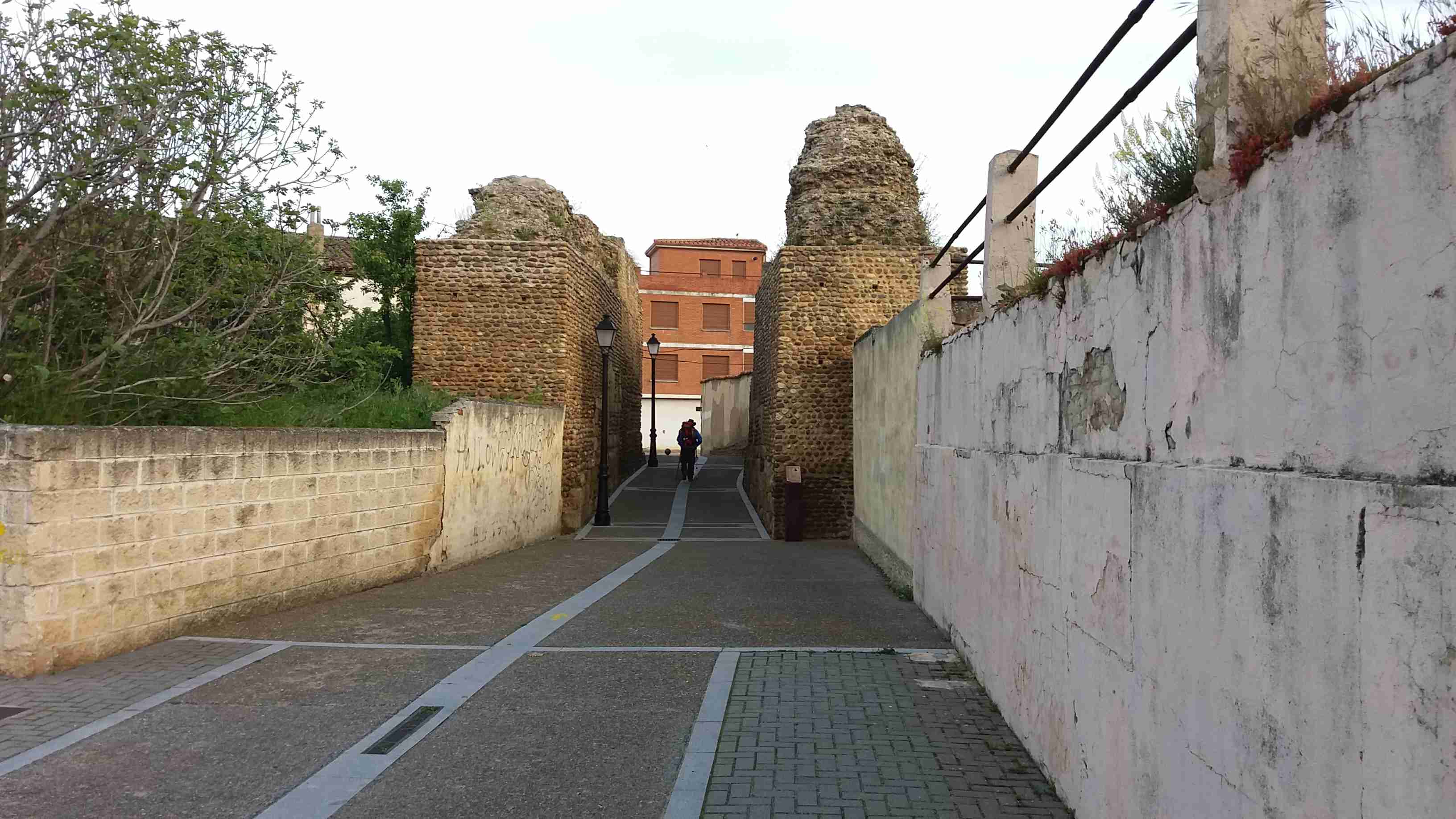 Desayunamos muy temprano en el mismo albergue y salimos dispuestos a llegar a León. Pasamos la puerta principal de la muralla, algo deteriorada construída de cal y canto rodado.