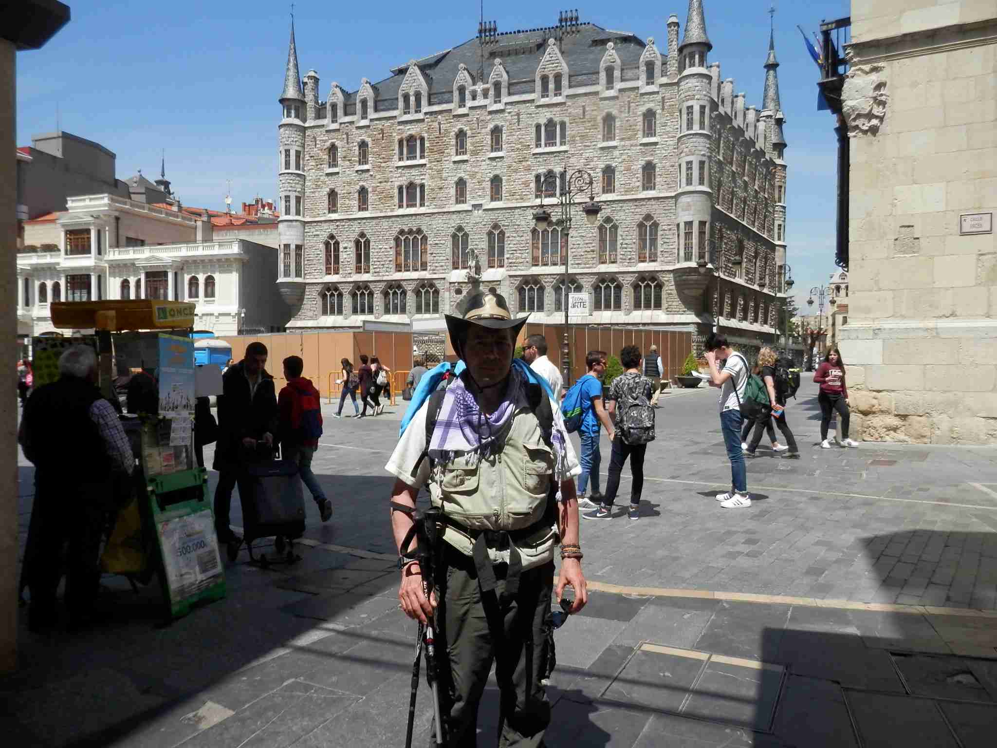De nuevo en marcha nos acercamos definitivamente a León. Cruzamos la carretera N-601 por una pasarela instalada en el año 2010 y después otra sobre la autovía de circunvalación LE-30. Cruzamos el río Torío por otra pasarela peatonal dejando el barrio de Puente Castro a mano derecha a unos 80 metros. En este punto un par de municipales nos toman filiación, suponemos para hacer recuento de los peregrinos que pasábamos, sellamos allí mismo y seguimos hasta la plaza de Santa Ana, donde nos sentamos en una terraza a tomar una cerveza mientras vemos pasar a muchos peregrinos.