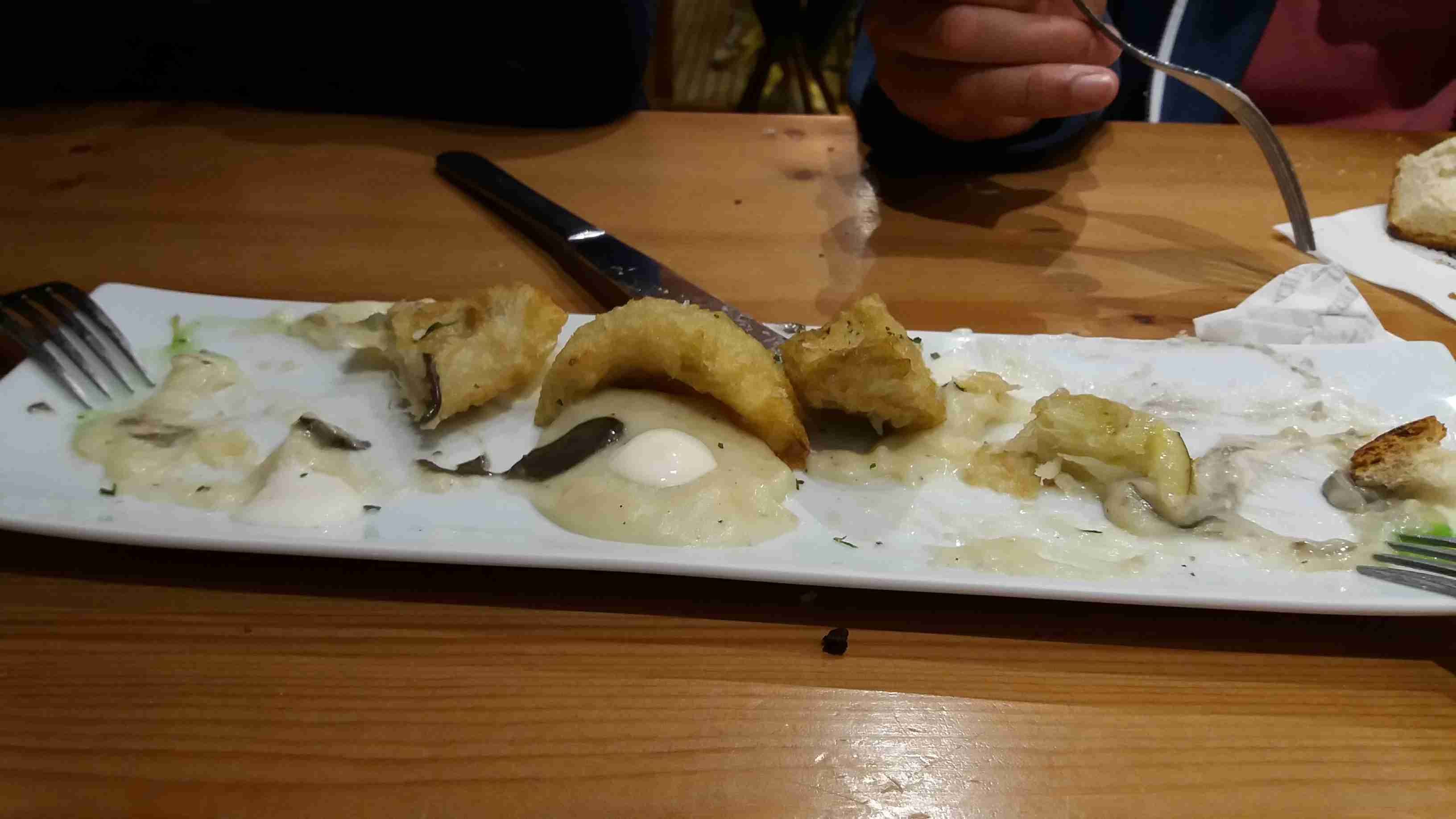 Después de callejear tomando algunas cañas nos acercamos a la Plaza de San Miguel, en el Barrio Húmedo, donde nos acoplamos en una terraza con intención de comer. Hay mucha gente en la plaza y muchos peregrinos.