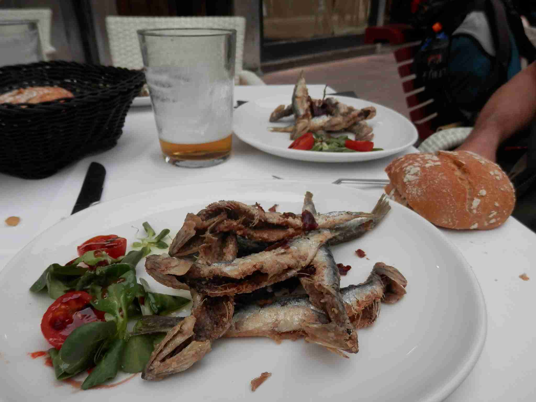 Nada más llegar a la ciudad, después de unas cervecitas en el Restaurante Carta de Ajuste, en la calle Covadonga, muy cerca del albergue, hemos comido unos garbanzos con callos, bocartes fritos con crujiente cecina y unos excelentes postres.