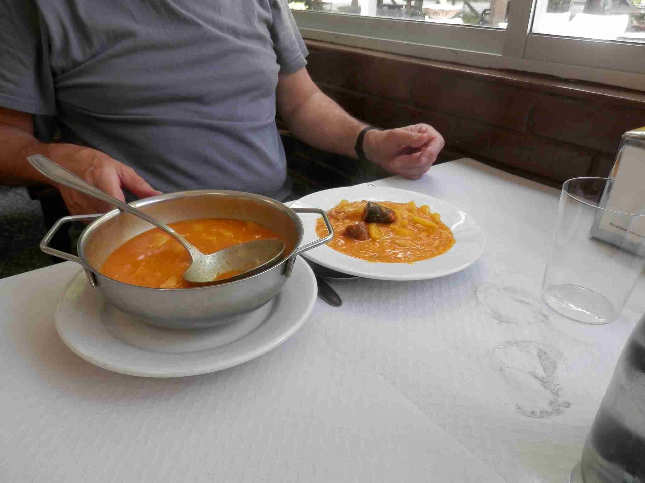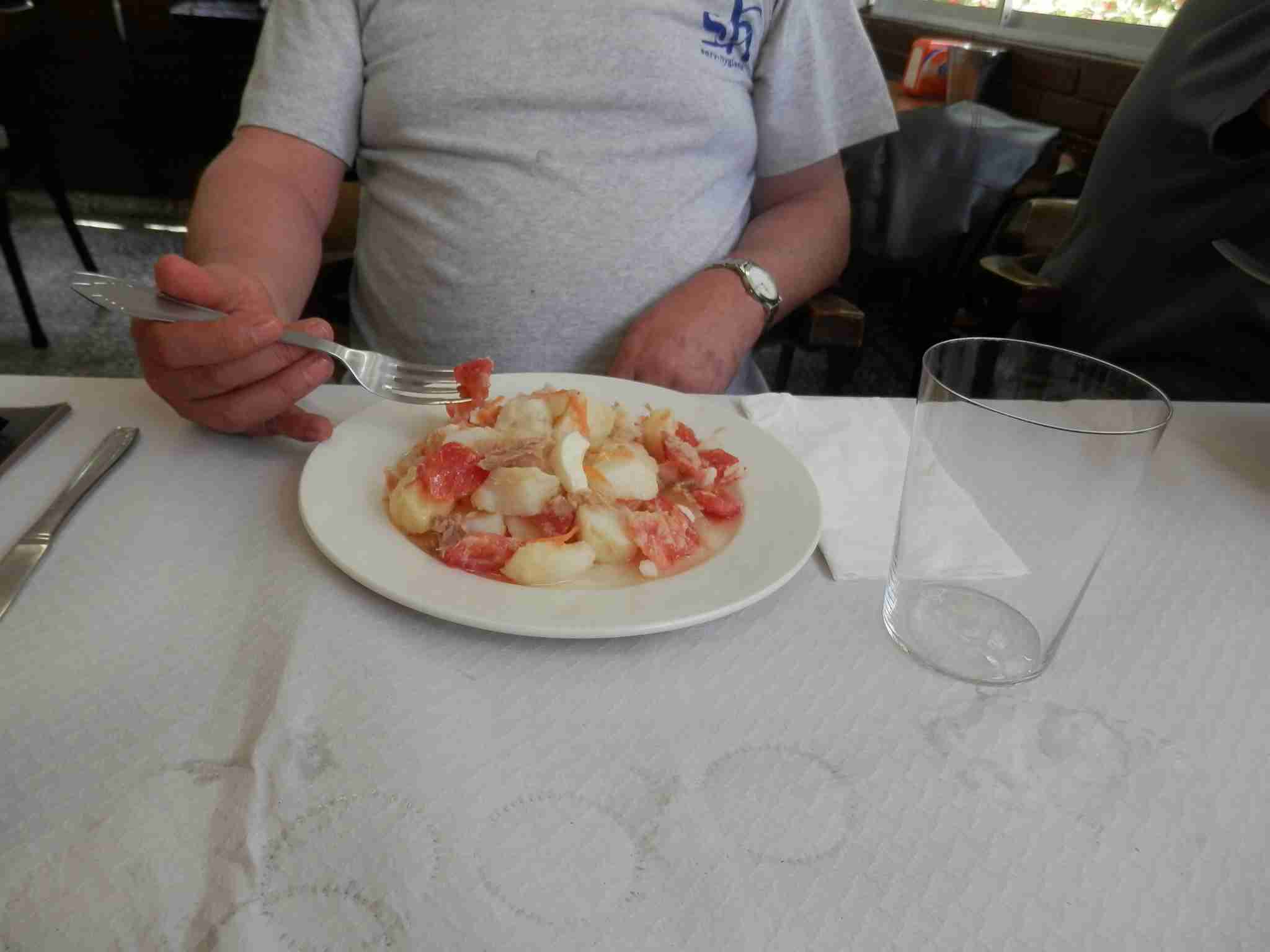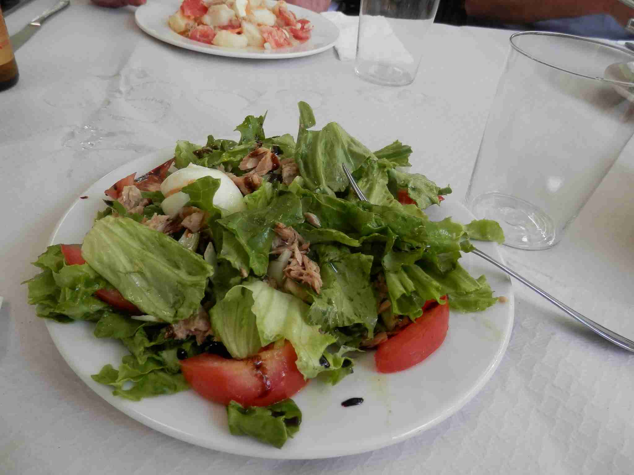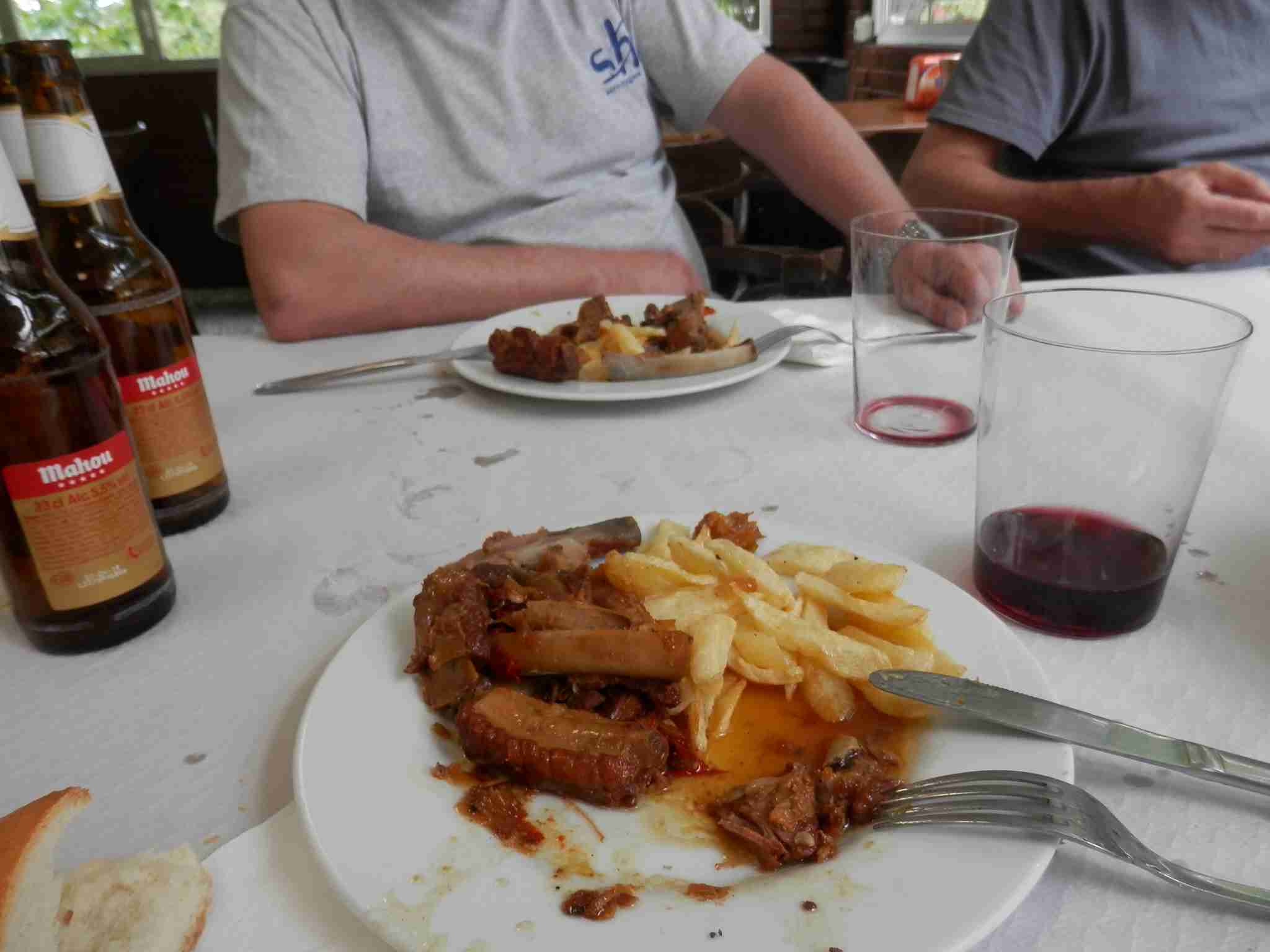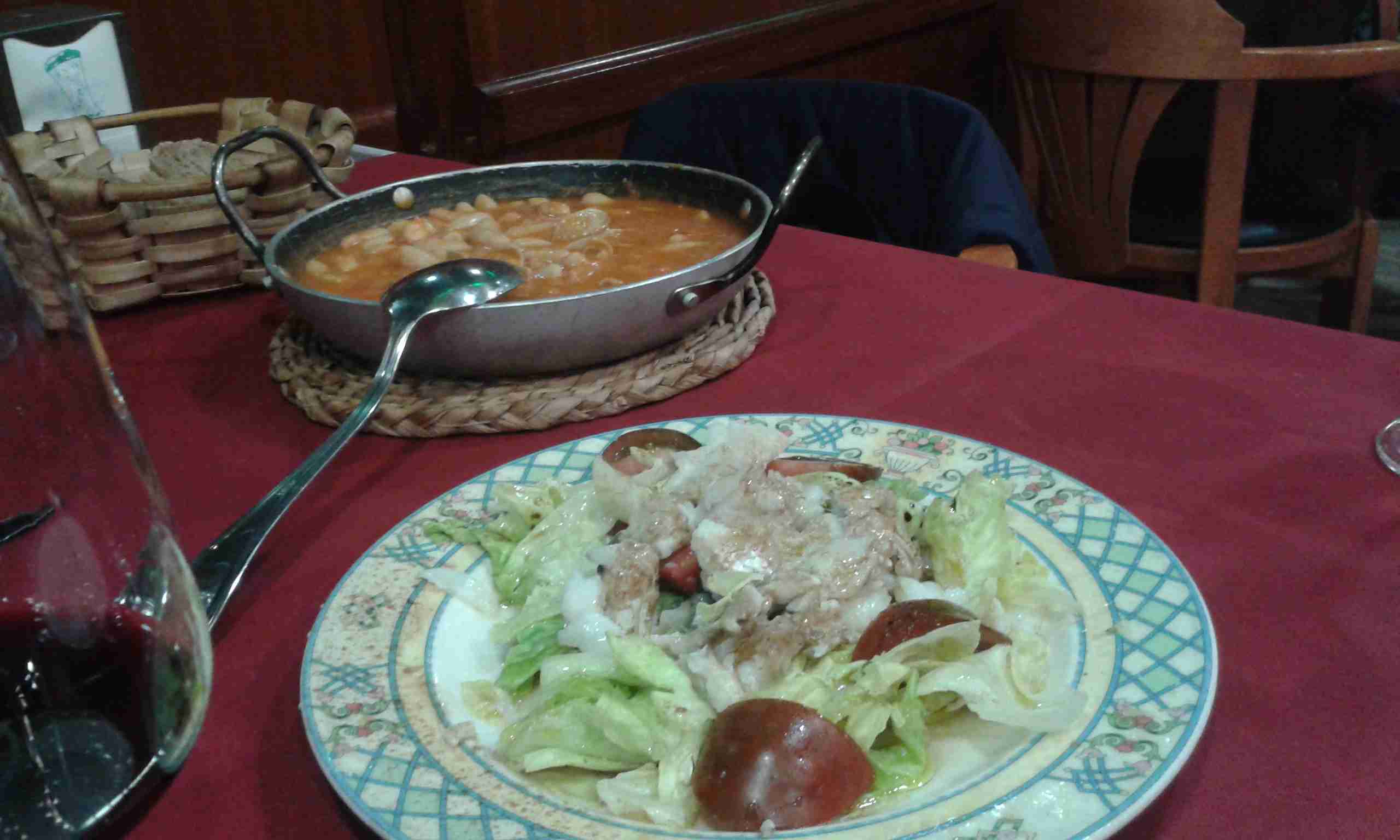 El día ha clareado y hace buenísimo. Ya en Larache, encontramos el bar-restaurante Aurina, donde paramos a comer. De primero, Ángel un cocido de fabes y patatas, Primi y yo una ensalada; de segundo los tres costillas. Con vino y demás nos sale a 12,50 euros por cabeza.
