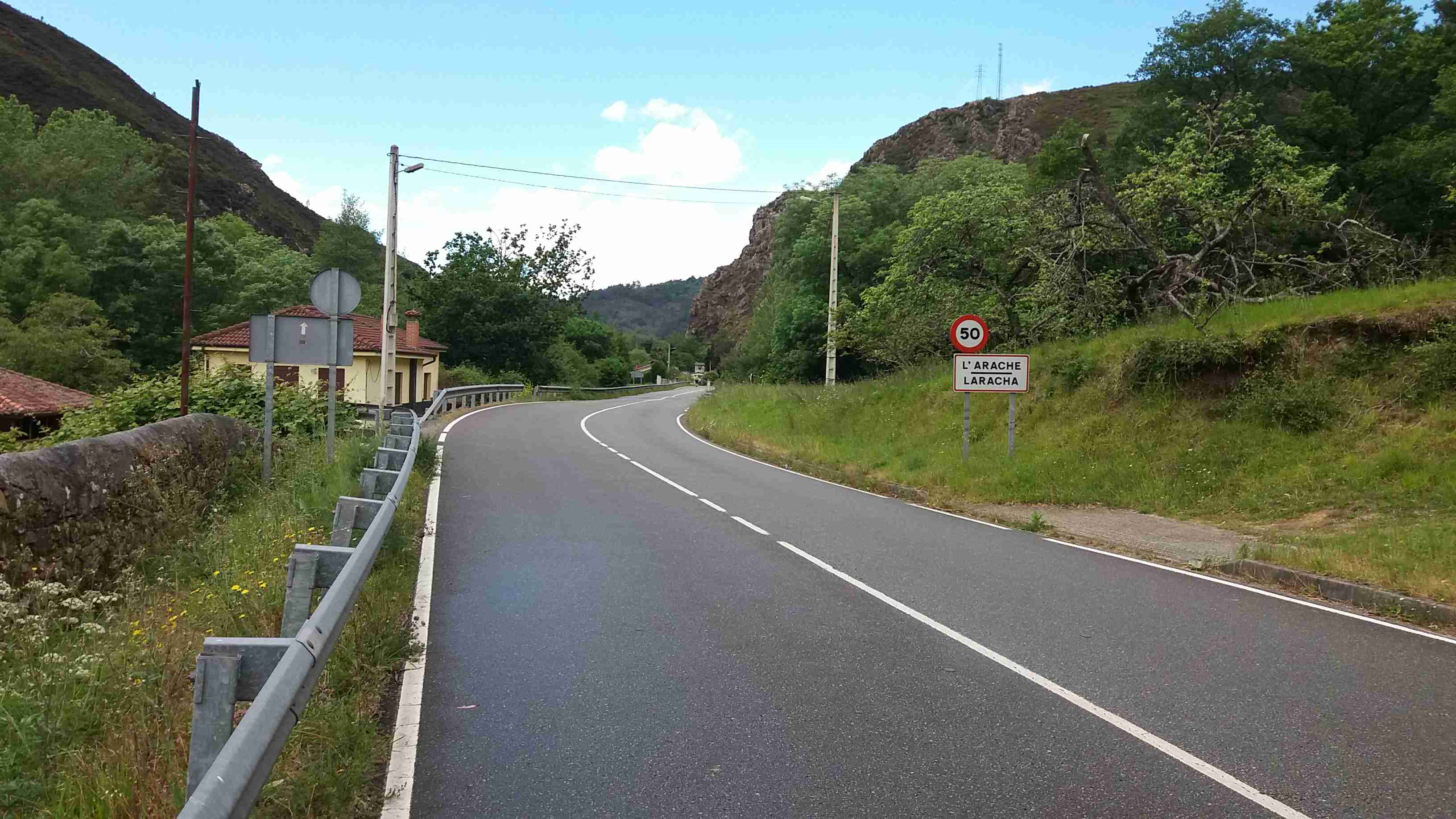 Una senda de ribera, cruzando la pasarela de las Xanas, nos lleva hasta la AS-234. Prestando atención a este peligroso tramo de carretera, entramos en L'Arache o Laracha.