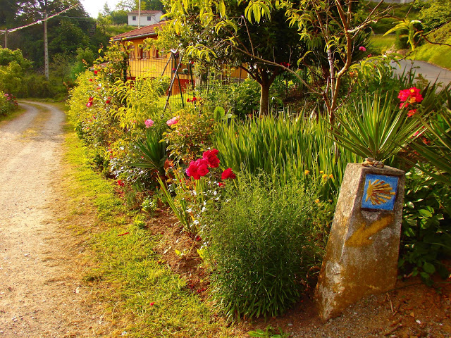 Después de una pequeña siesta en nuestras literas, salimos a dar una vuelta por la población. La lluvia continúa, incansable, por lo que tenemos que llevar nuestros paraguas. Se ven preciosos palacetes indianos con pinturas espectaculares. Tomamos unas cervezas en un bar en la plaza del Ayuntamiento. Conocemos a Brigitte peregrina irlandesa que ya va por su cuarto camino. Estamos un rato charlando con ella.