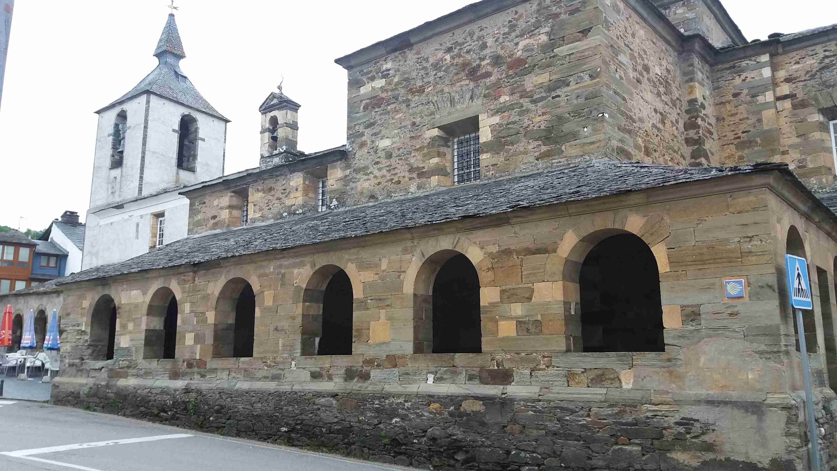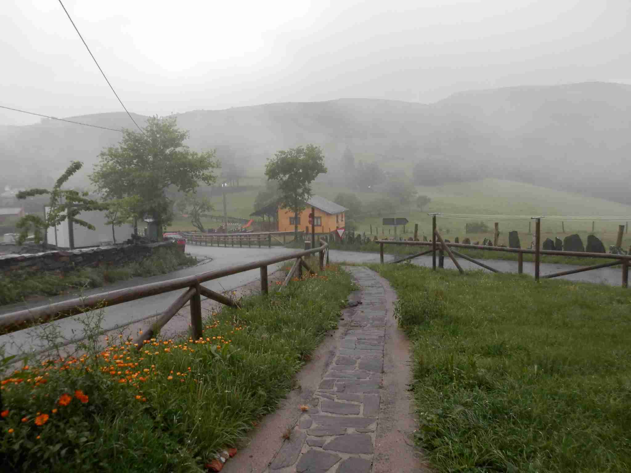 Ángel, que se ha adelantado a Primi, decide continuar por la catretera ante el riesgo de barros por las lluvias. Un km más y la carretera se acaba en un caserío con dos mastines que dan miedo. Sale un hombre y después de dar una patada a los perros le dice que la carretera se termina allí y que no sigue hasta Grandas. Detrás de él venía una peregrina alemana llamada Sabine, que no entendía muy bien lo que pasaba. Ángel se lo explica y dan la vuelta en un km cuesta arriba. Cuando estan llegando al desvío un aldeano les llama. Ángel le hace caso y Sabine detrás también. Llegan a su casa y atraviesan una cuadra, que era un atajo para retomar el camino. Así lo hacen y continuan el descenso por un terreno pizarroso.