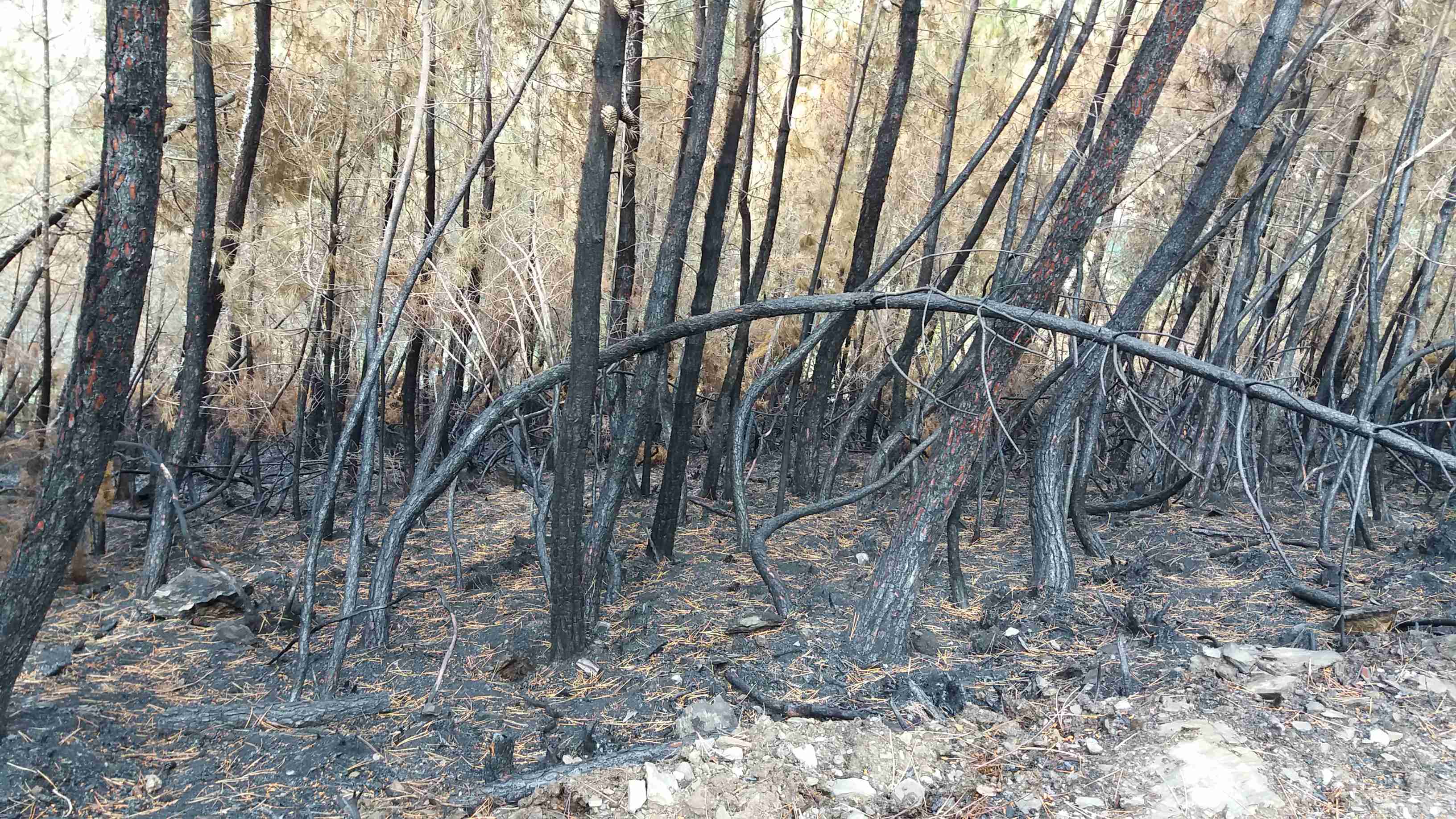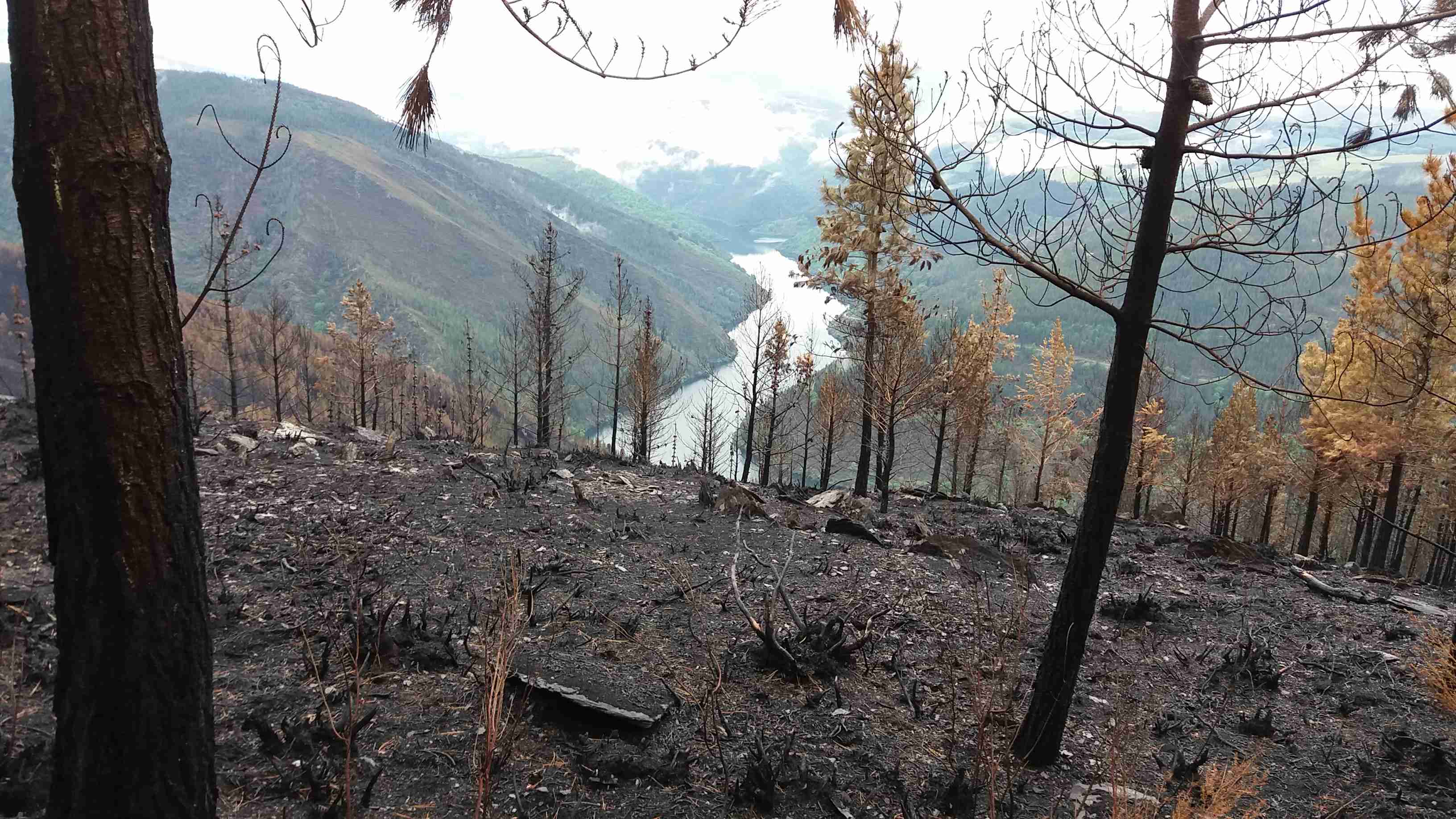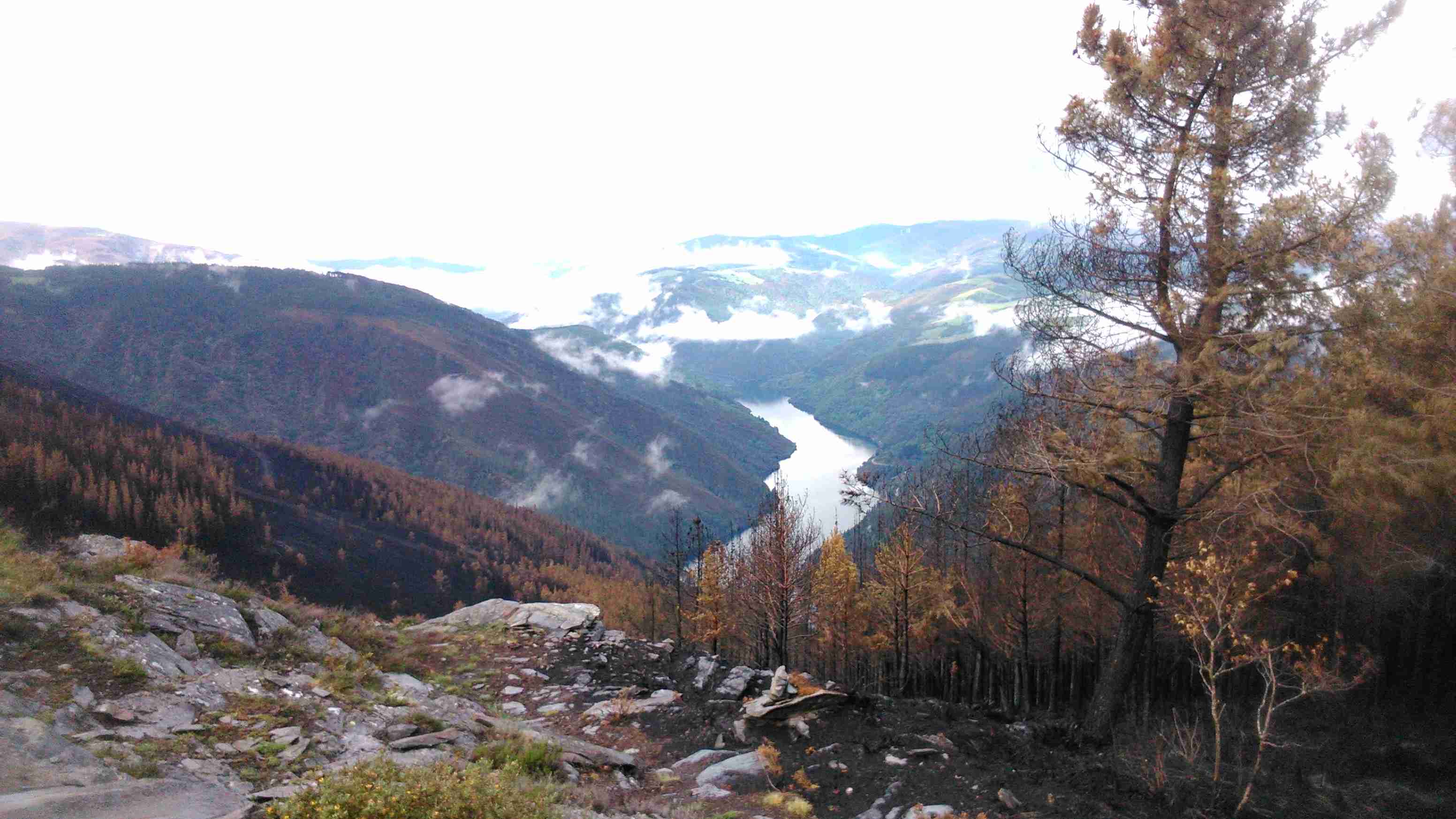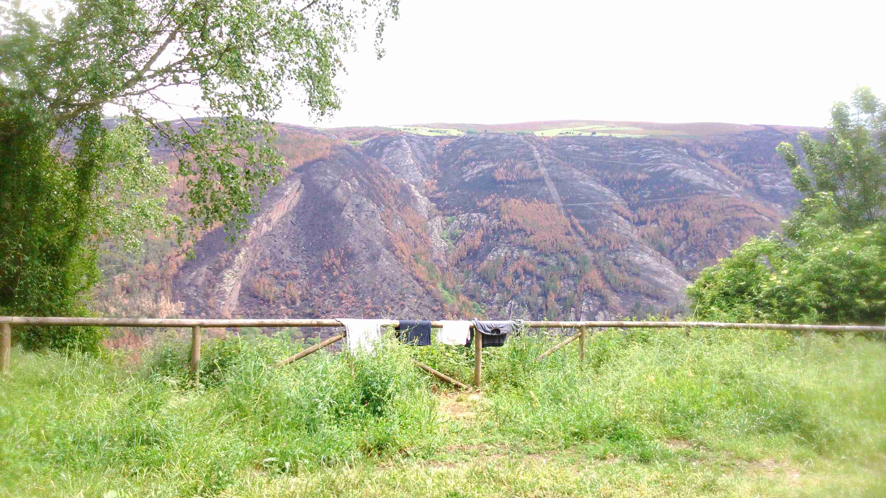 Poco después llegamos a la zona de bosque que se había quemado el pasado mes de abril. El panorama era desolador. Dos horas de descenso entre pinos quemados hasta llegar al embalse de Grandas de Salime sin opciones de parar.