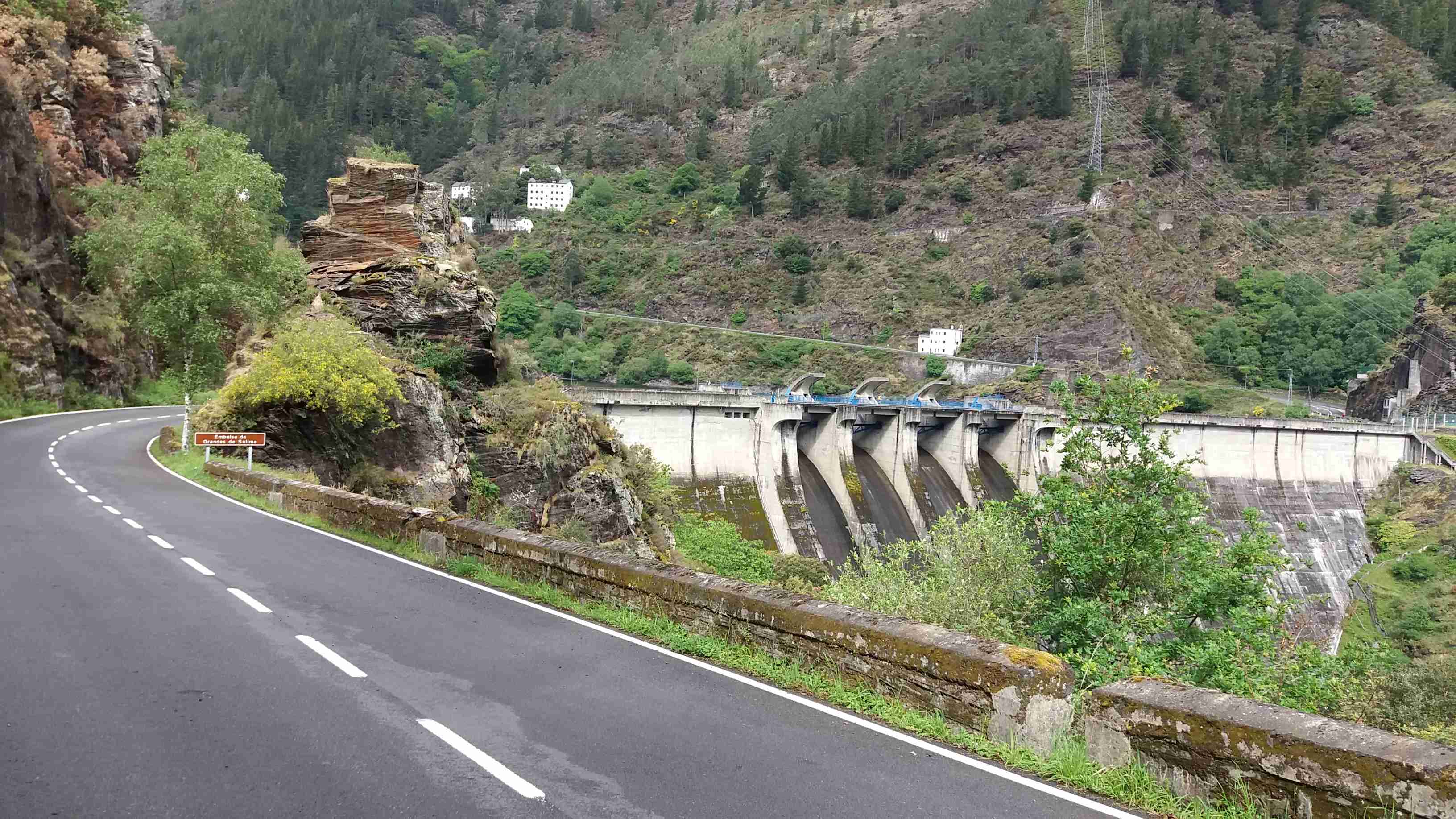 A partir de aquí la carretera sigue en ascenso hasta Grandas de Salime. Hace mucho calor y, como llevo parte de la ropa mojada, en una breve parada, preparo un tenderete con camisetas, pantalones y calcetines por si algo se secaban al sol.