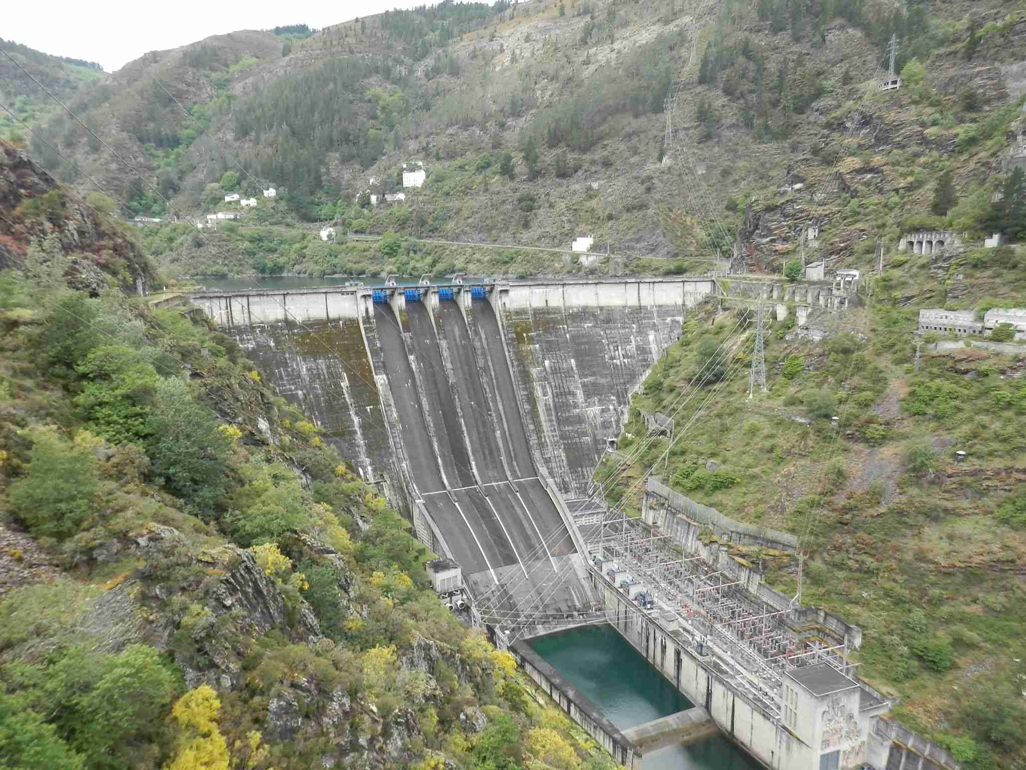 Javier y "el artista" se han adelantado y ahora camino sólo, con mucha lentitud, pues las rodillas se resienten por el largo descenso. Algunos peregrinos me adelantan. En un recodo encuentro a una peregrina sentada observando el gran desastre de los pinos quemados. Se llama Leonis y es alemana. Caminamos juntos un rato aunque pronto se queda atrás. Por fín llego al muro del embalse. Se ven muchos peregrinos.