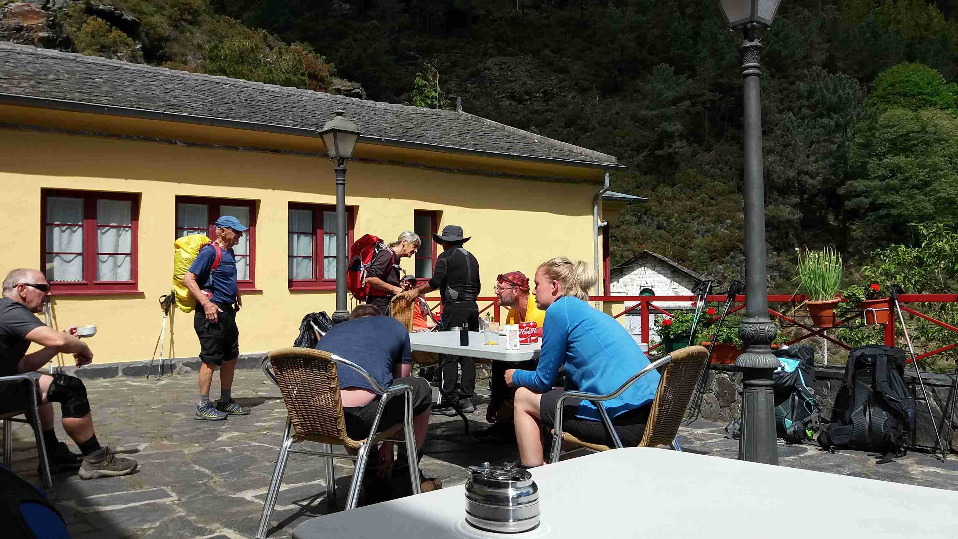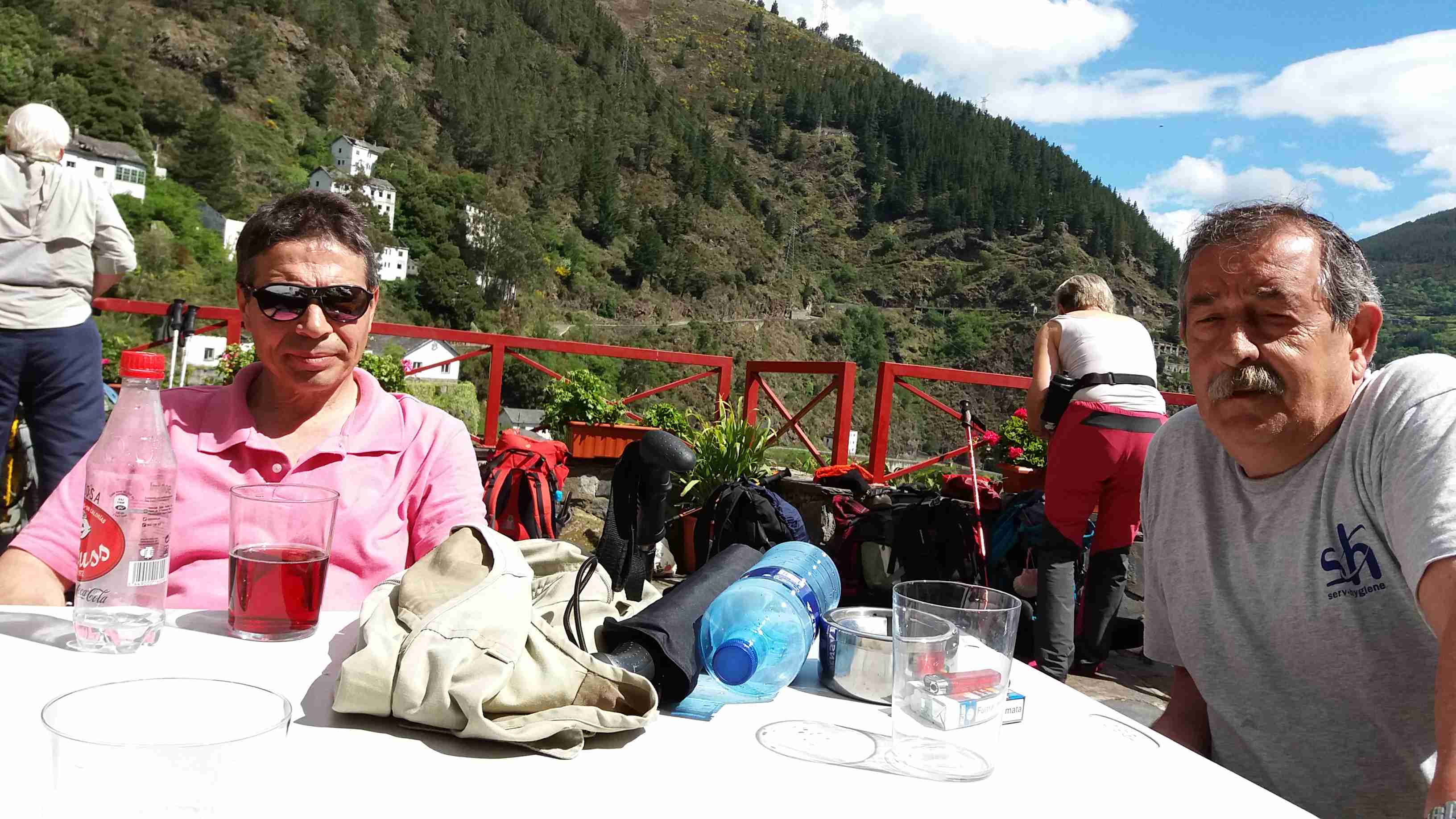 Pasado el muro del embalse comienza un nuevo ascenso que, animados por la vista de un bar, recorremos rapidamente. Es el Mirador del Pantano. Ángel y Primi me están esperando. Allí estuvimos hora y media ya que había salido el sol y se producía concentración de peregrinos (los suizos RoseMary y su marido, los 4 americanos, las italianas, etc).