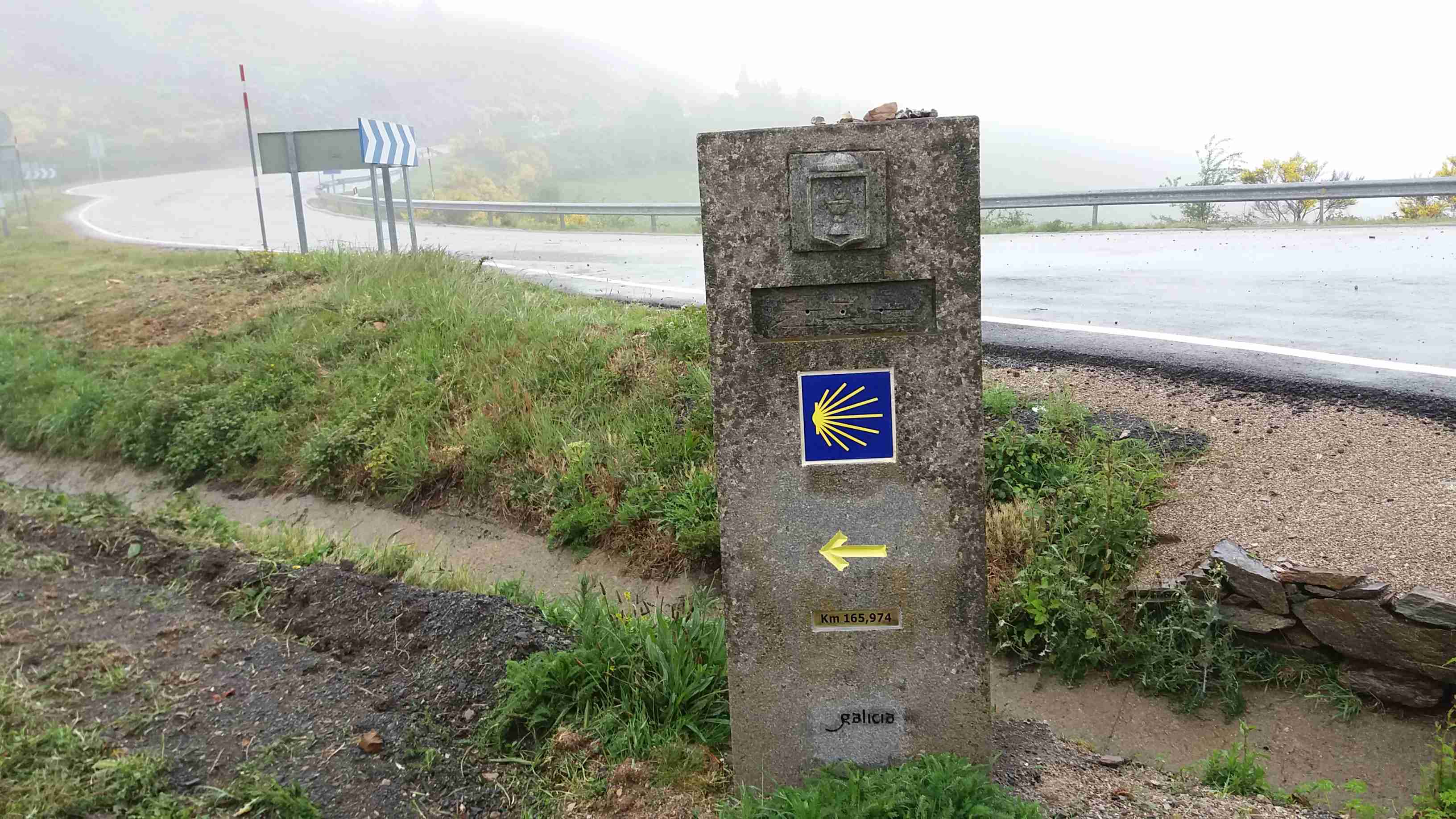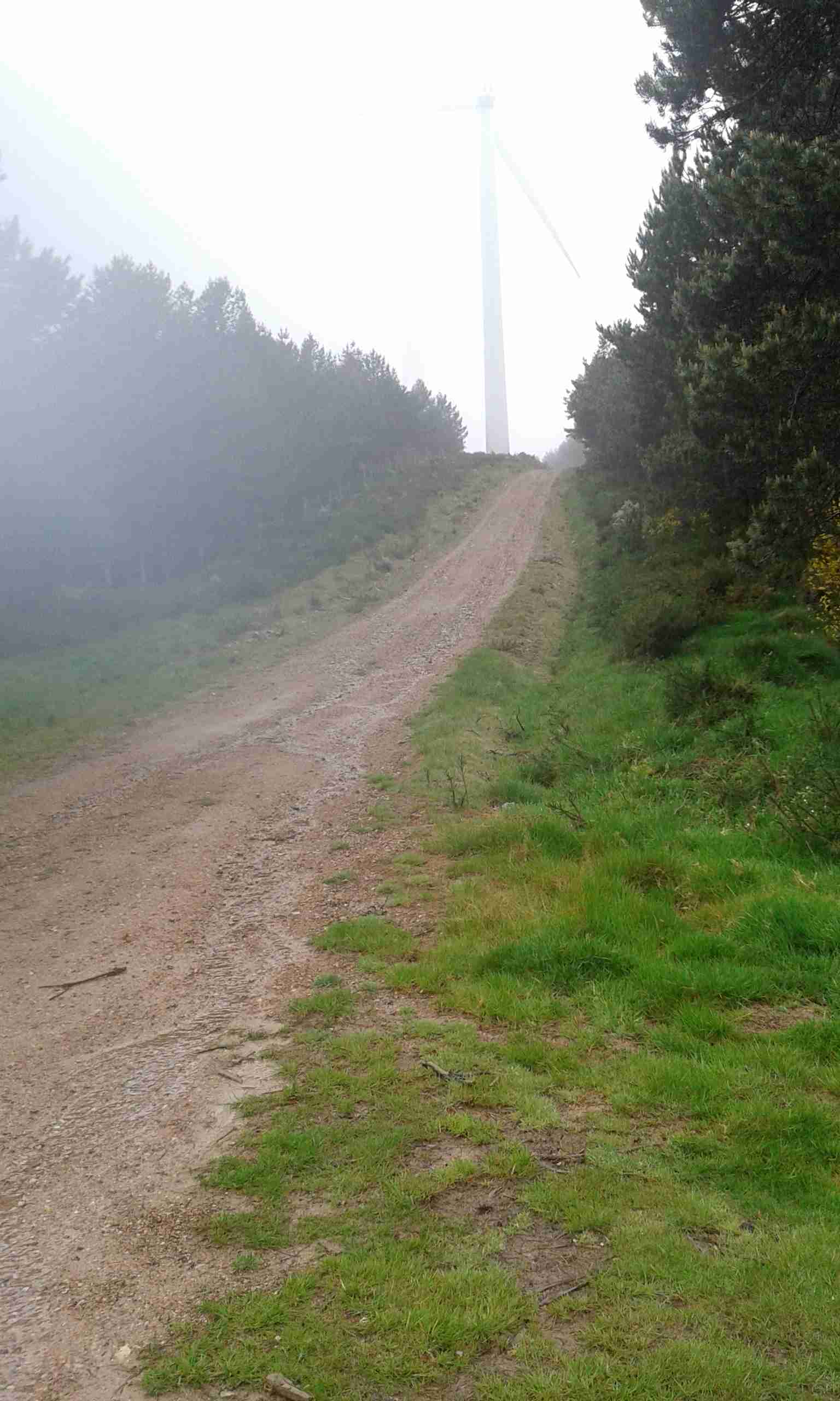 Después del breve descanso, Primi y yo nos separamos. Él se va por la vereda del Camino mientras yo vuelvo a la carretera, pues pienso que el Camino podía estar bastante embarrado. Ahora llueve con menos intensidad. Sin ver a nadie, voy dejando atrás los molinos de viento. Cuando llego a la cima, 1.130 metros de altitud, al no encontrar a nadie, llamo a Primi con el móvil. Estoy en el punto más alto, lugar que coincide con la delimitación geográfica de Asturias y Galicia, entrando en la provincia de Lugo.