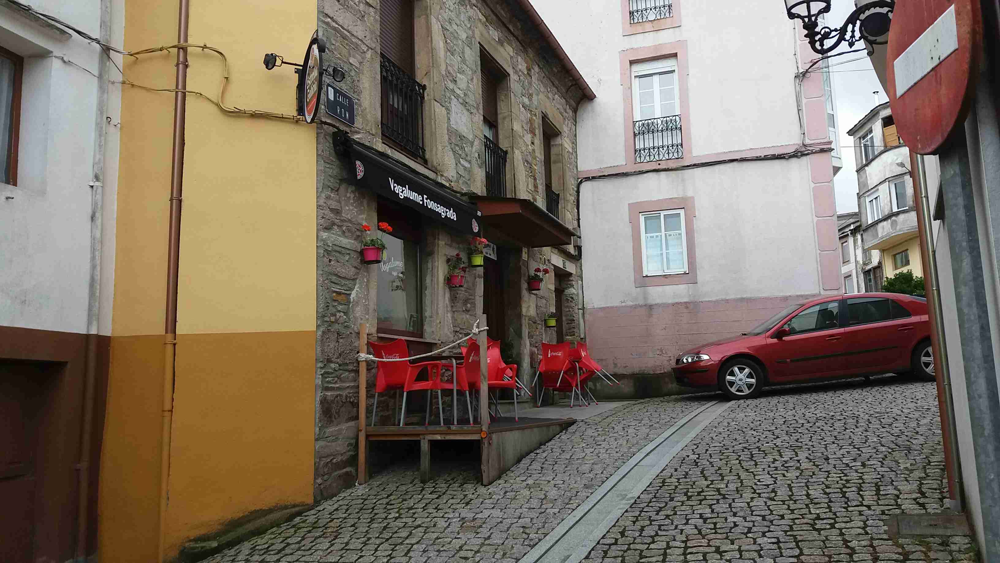Muy cerca del albergue hay un bar que se llama Vagalume que a Ángel le resultó chocante debido a la coincidencia de nombre con uno de Madrid de la calle Ponzano; le preguntó a la camarera que de donde venía ese nombre y le comentó que "vagalume" es una palabra en gallego qué significa "luciérnaga". Además tenía allí vino del Pago de Carraovejas que lo vendía a 33 euros la botella de crianza. Estuvo allí un buen rato comentando estas historietas con un transportista que llegó a dejar un pedido hasta que, por fin, nos juntamos Primi y yo con él.