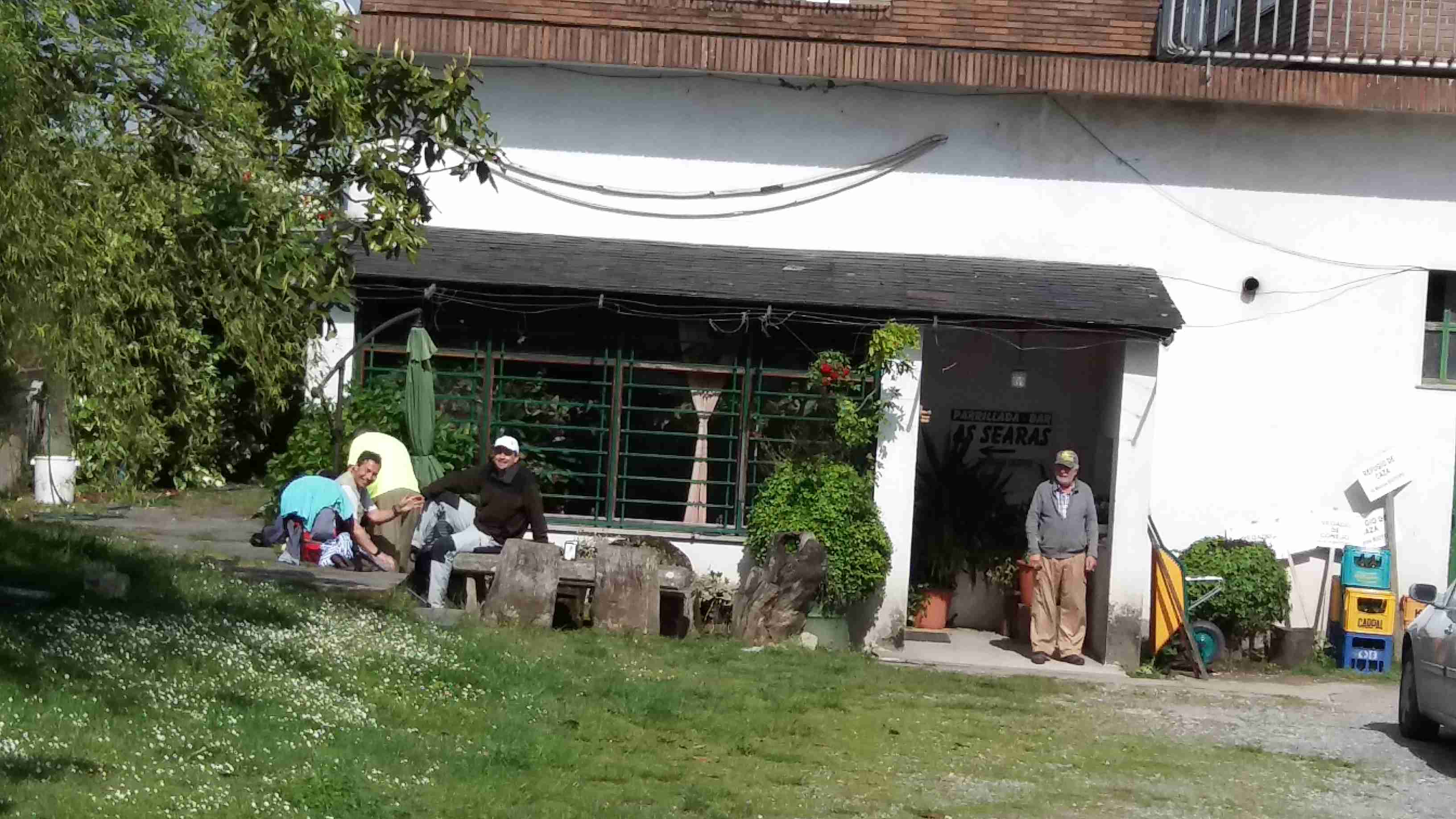 Saludamos a Javier que anda buscando un grupo de peregrinos amigos suyos y continuamos nuestra lenta ascensión por el asfalto. Cruzamos Seoane, población sin servicios y llegamos hasta San Vicente do Burgo, donde efectuamos una larga parada, descansando sentados al sol, en la Parrillada Bar As Searas. Es un lugar idóneo para reponer fuerzas, descansar y tomar un bocadillo, empanada o tortilla y las correspondientes cervezas. Estamos a unos 10 kms de Lugo.