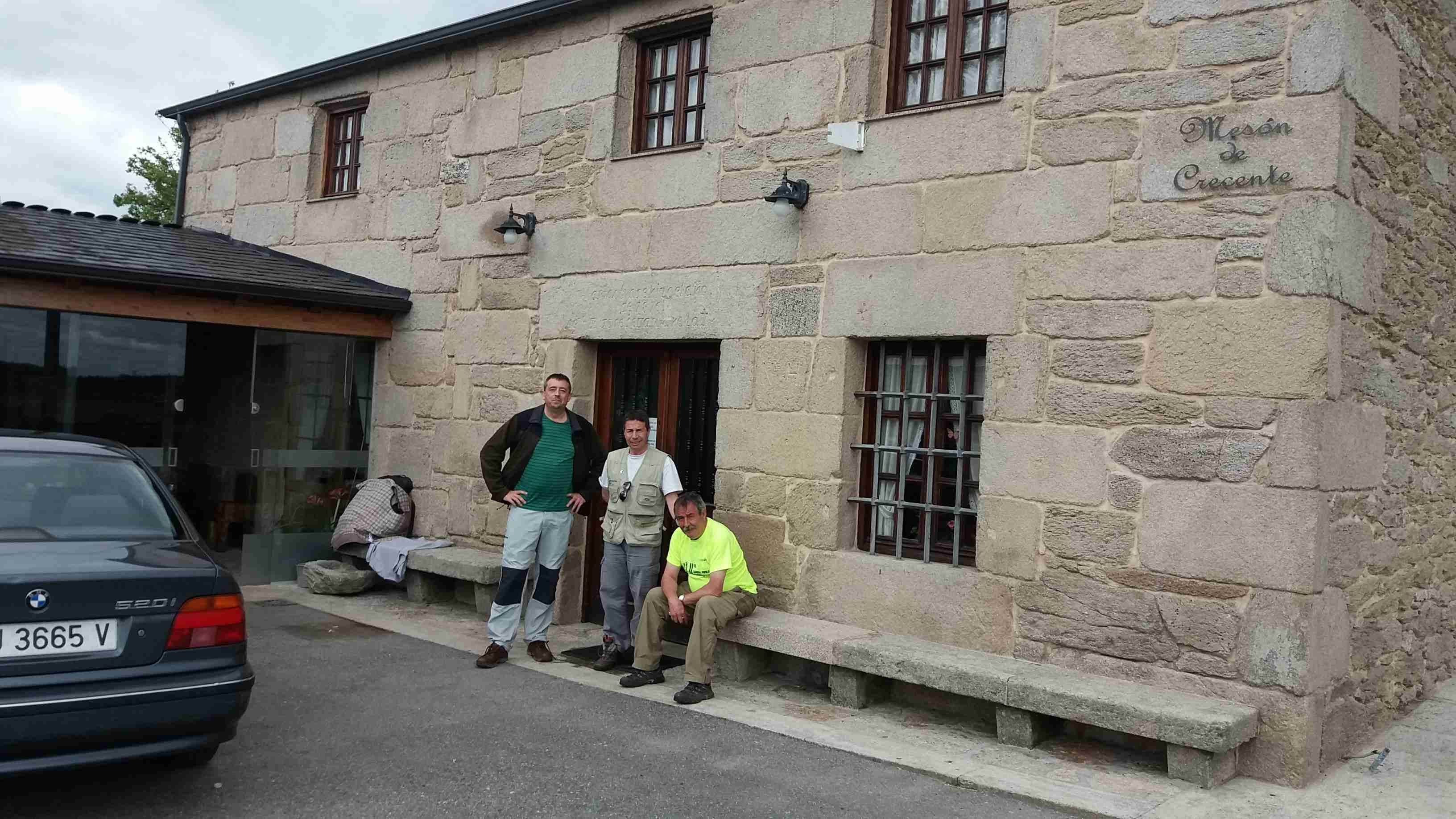Ángel nos manda un whatsapp donde dice que sigamos hasta el desvío del Mesón Crecente, que está a unos 100 metros, y donde se ha acercado él. Allí podemos comer, pues según él, olía a un guiso estupendo. Enseguida pago la cerveza y me acerco al Mesón. Poco después llegan Primi y Luís, sedientos por el calor. Preguntamos si podíamos comer y nos dijeron que sí, pero que entre la una y media y las dos y media, porque a partir de esa hora tenían reservado el comedor completo. Parecía mentira porque era una casa bastante rehabilitada en medio del campo y no había gente por allí pero, efectivamente, a la una y media estábamos sentados en la