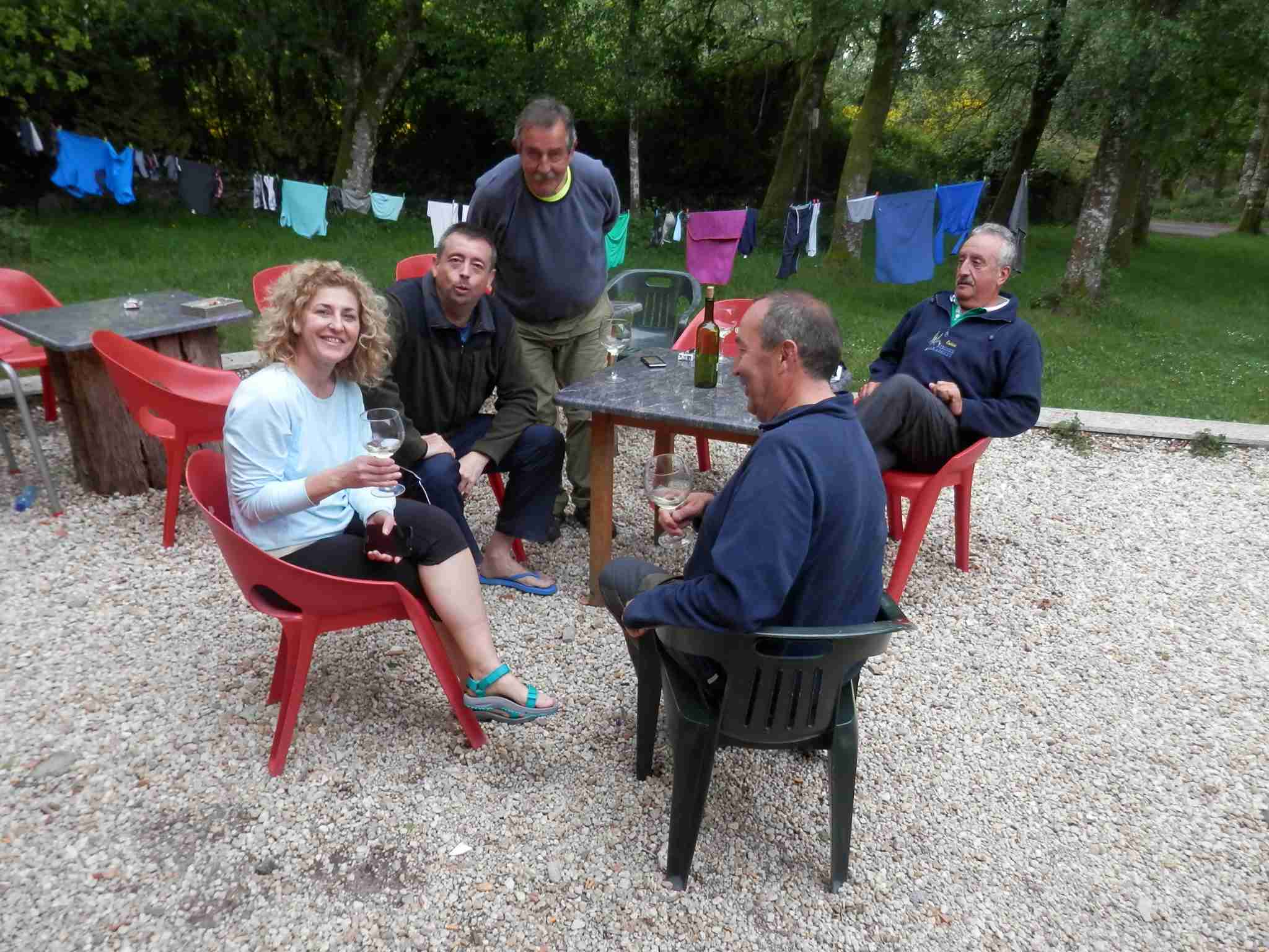 Después de acoplarnos, duchas y demás, Ángel se fue a dar una vuelta hasta la zona de la Iglesia donde había un pequeño bar, mientras nosotros nos sentamos en la agradable terraza acompañados por otros peregrinos. Tomamos algunas botellitas de vino blanco a 2,50 euros cada una.