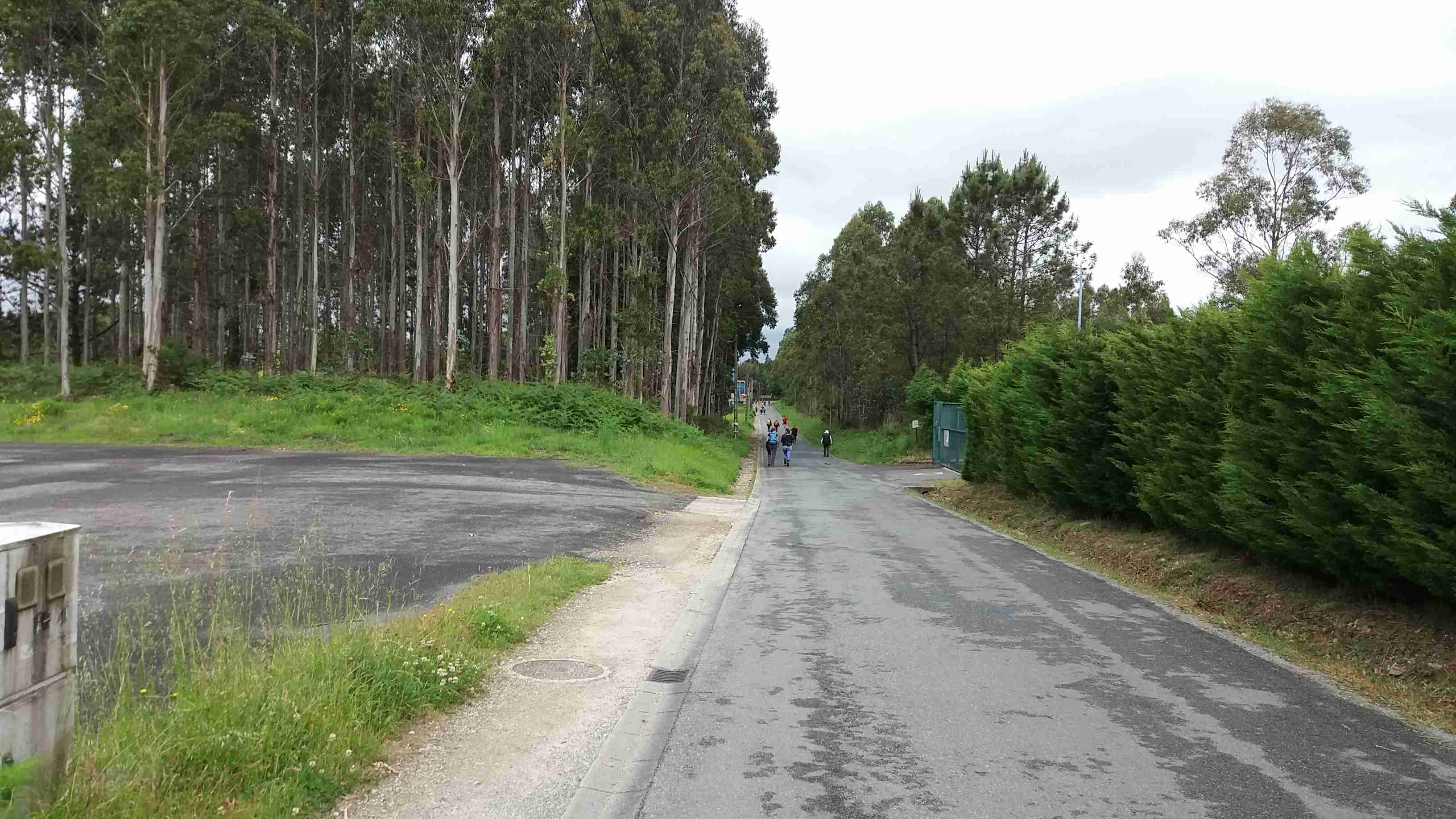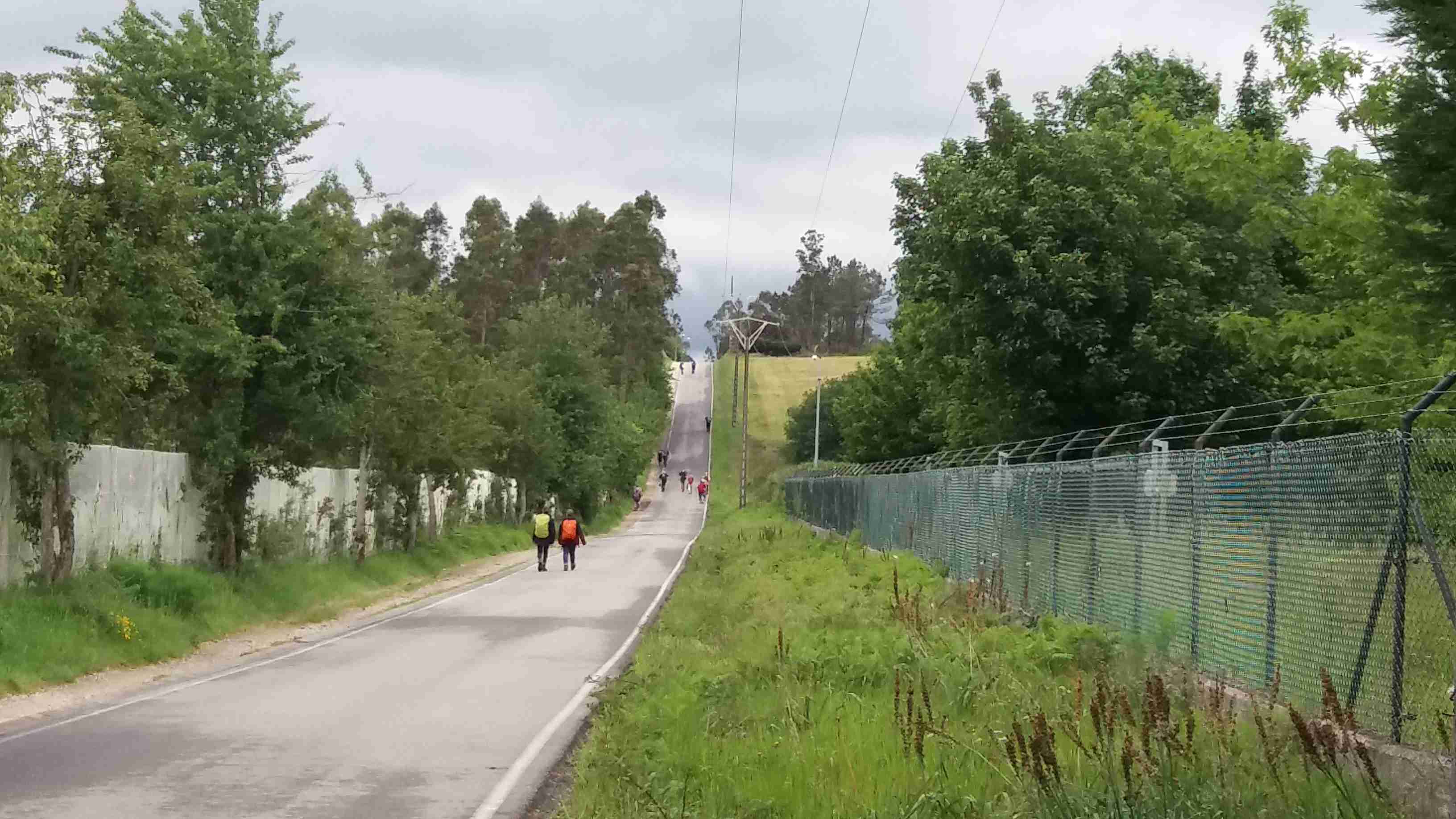 Salimos dispersados de O Pedrouzo. Cuando salgo a desayunar mis compañeros ya se han ido. Llueve bastante. Decido ir por la carretera en lugar de cruzar por los montes de eucaliptus y carballos. Veo a mi derecha largas hileras de peregrinos que descienden del monte hacia San Paio. El camino por la carretera es mucho más llano. Camino solo. Ha dejado de llover.