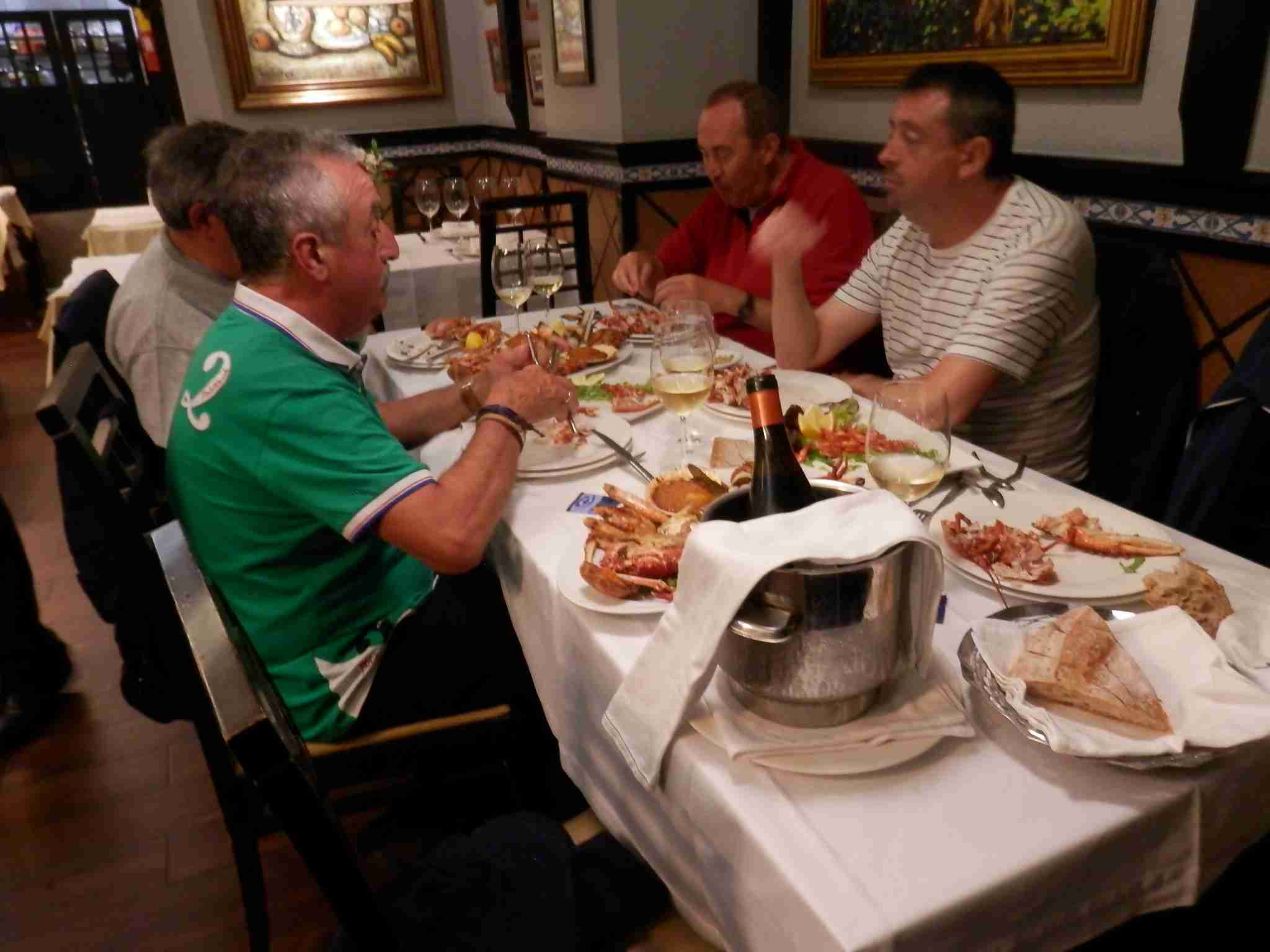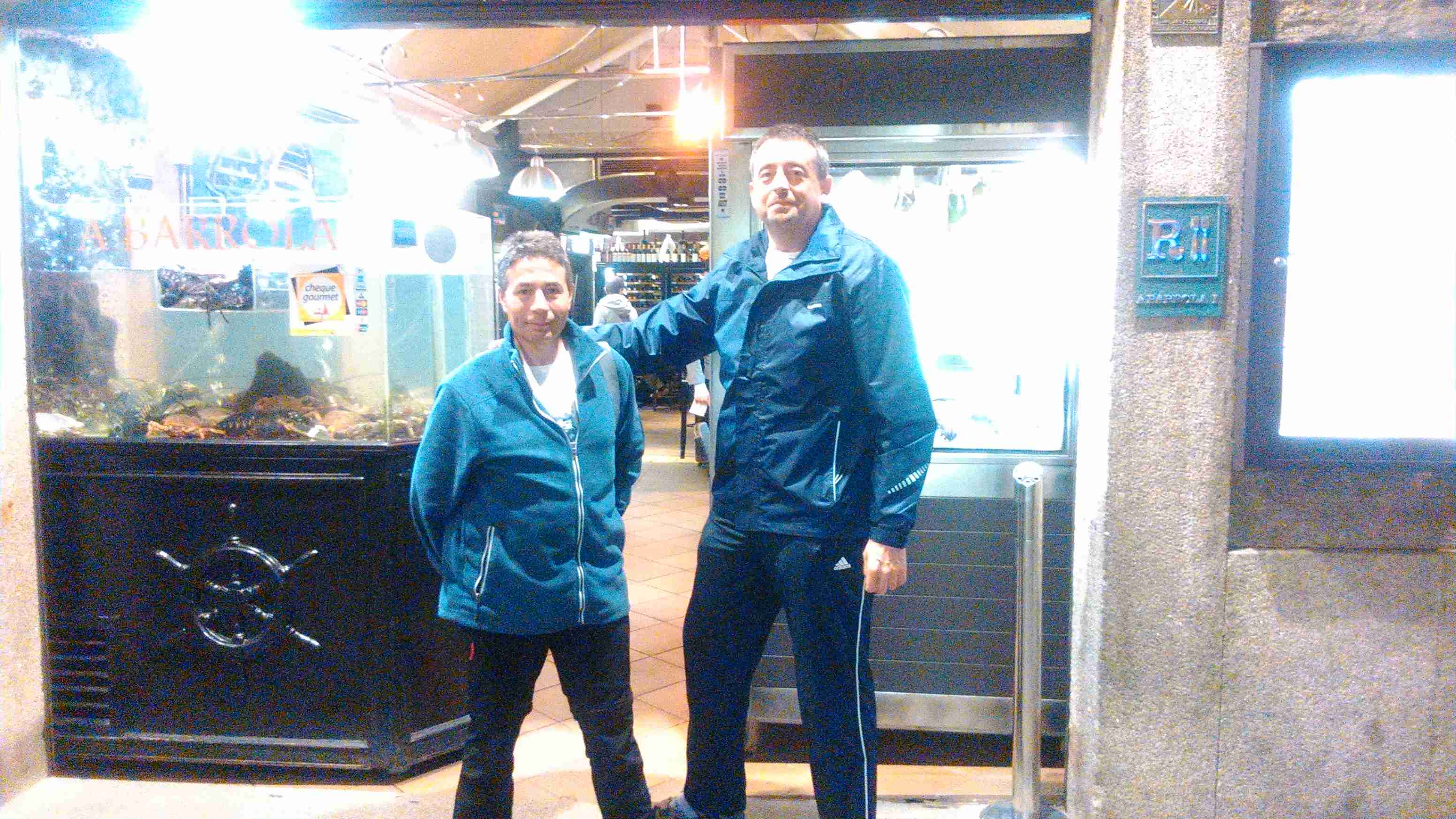 Les comentamos que tenemos intención de cenar una mariscada para celebrar nuestra llegada a Santiago para la que pondríamos 50 euros cada uno. Javier se apunta rapidamente. Nos vamos los cinco a buscar una marisquería que pronto encontramos en el Restaurante Marisquería A Barrola, en la Rua do Franco, y nos metemos una mariscada de lujo.