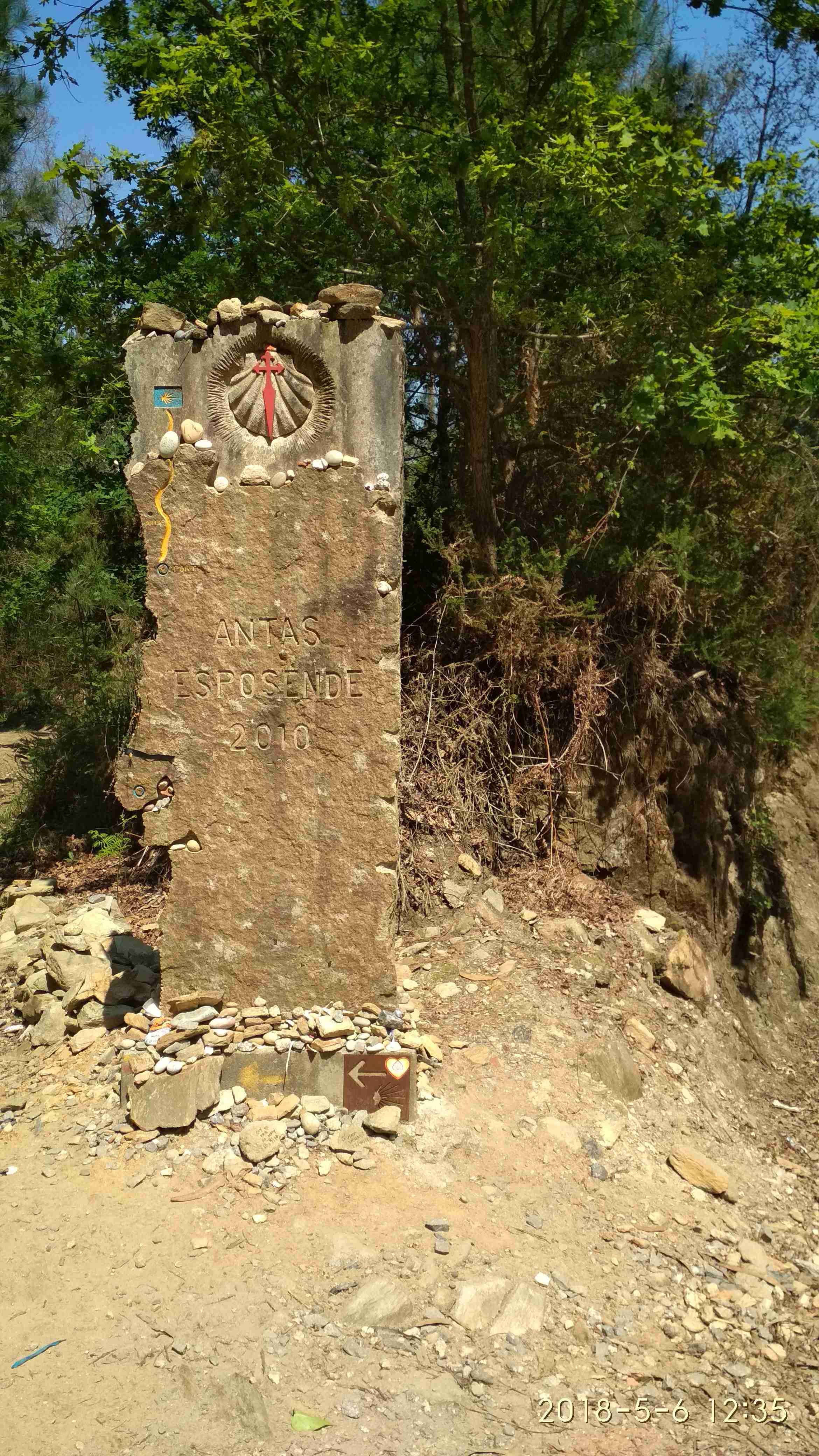 A unos seis kilómetros llegamos a Antas donde vemos una piedra inaugurada en 2010 que marca el Camino de la Costa.