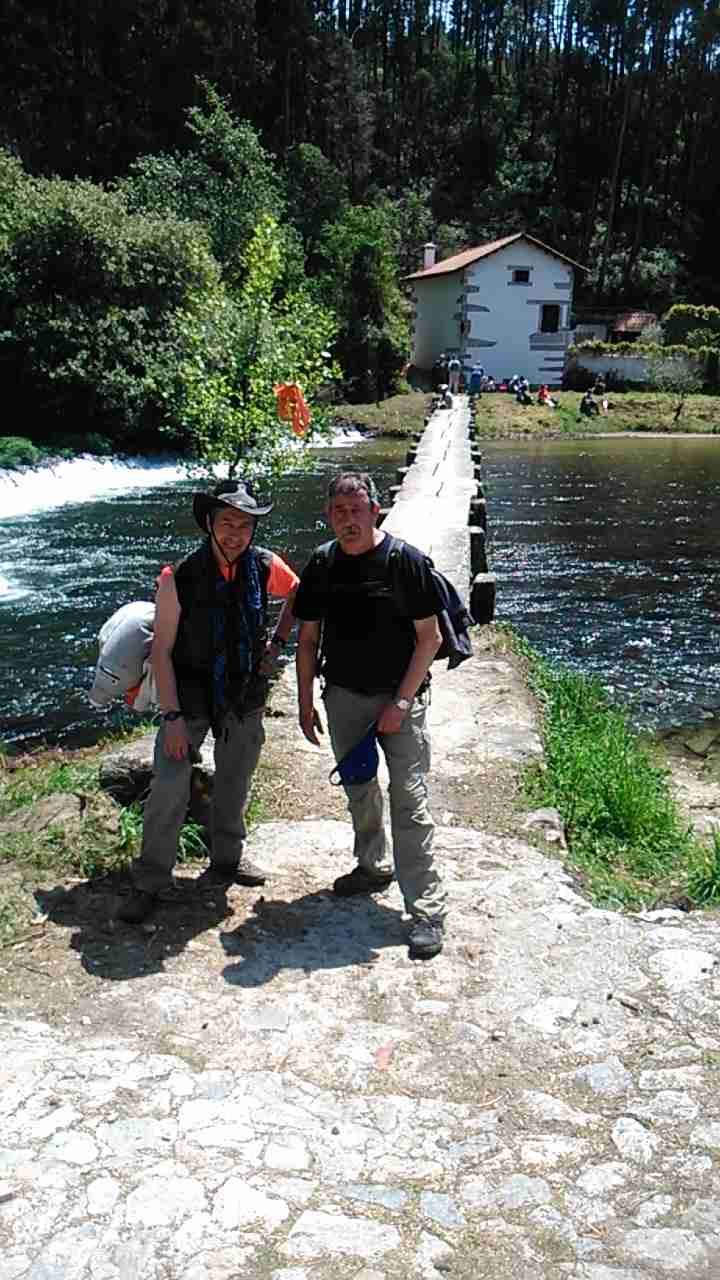 Puestos en marcha nuevamente localizamos las famosas flechas del camino, no sin antes darnos una buena caminata por las calles del pueblo (no teníamos que haber abandonado la carretera). En esto estábamos cuando volvimos a ver al chico brasileño que conocimos en Vila de Conde. El paso del río Neiva, donde había un grupo de peregrinos almorzando o descansando, por lo general bastante caudaloso, se realiza por una pontella o plataforma de losas de granito, sin barandilla, como debía hacerse ya en épocas romanas y medievales. No es difícil, pues hay anchura suficiente, pero en días de lluvia puede estar resbaladizo. Recomendamos cruzar con decisión y disfrutar del lugar, que es precioso. Cruzado el rio, subimos una larguísima cuesta hasta llegar a la iglesia de Santiago de Castelo do Neiva.