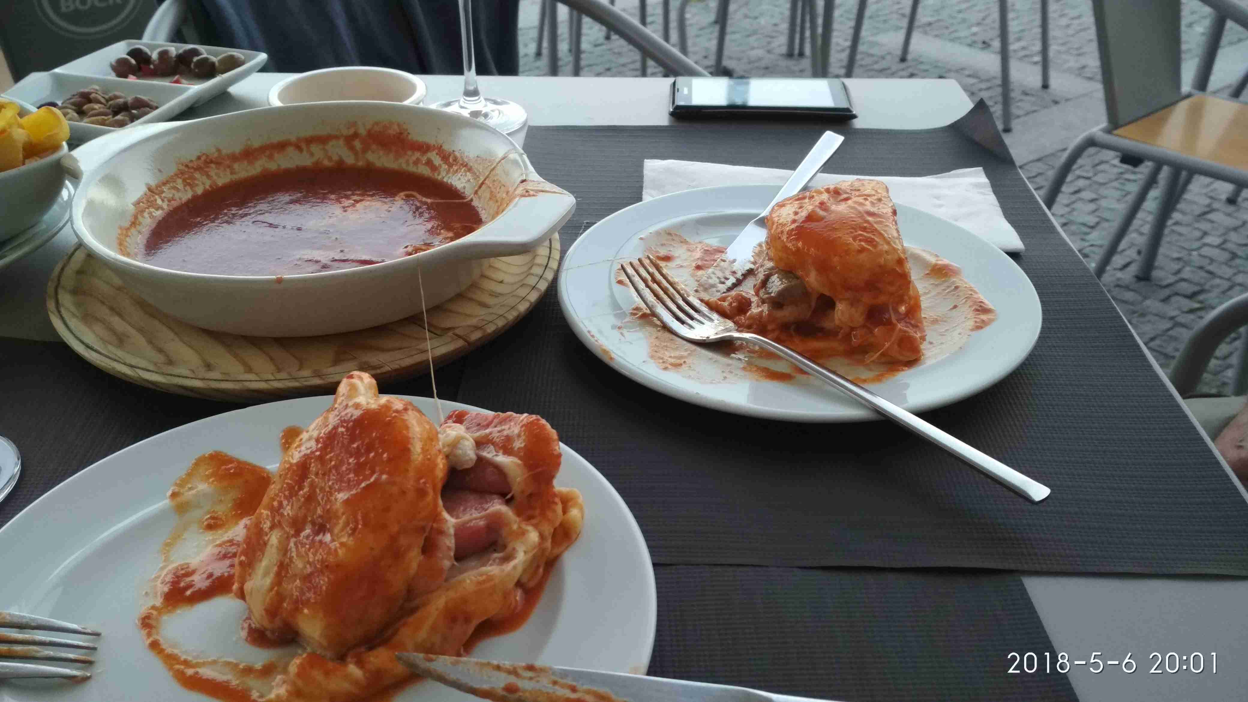 Después de dar una buena vuelta por la población buscamos un restaurante donde poder cenar. Encontramos uno en un parque al lado de la Estatua de la diosa Viana y allí cenamos entre otras cosas el plato típico "Francesinha No Bolo Do Caco".