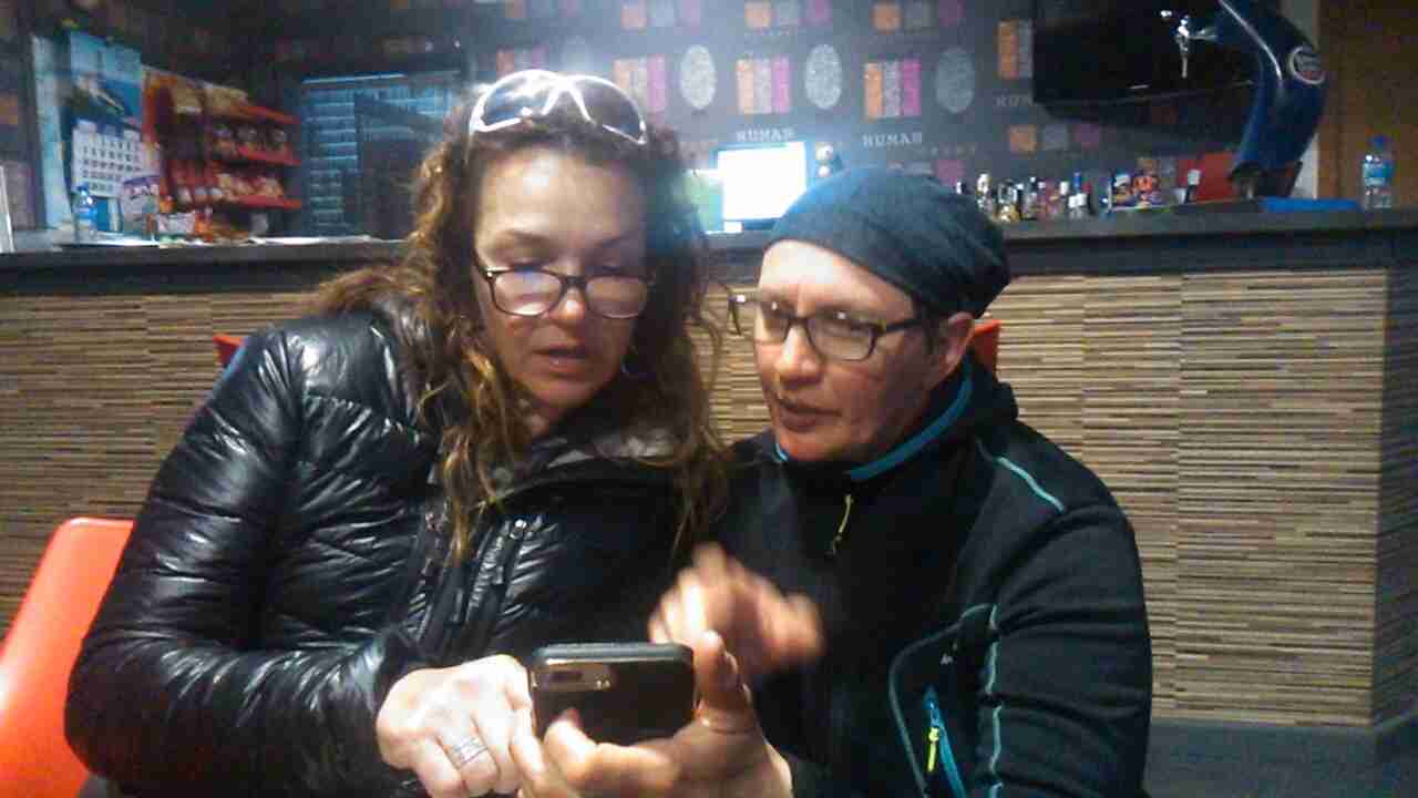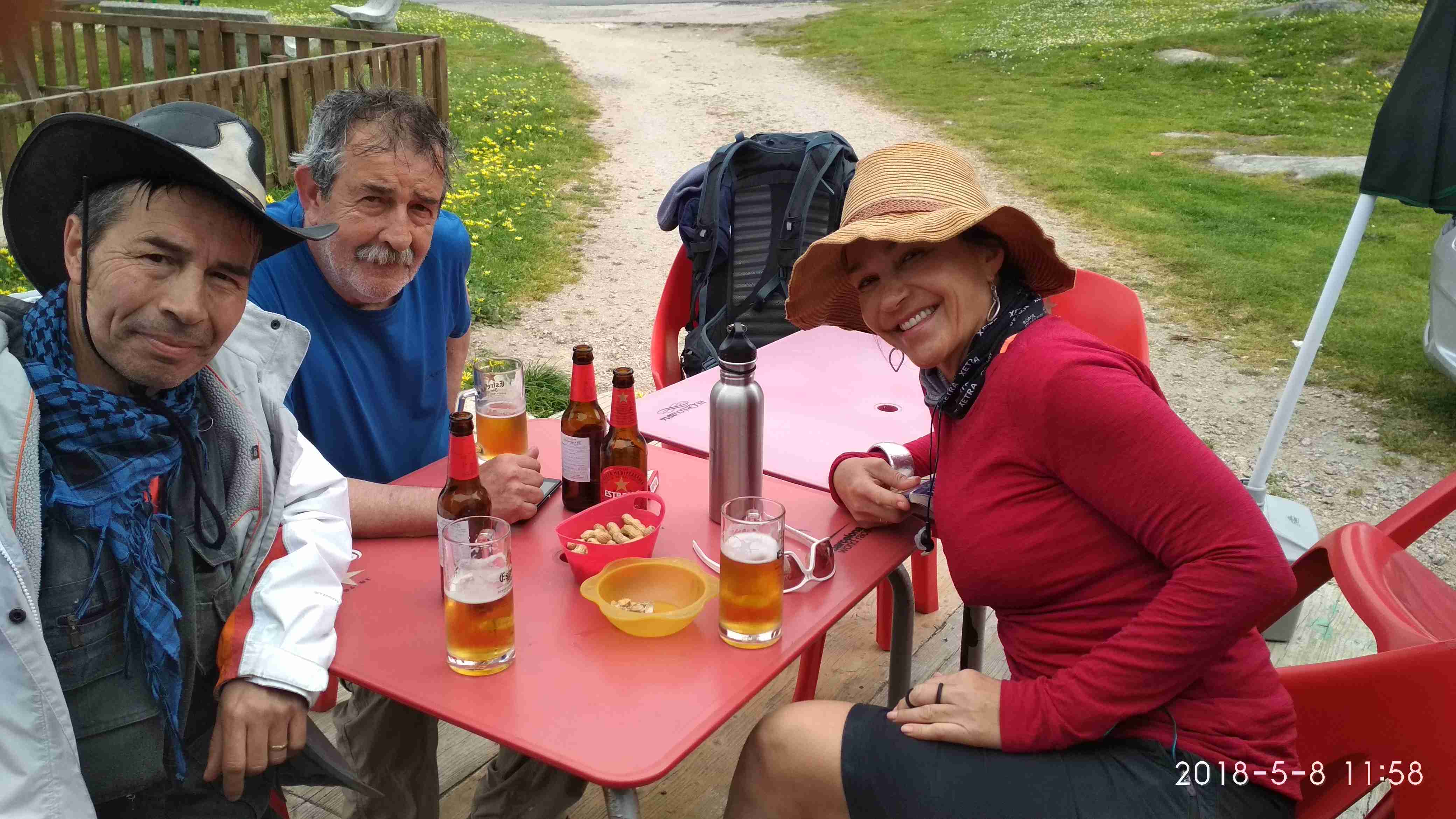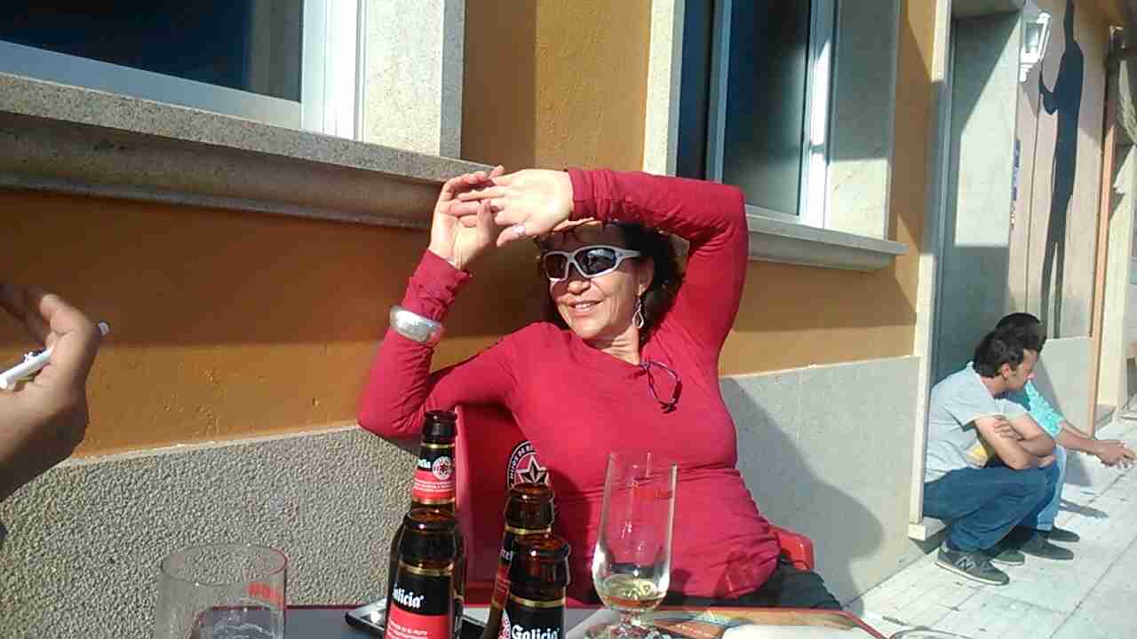 Mientras continuamos por la costa Primi, como tantas otras veces, se va adelantando hasta que llega a una pequeña subida donde ve un letrero de "bar" que resultó ser un pequeño chiringuito, aún por reformar y sin apenas sitio para dos mesas, en las que había un matrimonio descansando. Primi se sienta a esperarnos. Cuando llega Carolyn la invita a tomar algo, a lo que ella acepta. Diez minutos después me uno a ellos. En el descanso, tomamos unas cervezas a la vez que charlamos con la señora del bar, a quien pedimos que nos haga un par de fotos.