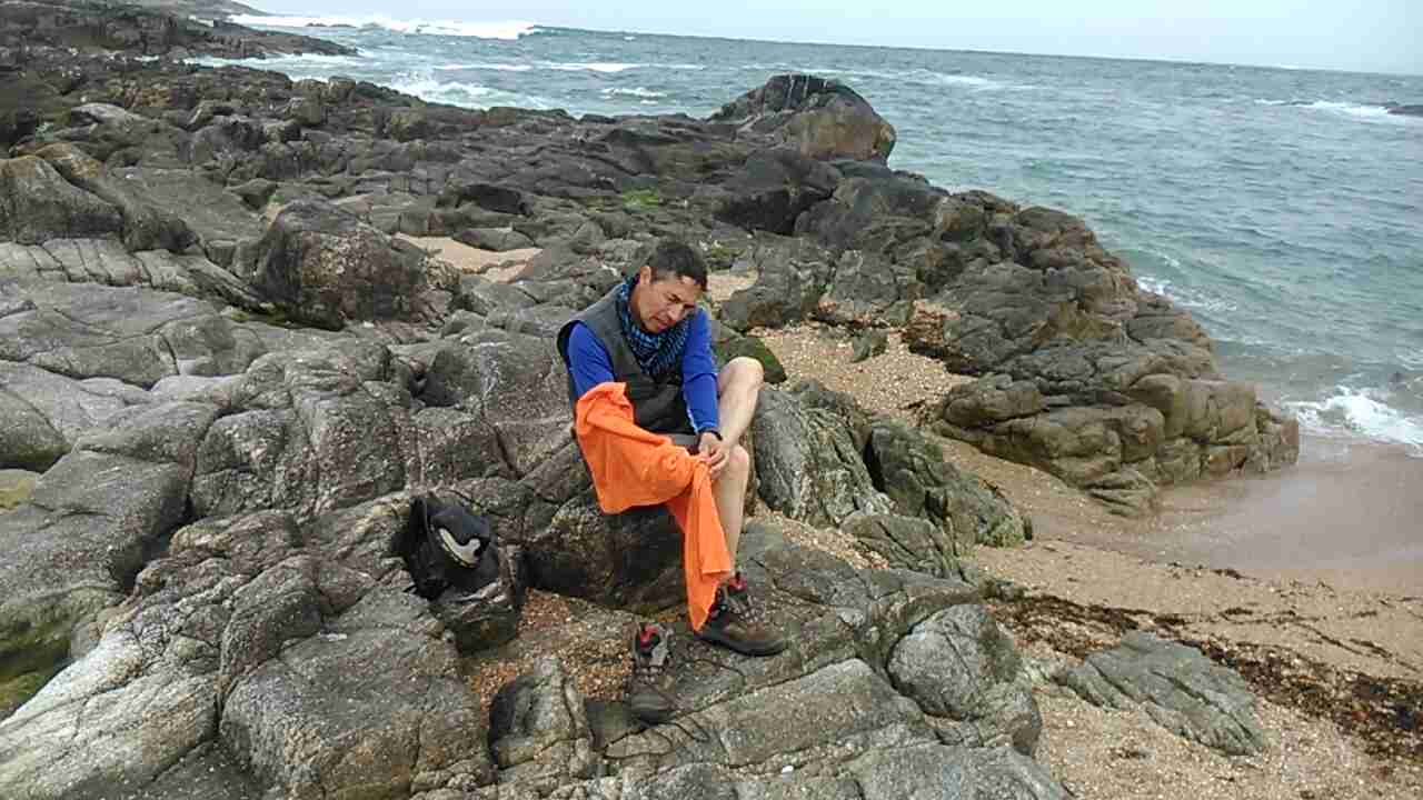 Después de caminar un par de horas, viendo ya a lo lejos Baiona y frente a las Islas Cies, hacemos un alto en unos bancos que encontramos en el mismo camino para degustar las ultimas tabletas energéticas que nos quedaban y saciar la sed con sendas botellas de agua.