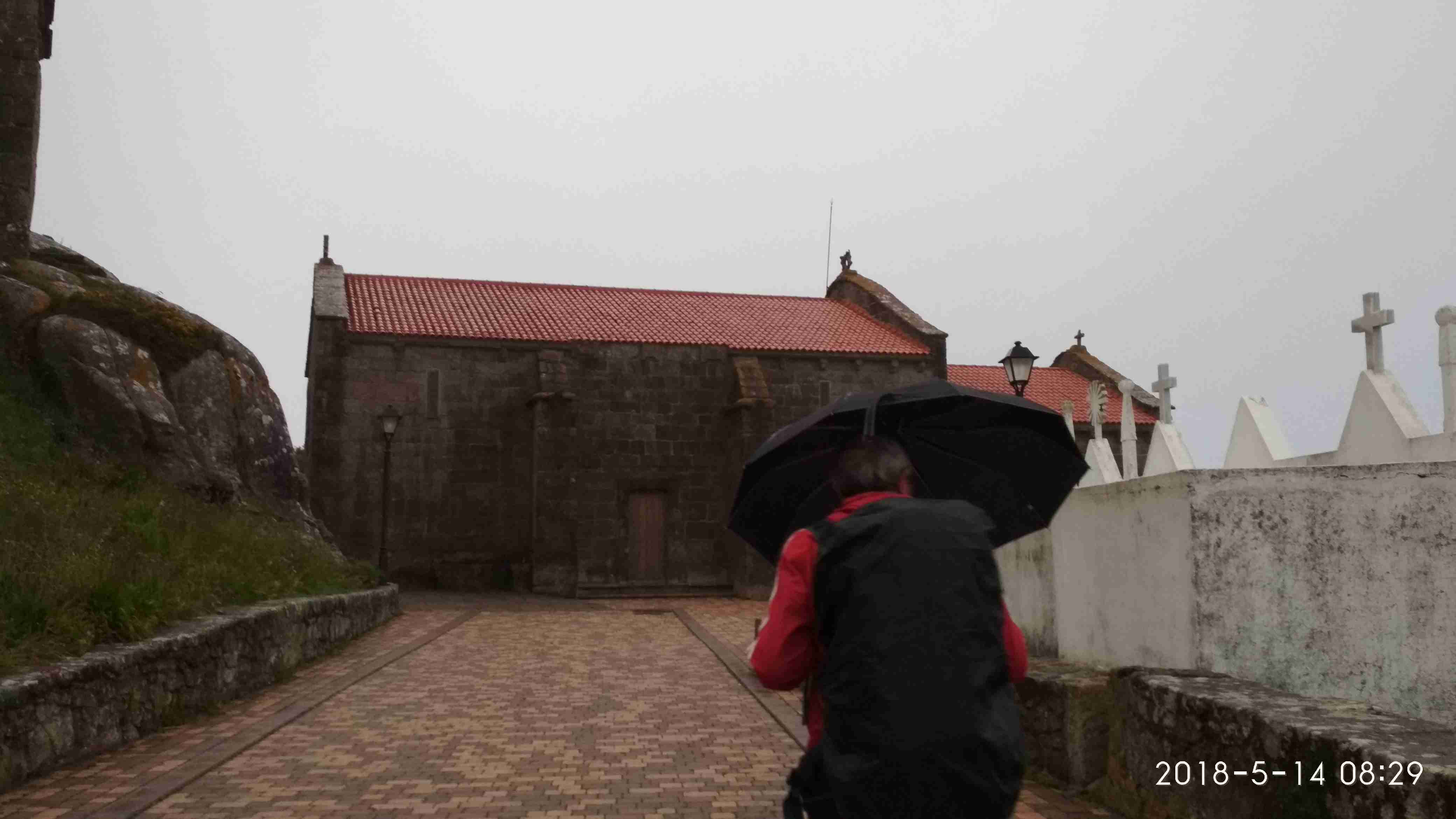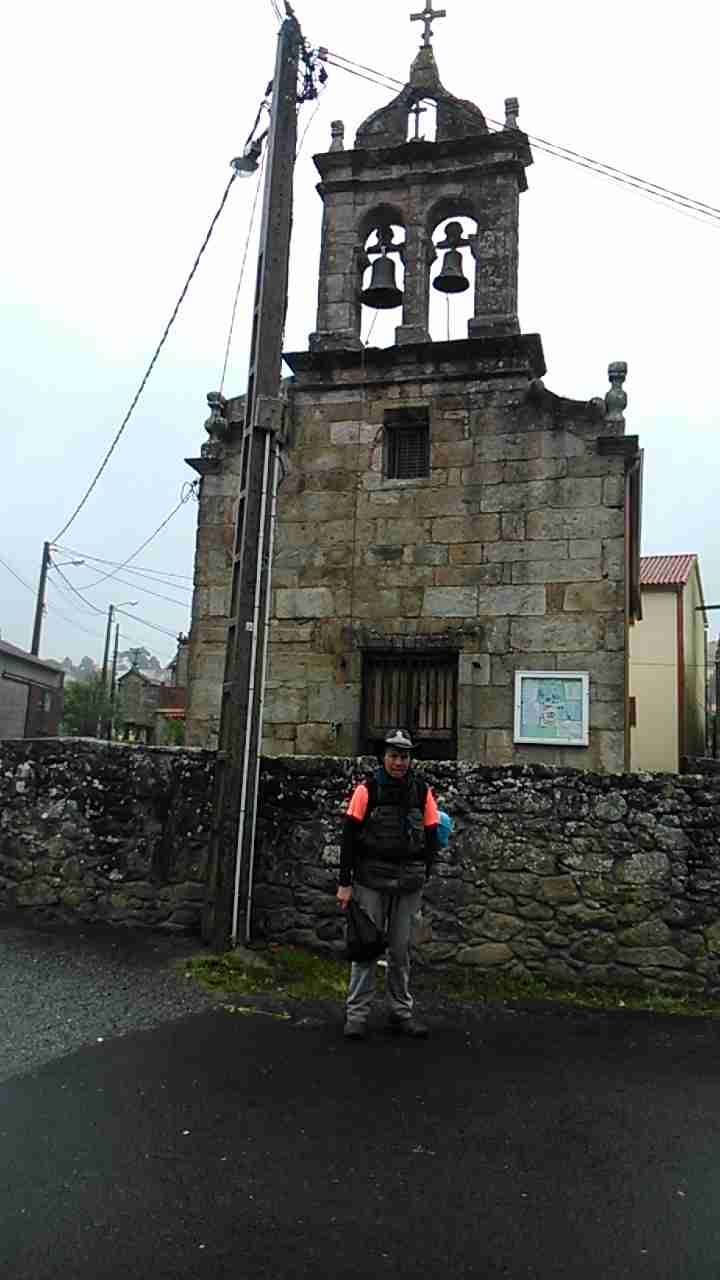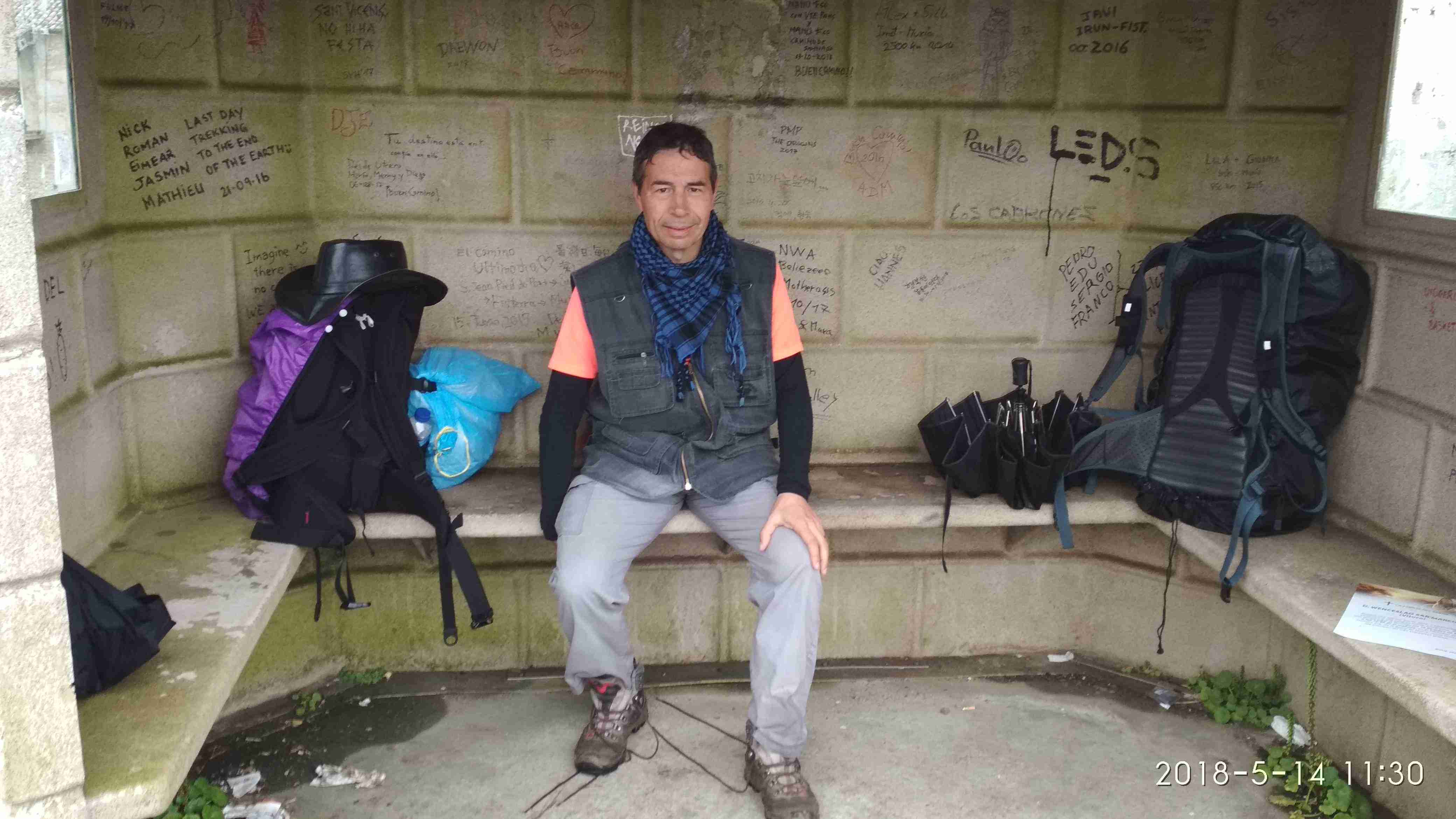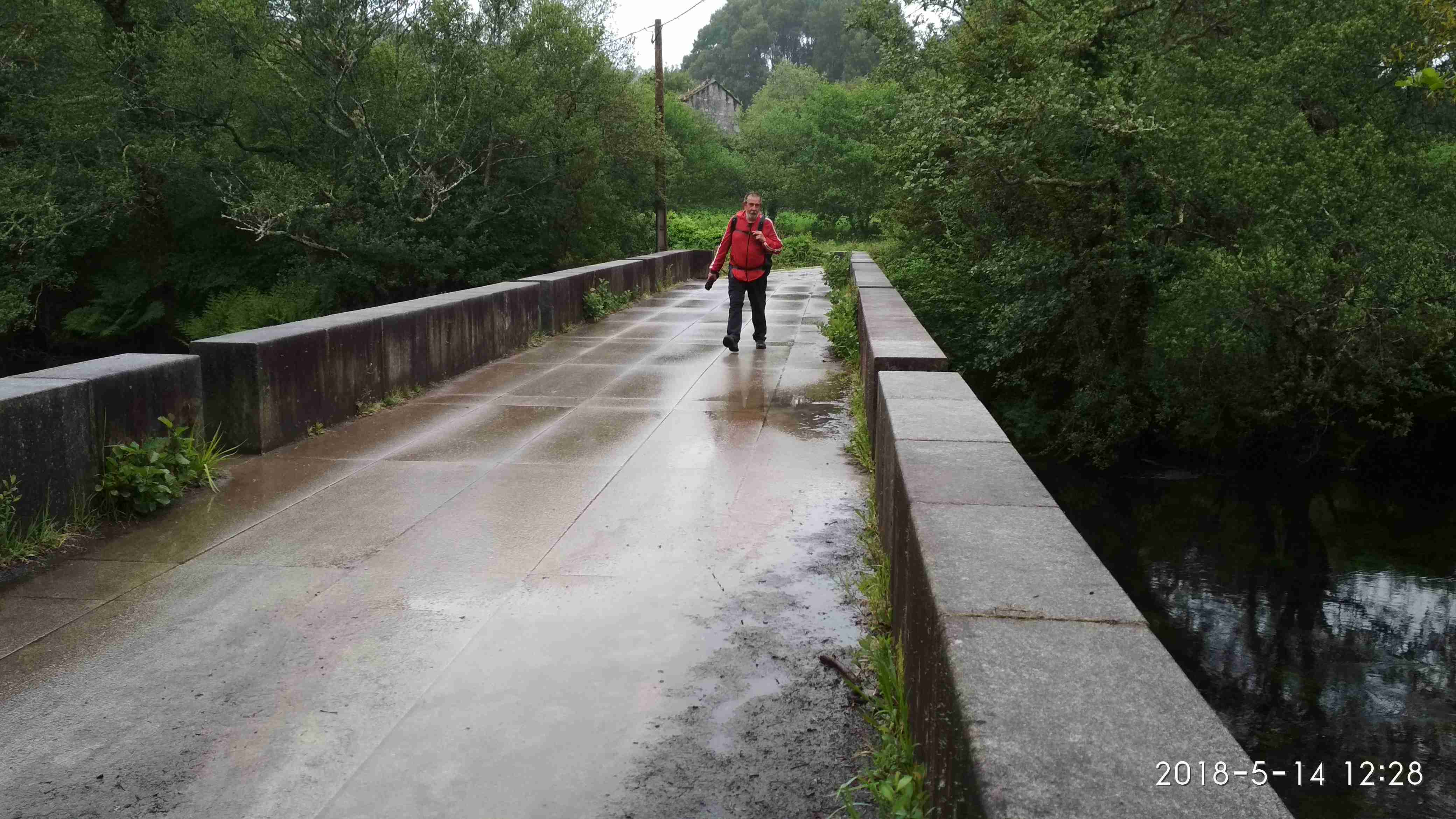 Como ya venía siendo una tónica yo marchaba un kilómetro rezagado de Primi, intentando no perdernos de vista pero con la niebla y las constantes subidas y bajadas era imposible. En una de las bajadas le encuentro esperándome en una caseta posiblemente de parada de autobuses muy sucia y descuidada, repleta de pintadas. Me espera acompañado por un par de perros cuyo afán es meterse en la caseta. Mientras descansamos en la caseta pasan la pareja de holandeses y la otra de los nacionales. Buscamos en la guía para situarnos. Una hora después cruzamos el puente de Vaosilveiro, sobre el río Castro, que según Chema y Paco ellos tuvieron que pasar poco menos que a nado hacía ya más de siete años. Después, ya en Segovia, comprobaríamos que ellos debieron ir por la otra ruta.