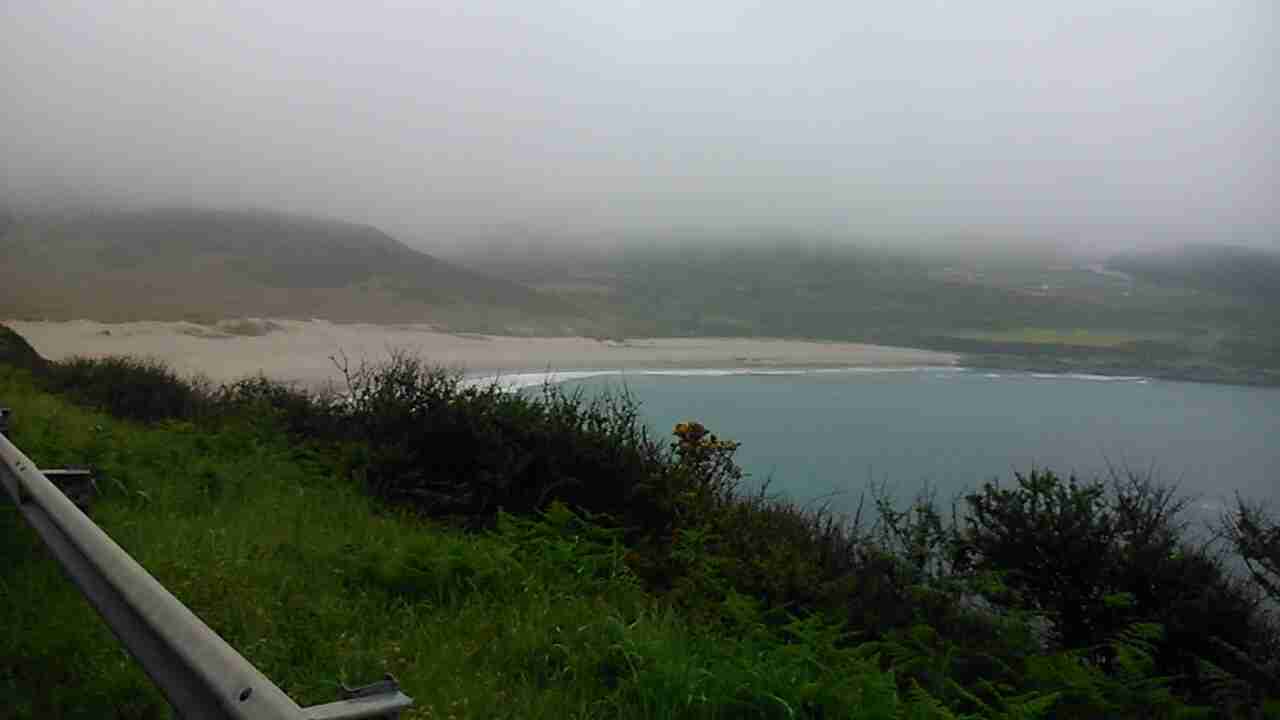 Sabemos que hay dos caminos por los que llegar a Finisterre, por la montaña o por la carretera, siguiendo el litoral. Aunque decidimos seguir por el litoral, apenas después de cuatro kilómetros estamos en plena montaña sin ver a nadie. Las vistas de la Costa de la Muerte se difuminan con la espesa niebla y la lluvia.