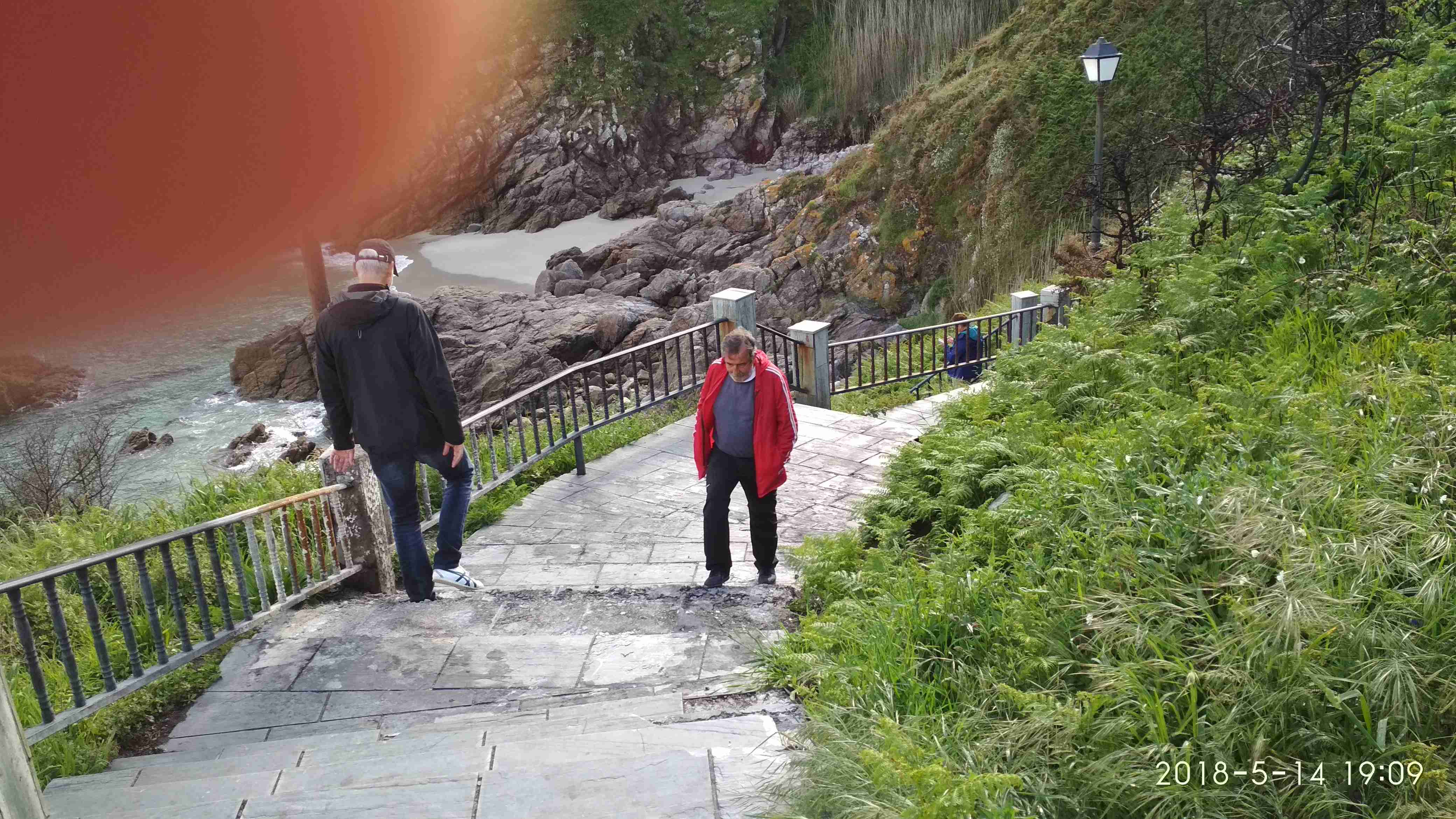 Bajamos por una escalinata casi hasta el Océano pensando en avanzar algo hacia el faro. Cuando vemos que no vamos bien nos toca subir de nuevo la escalinata para retroceder. Después atravesamos un campito de fútbol donde unos chavales y chavalas estaba jugando y encontramos el camino de subida al faro.