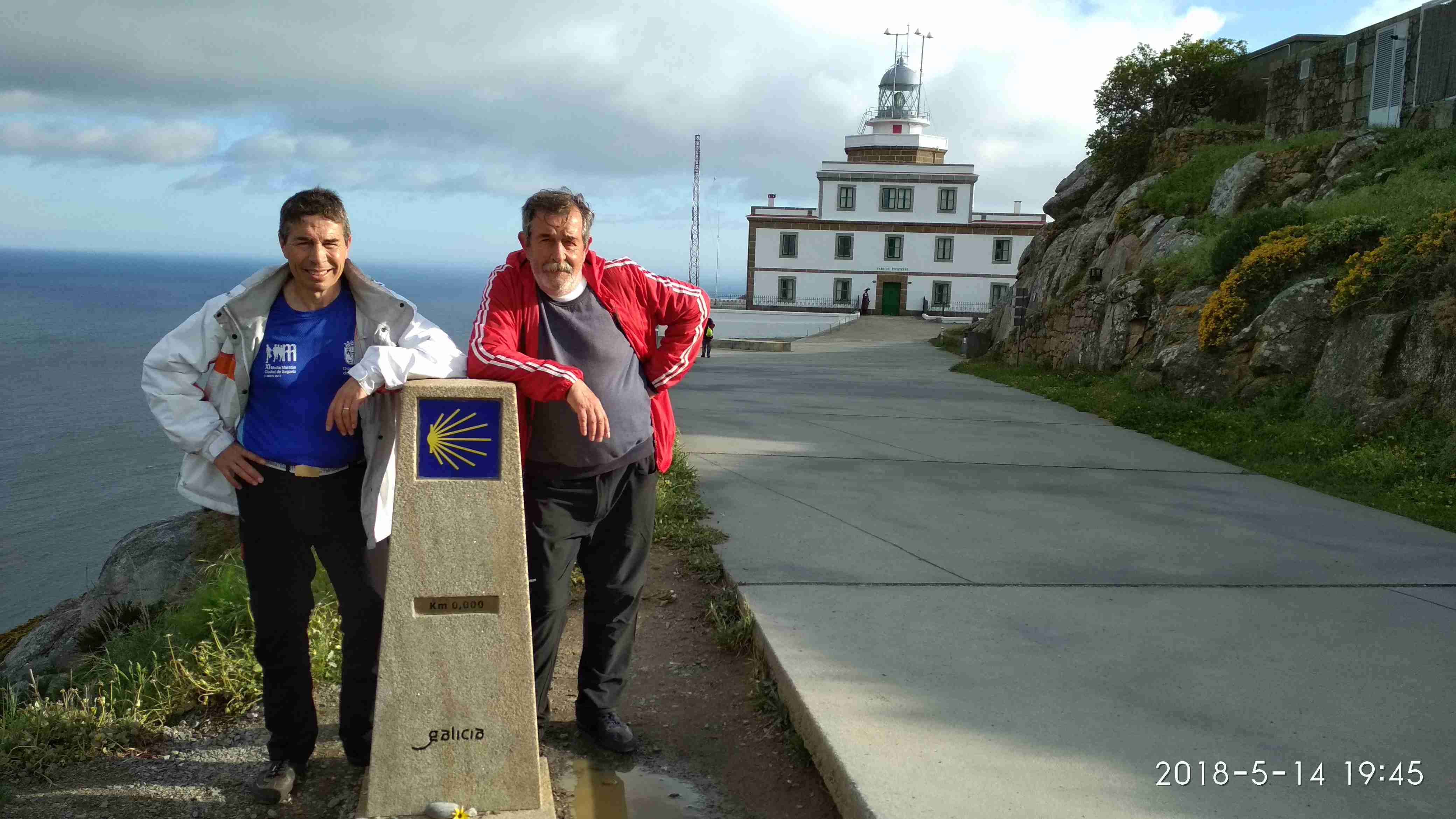 Ya en el Faro, en el indicador del kilómetro 0, una peregrina mejicana, Azucena, se presta a tomarnos alguna foto.
