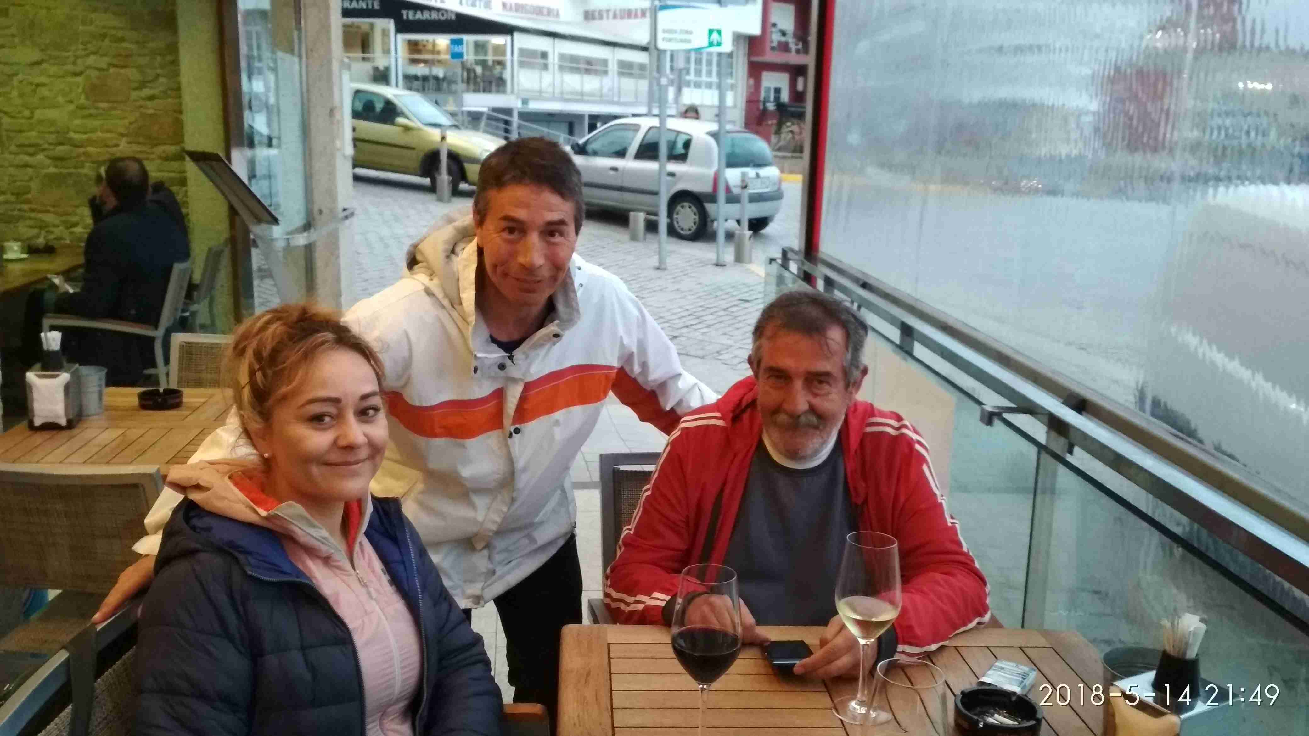 Después de un pequeño descanso y de un momento de meditación mirando al Océano nos volvemos a Finisterre. Alcanzamos a Azucena mientras bajamos pues iba bastante despacio. Nos comenta que mañana ella va a Muxía, lo que aprovechamos para explicarla cómo es el camino hasta allí. La agradecemos el detalle de las fotos y la invitamos a tomar un ribeiro con nosotros, cosa que acepta encantada.