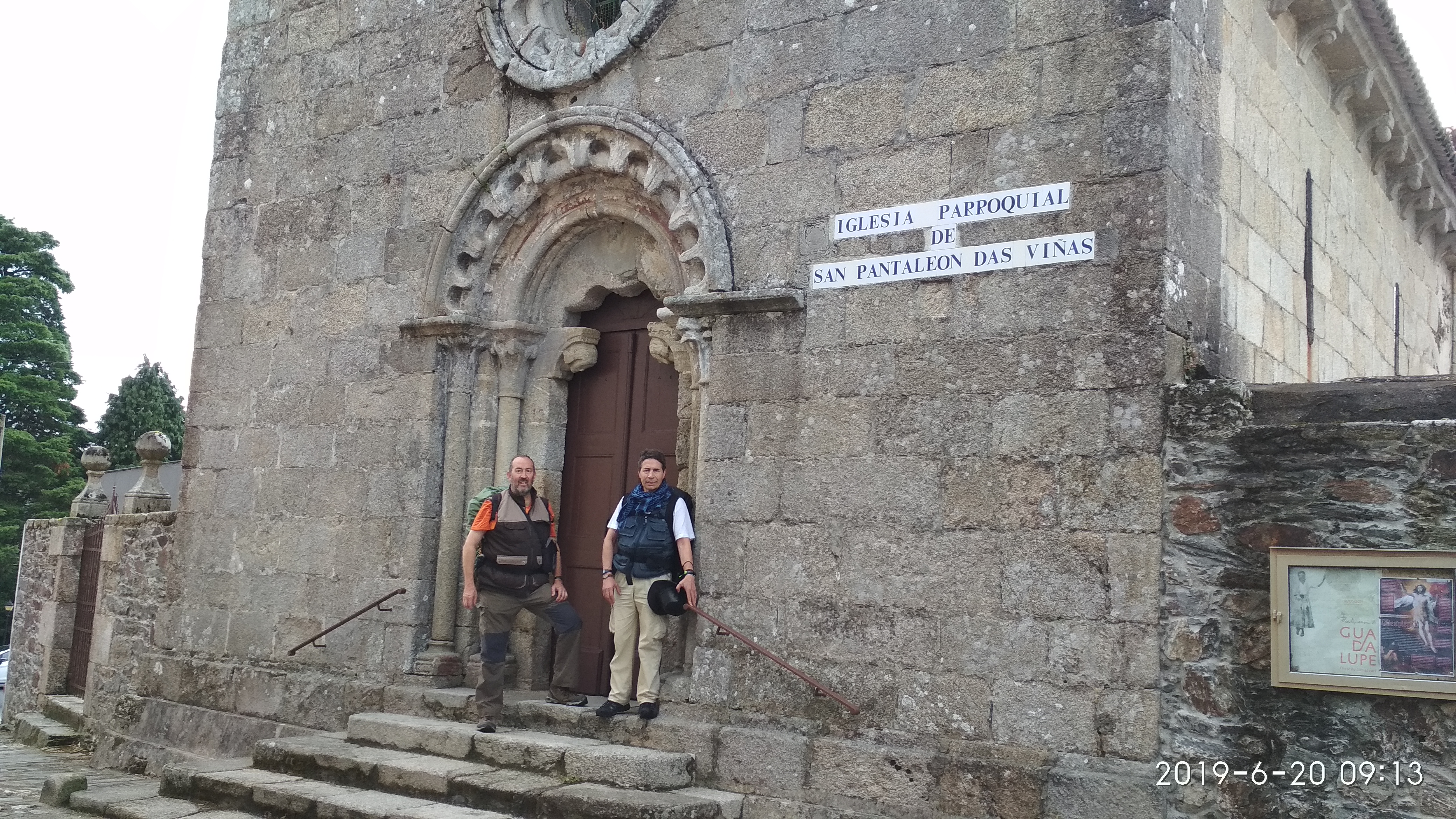 Nos comentó que estaba muy cabreado con los políticos porque habían modificado el trazado del camino original, añadiendo 2 o 3 km sin ningún sentido y además evitando pasar por ciertos sitios que merecía la pena. Cómo buen conocedor de la zona se ofreció a llevarnos por el antiguo camino; una subida corta pero intensa asciende hasta Montecelo y pasa junto a la iglesia románica de San Pantaleón das Viñas, del siglo XI; y así fuimos casi una hora con él en amena conversación por pistas intermedias, con alguna subida de menos y alguna bajada de menos, porque esta tierra es muy irregular.