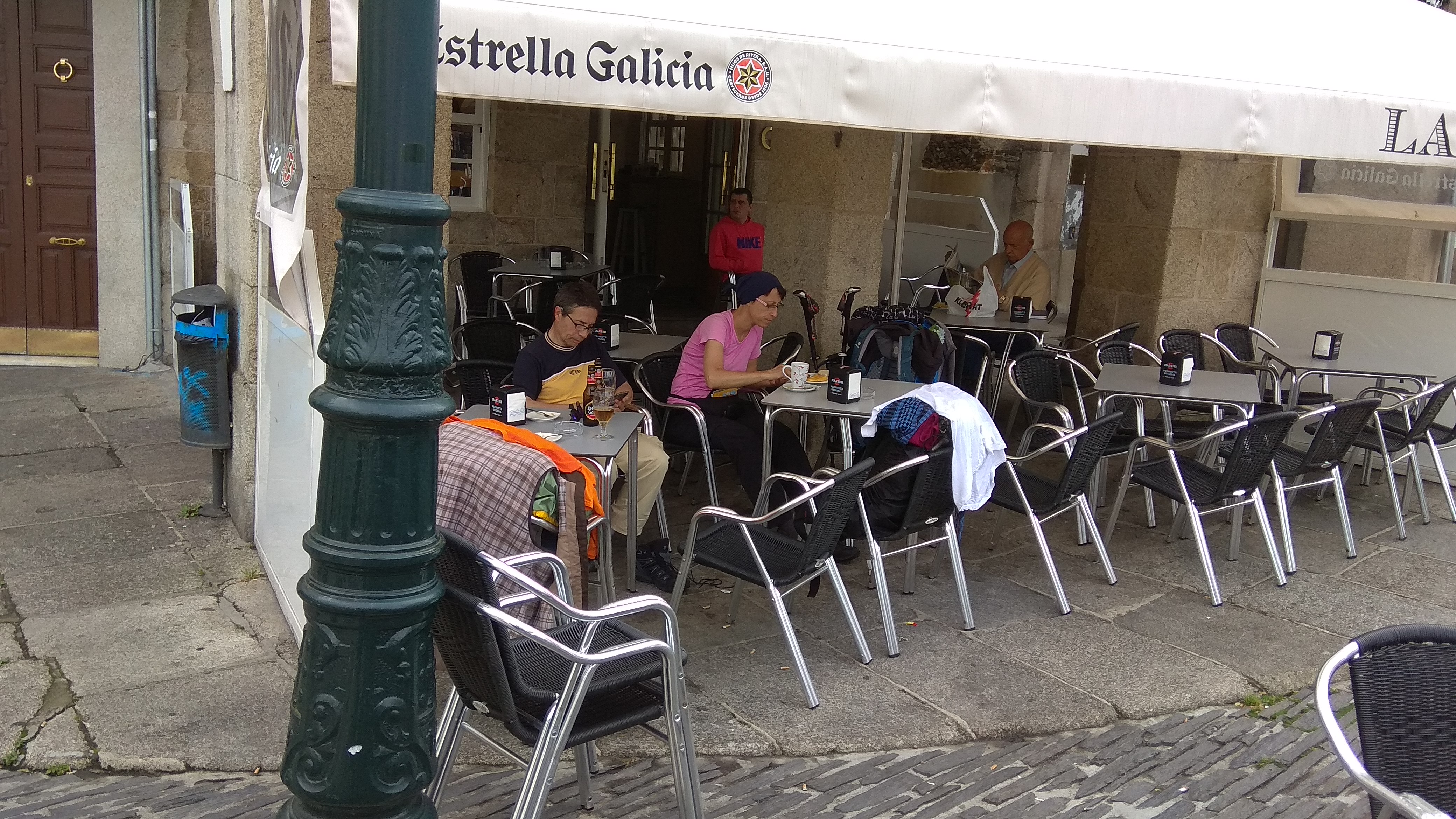 Había que reponer líquidos y disfrutar de un día que sin hacer mucho sol la temperatura era excelente. Me paro en una terraza de la plaza y a los dos minutos llega Primi con Andrea, que se para allí mismo a recuperar líquidos. Estuvimos allí un poco más de una hora y, aunque el bar no tenía cocina, sí que nos puso de pincho tortilla de Betanzos que estaba bastante buena.