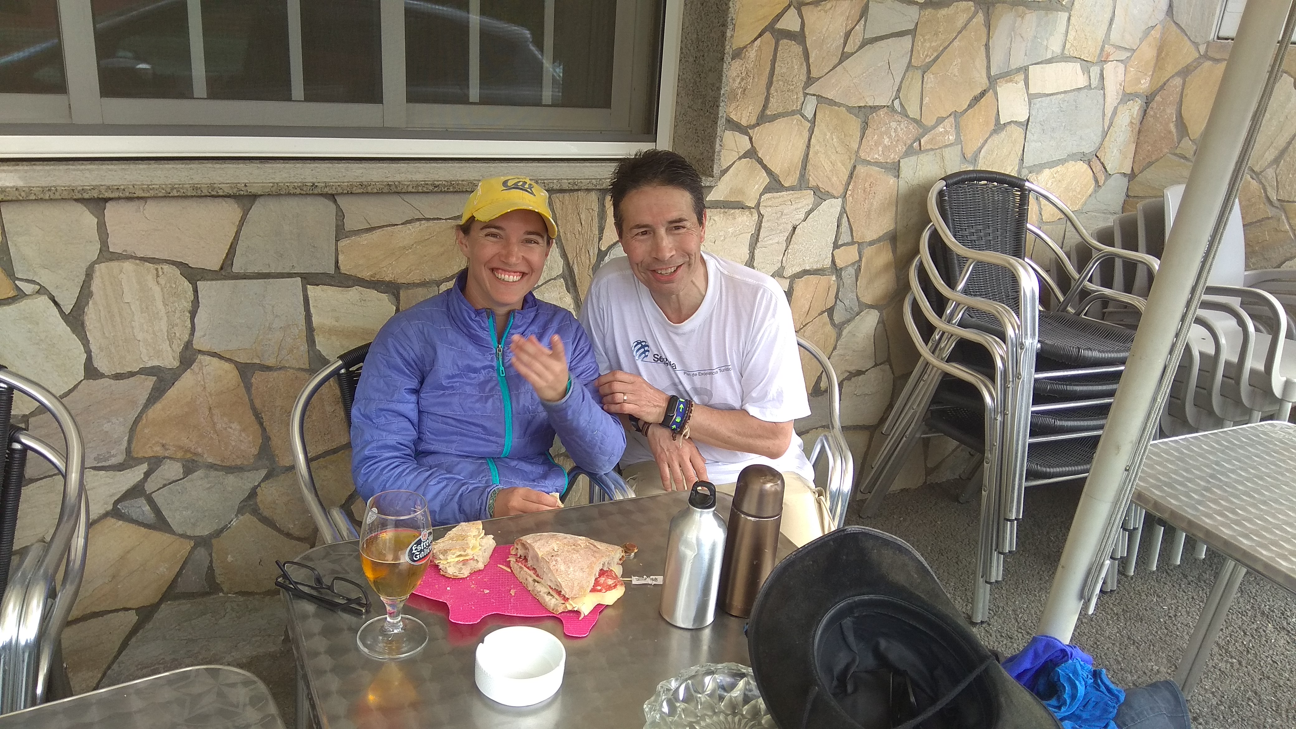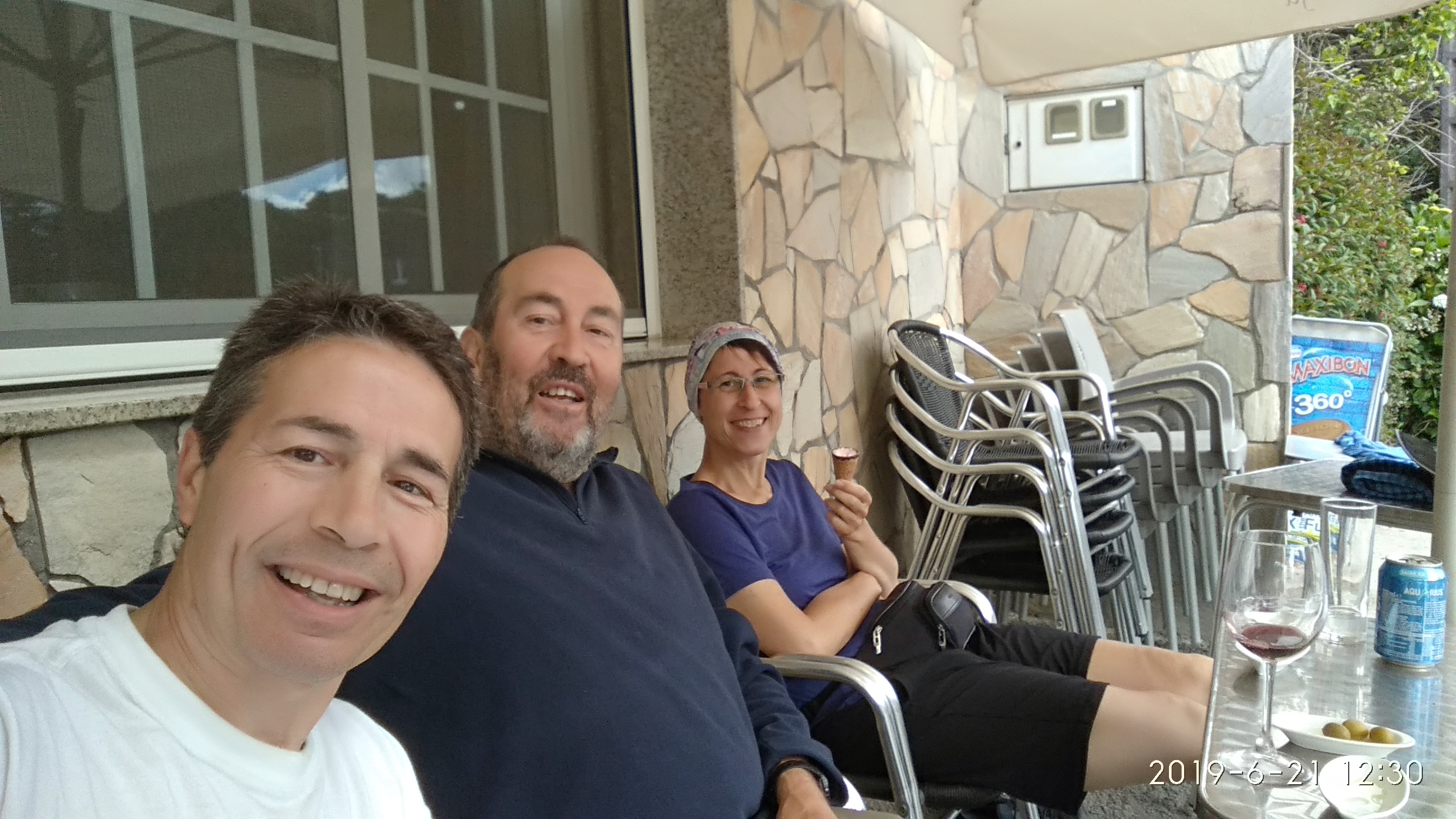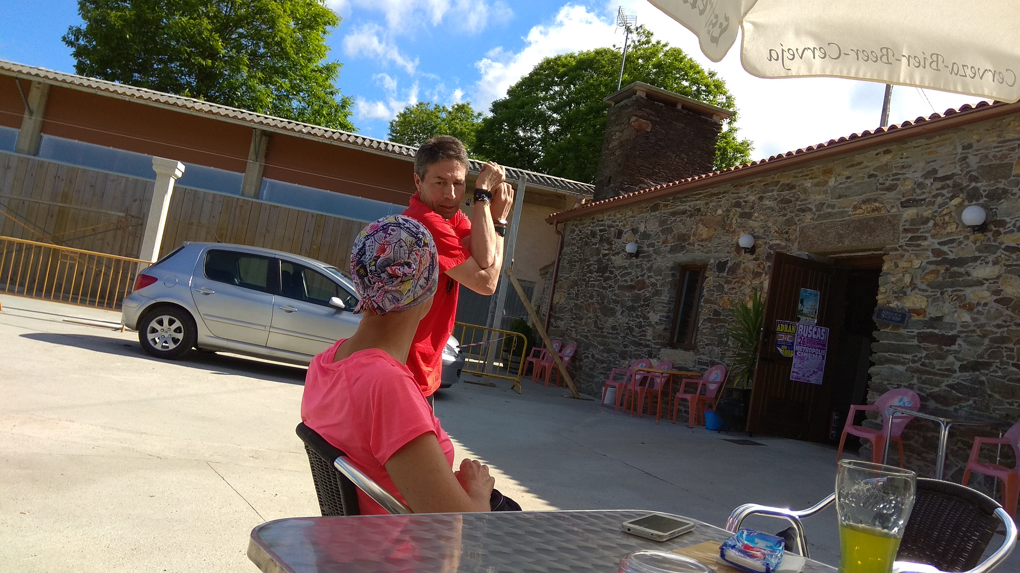 Llego al bar del pueblo, me pido una caña y me salgo a la terraza. A los pocos minutos llega Fabio, el italiano, con el que estoy más de media hora despachando. Es de la provincia del Véneto, concretamente de Vicenza, tiene aproximadamente mi edad y su primera mujer falleció hace muchos años; en total tiene cuatro hijos, dos con la primera mujer y dos con la segunda, y otros cuatro nietos, la más pequeña de en torno a 2 años. Me enseña una foto y yo no me aguanto y le enseño una foto de Martín. Le gusta todo el tema de montaña, conoce los Alpes, los Dolomitas, y el Camino de Santiago; es la cuarta vez que lo ha hecho, dos en bicicleta desde Saint Jean Pied de Port, una a pie desde Logroño y esta, caminando por el Camino Inglés. Tiene puesta la lavadora en el albergue con lo que está mirando el reloj para ver cuando termina. He quedado con él esta tarde en que me va a invitar a un vino.