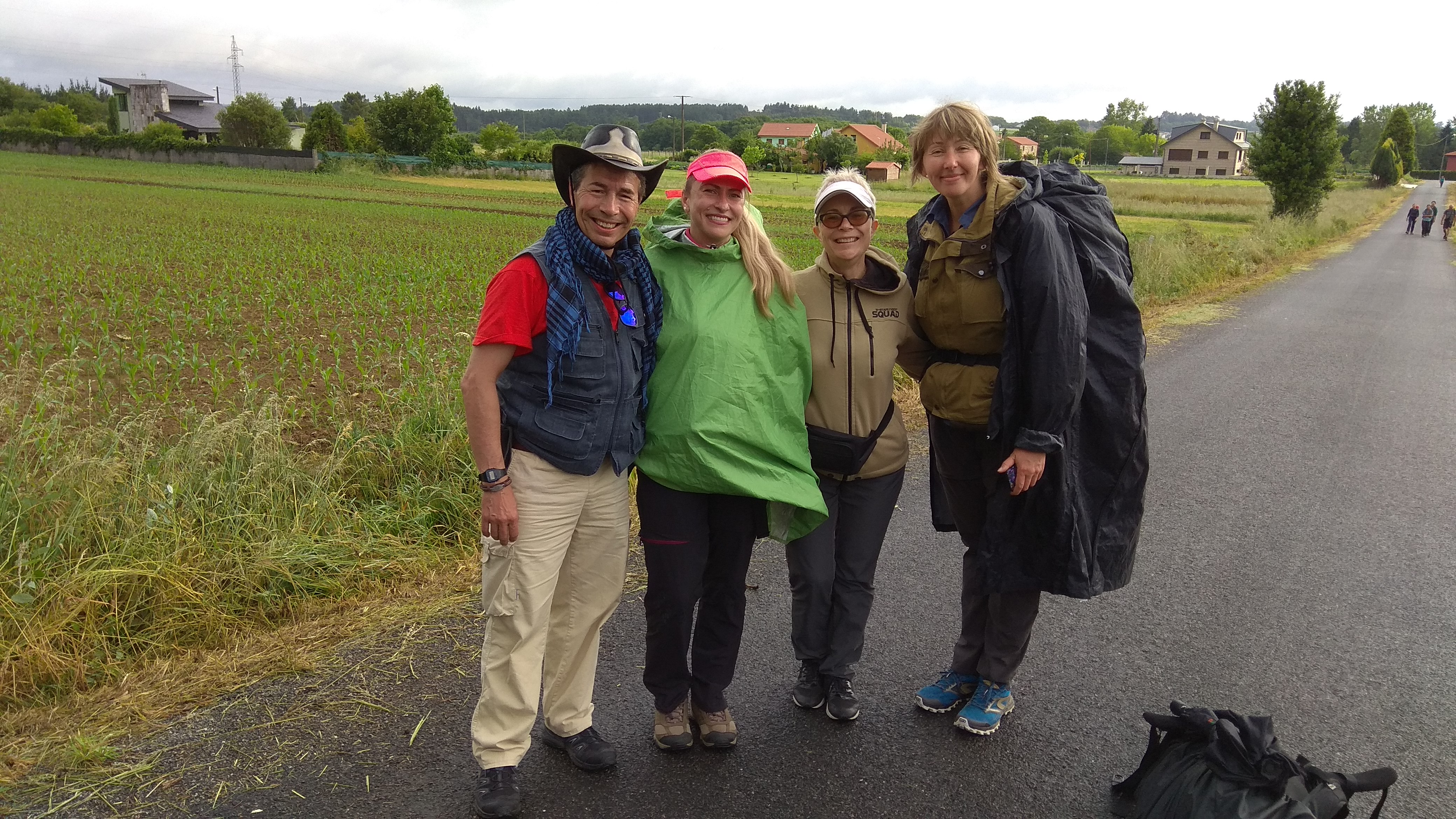 Primi recoge en el albergue los pantalones de tracking que se había dejado Irina (como varias cosas más anteriormente). Un poco más de 45 minutos vemos al fondo a las peregrinas, a las que hacemos señas para que esperen; las alcanzamos y nos reímos un rato a costa de los pantalones, lo que aprovechamos para hacernos una foto ya que en ese momento había dejado de llover.