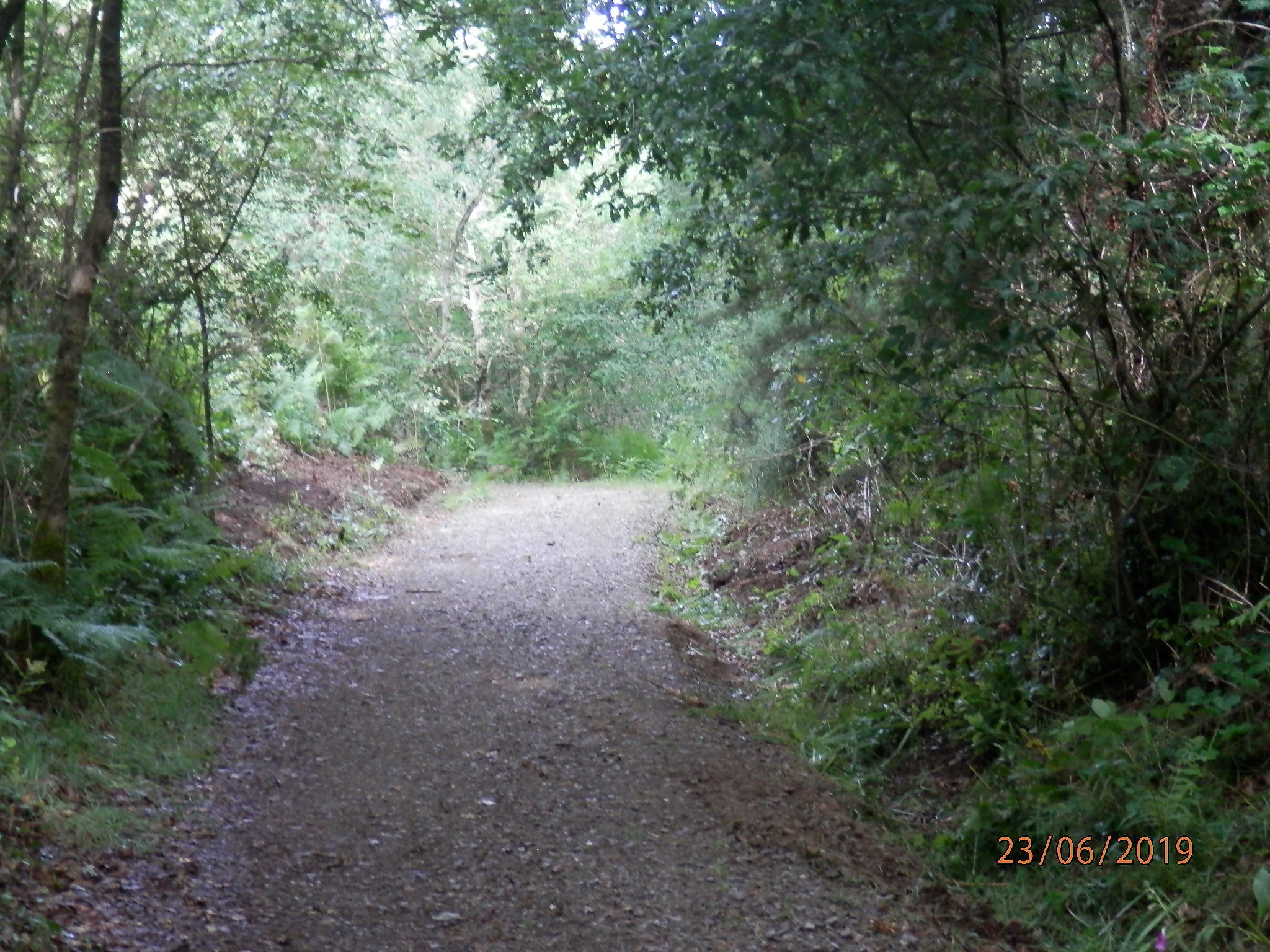 El camino con una serie de sube y bajas no se hace demasiado duro, pero tampoco encontramos un sitio donde parar ya que, en el kilómetro 8, "El Castro", nos pareció un poco pronto. Nos sorprendió un tramo arbolado que se agradecía. Nos encontramos un enigmático Bosque Encantado, que comienza con la figura de una bruja en su escoba y las enredaderas trepando por los árboles. Un paseo muy agradable a estas horas de la mañana.
