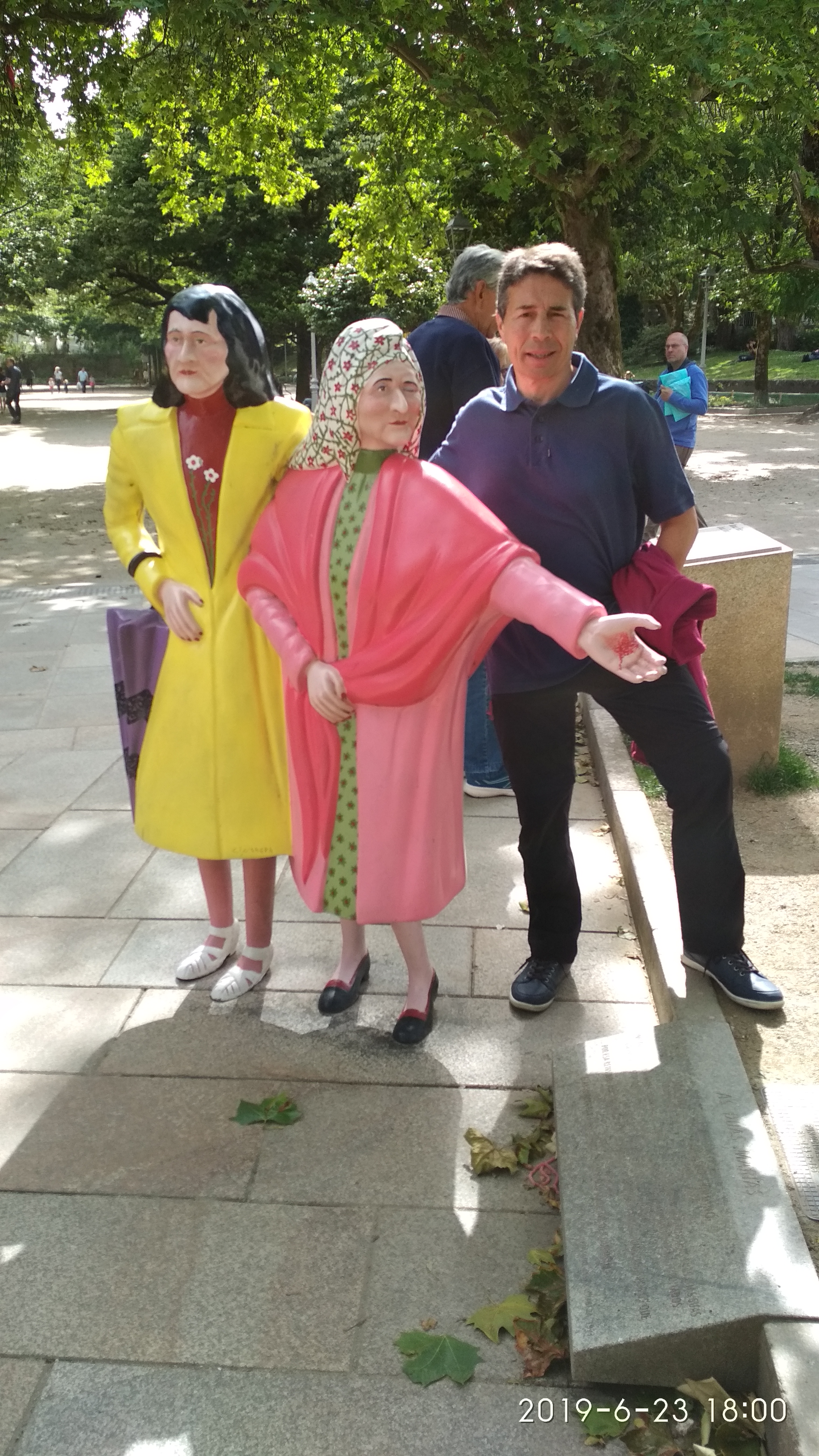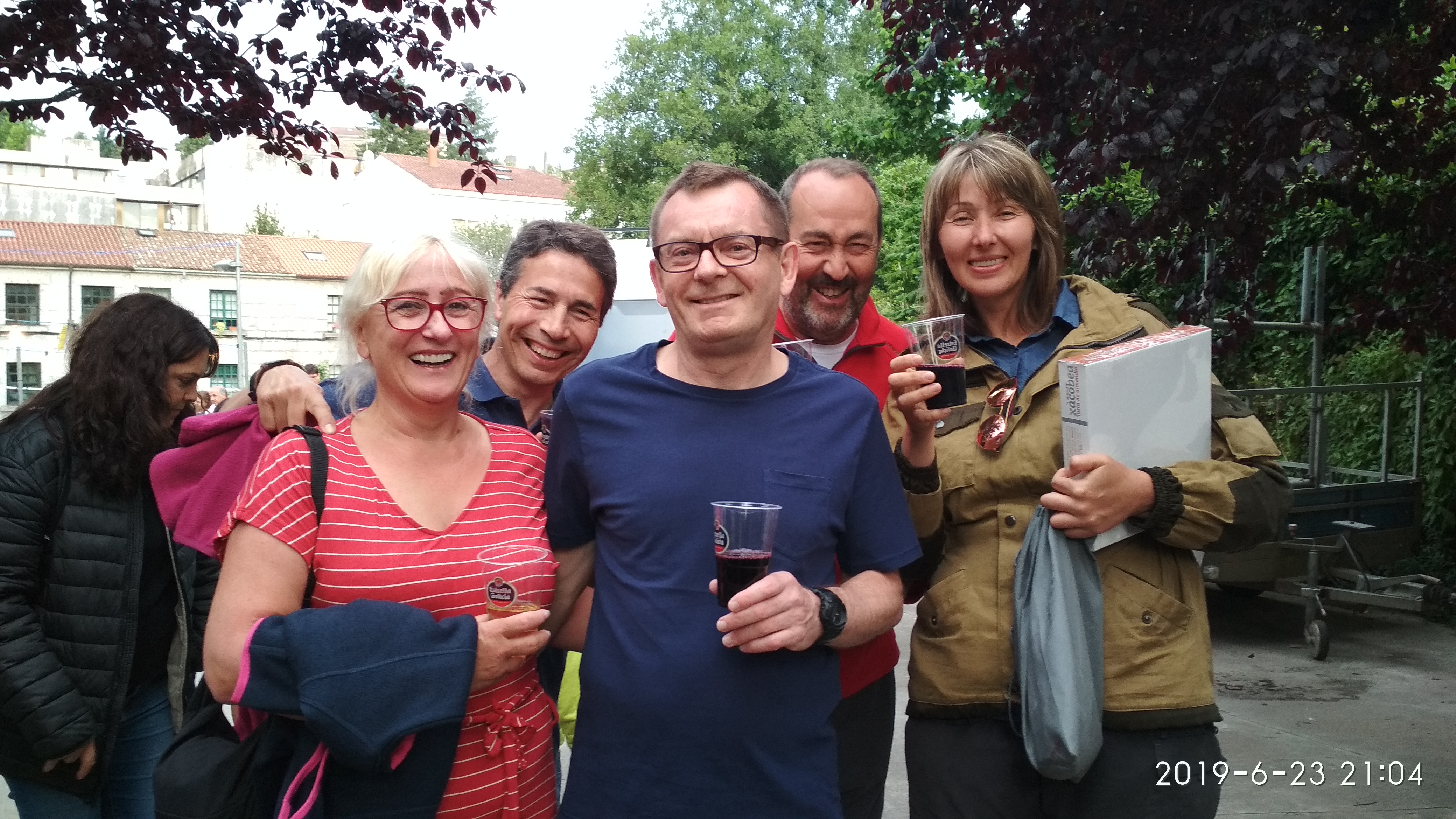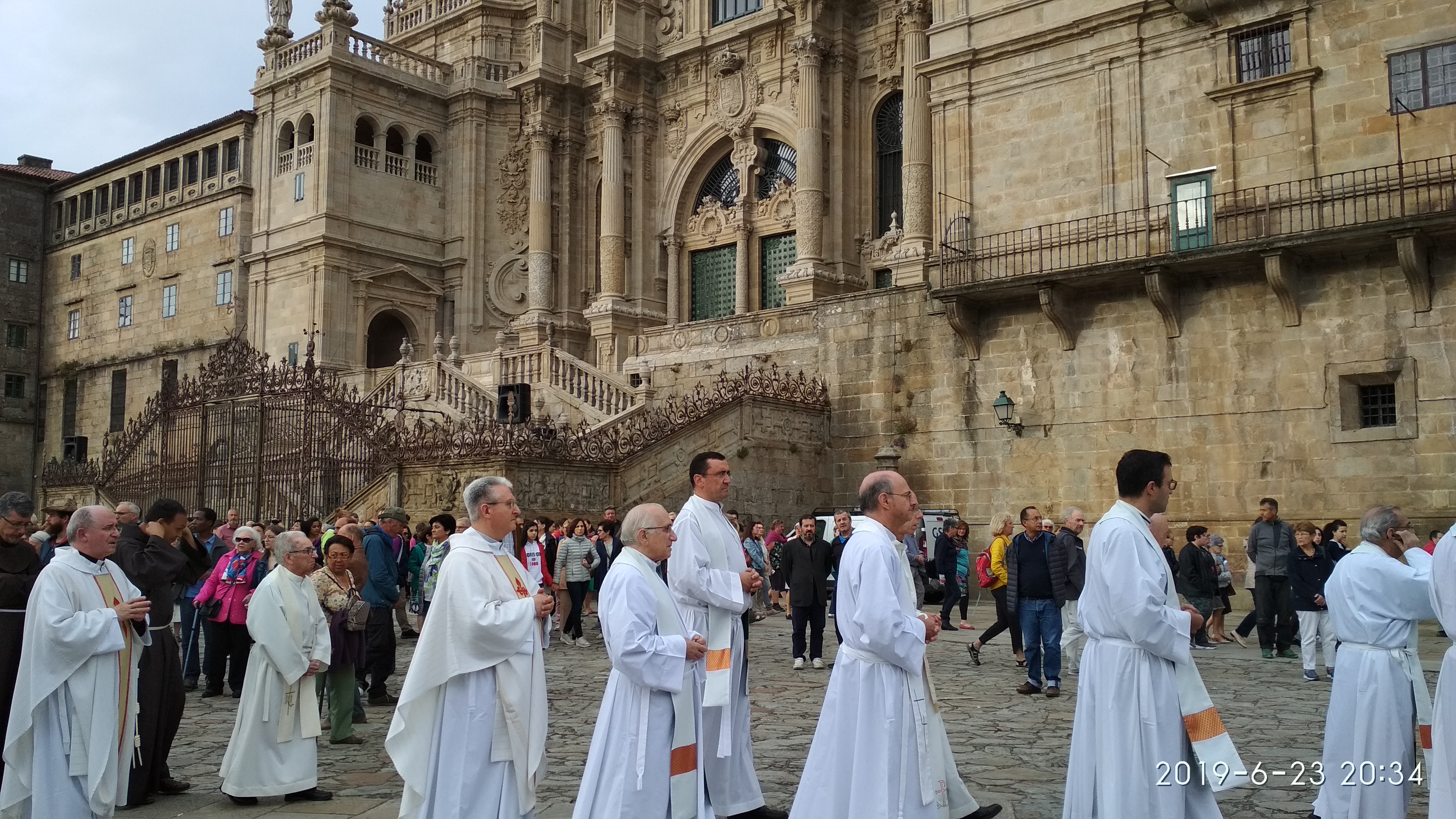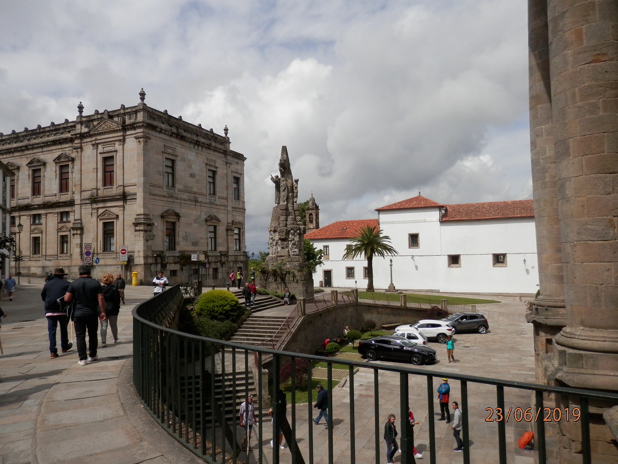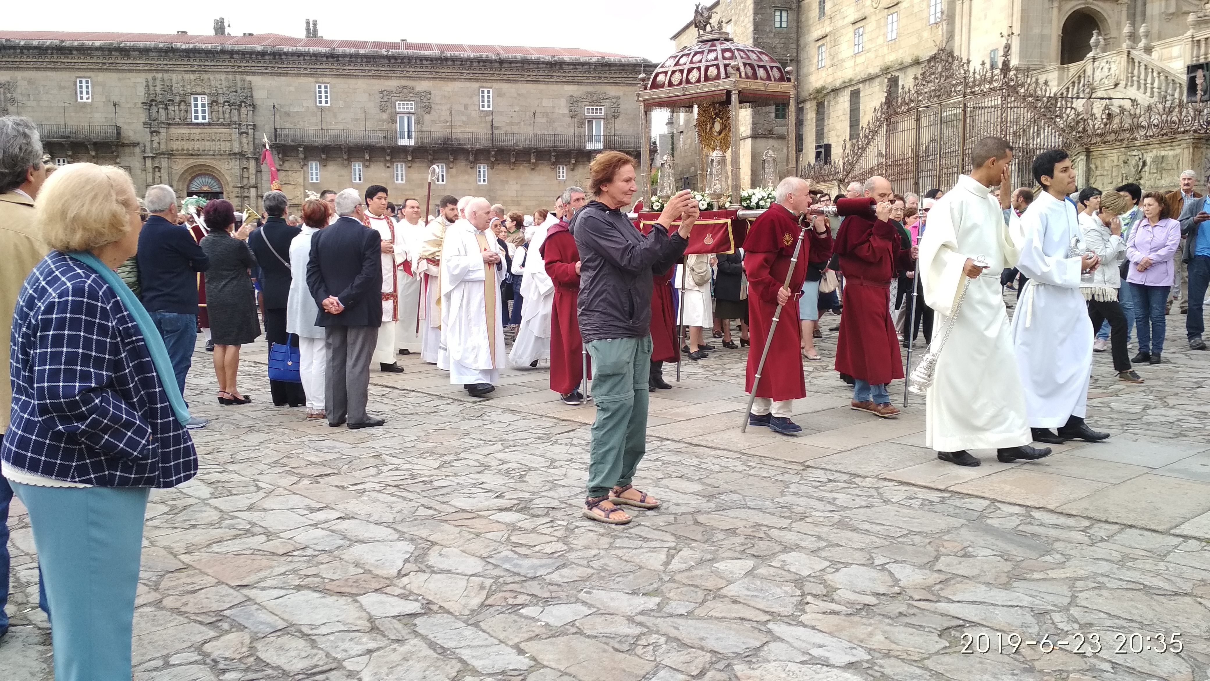 Nos dimos una vuelta por el Casco Viejo y nos tomamos unas cañas en la Rúa del Vilar; en esto que aparece Caroline con su marido. Le comentamos que estamos esperando la llamada de José Ignacio para que nos dé las compostelanas; al poco rato nos llama diciendo qué va a salir en 10 minutos de la oficina, pero que además hay sardinada en un parque cercano por ser la víspera de San Juan. Quedamos con él en ir a buscarle al bar de enfrente de la Oficina del Peregrino que tardaríamos entre 10 minutos y cuarto de hora. Así lo hicimos y al llegar a la Plaza del Obradoiro nos encontramos con las ucranianas y/o rusas, porque resulta que Elena es rusa de Siberia, de Novosibirsk. Había procesión.