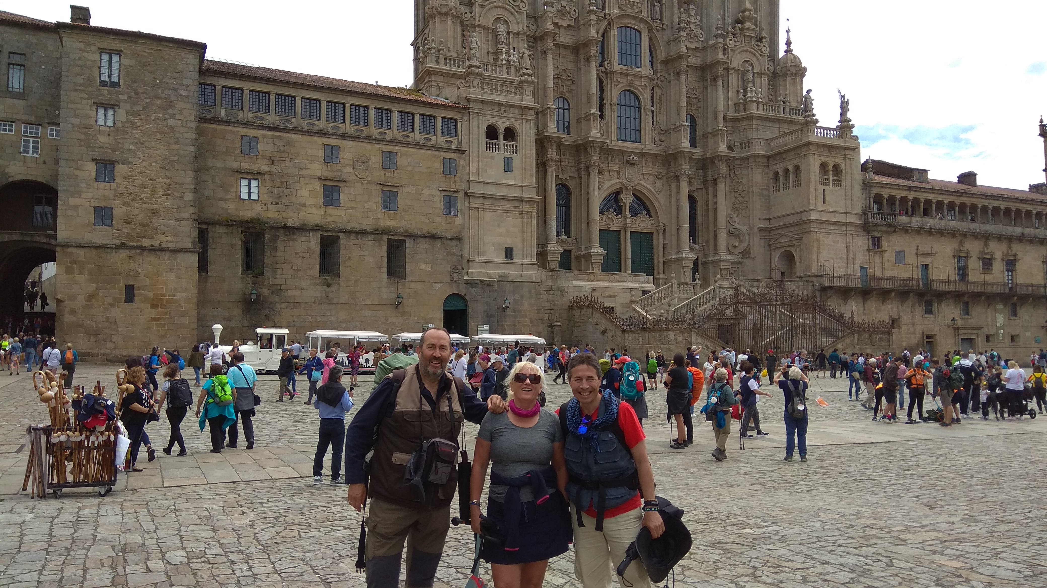 En una terraza, frente a la Oficina del Peregrino, nos pedimos una caña y nos encontramos con Caroline que estaba allí sentada. Llamamos por teléfono a José Ignacio, el hermano de Luis Barrio, y nos dijo que hacía 5 minutos había pasado por allí, pero que si íbamos a estar un rato que vendría a nuestro encuentro. Efectivamente así lo hizo y mientras saludos, otra caña y demás nos cogió las credenciales para hacernos la Compostelana, ya que ha estado de voluntario durante 15 días en la Oficina del Peregrino.