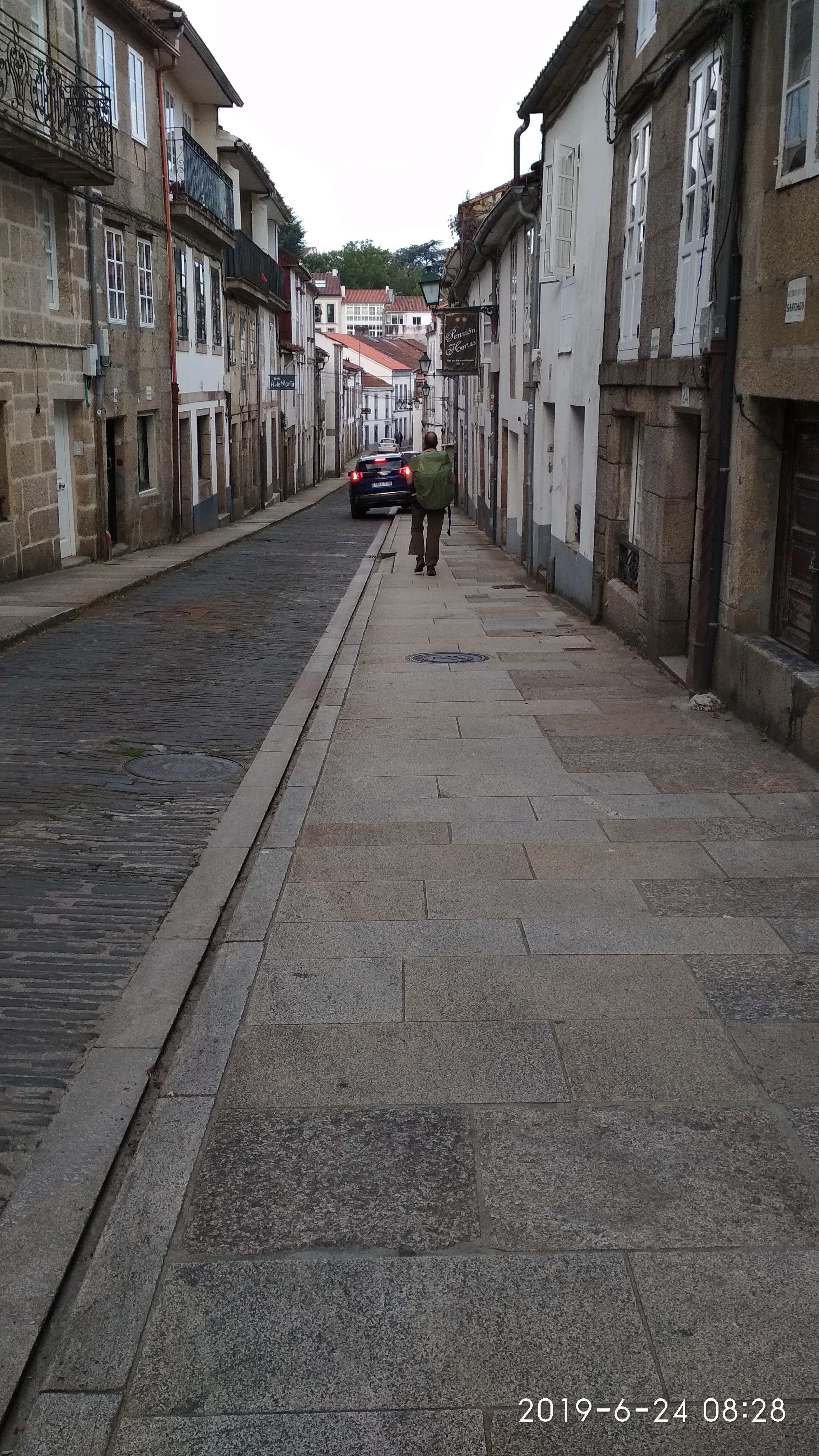 Salimos del Suso en torno a las 8 y nos quedamos a desayunar allí, en las mesas de la terraza. Observando el cielo, no parecía muy encapotado y la temperatura excelente para caminar. No sabíamos exactamente el camino de salida hacia, Finisterre pero ya vimos algunos peregrinos que nos despejaron las dudas. Bajando de la plaza del Obradoiro y dejando el Hostal de los Reyes Católicos a la derecha, tomamos la rúa das Hortas, dejando a la izquierda la iglesia de San Fructuoso, que se caracteriza por las 4 esculturas que pretendiendo representar las cuatro virtudes cardinales, se parecen mas bien a las cuatro sotas de la baraja.