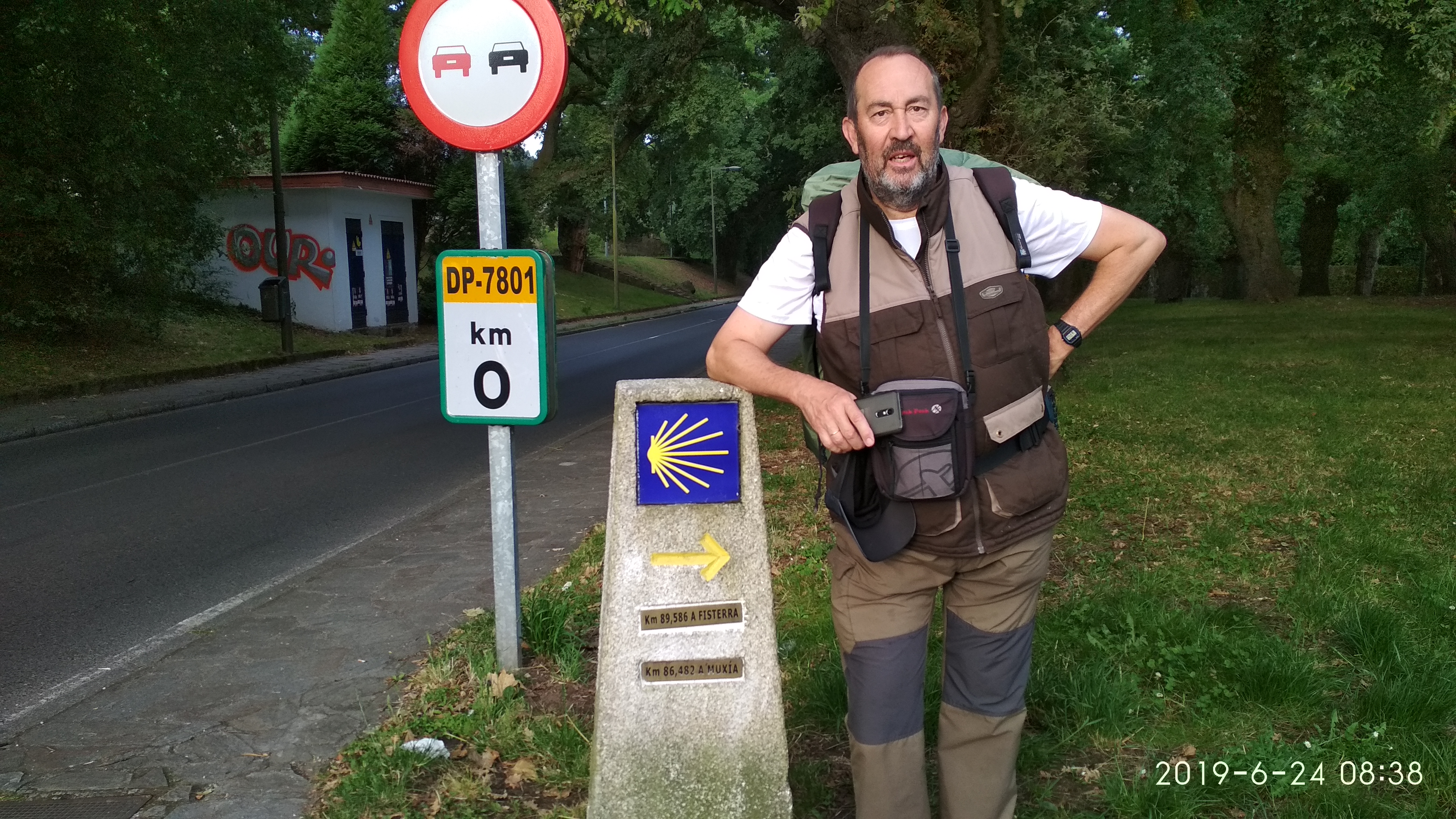 Bajando la rúa y siguiendo las flechas adelantamos a las peregrinas italianas (Patricias), y a otra pareja americana, así como una pareja de Barcelona que no conocíamos, llegando a un frondoso bosque de robles y eucaliptus, donde encontramos el primer mojón jacobeo que nos indica la distancia a Finisterre y Muxía.
