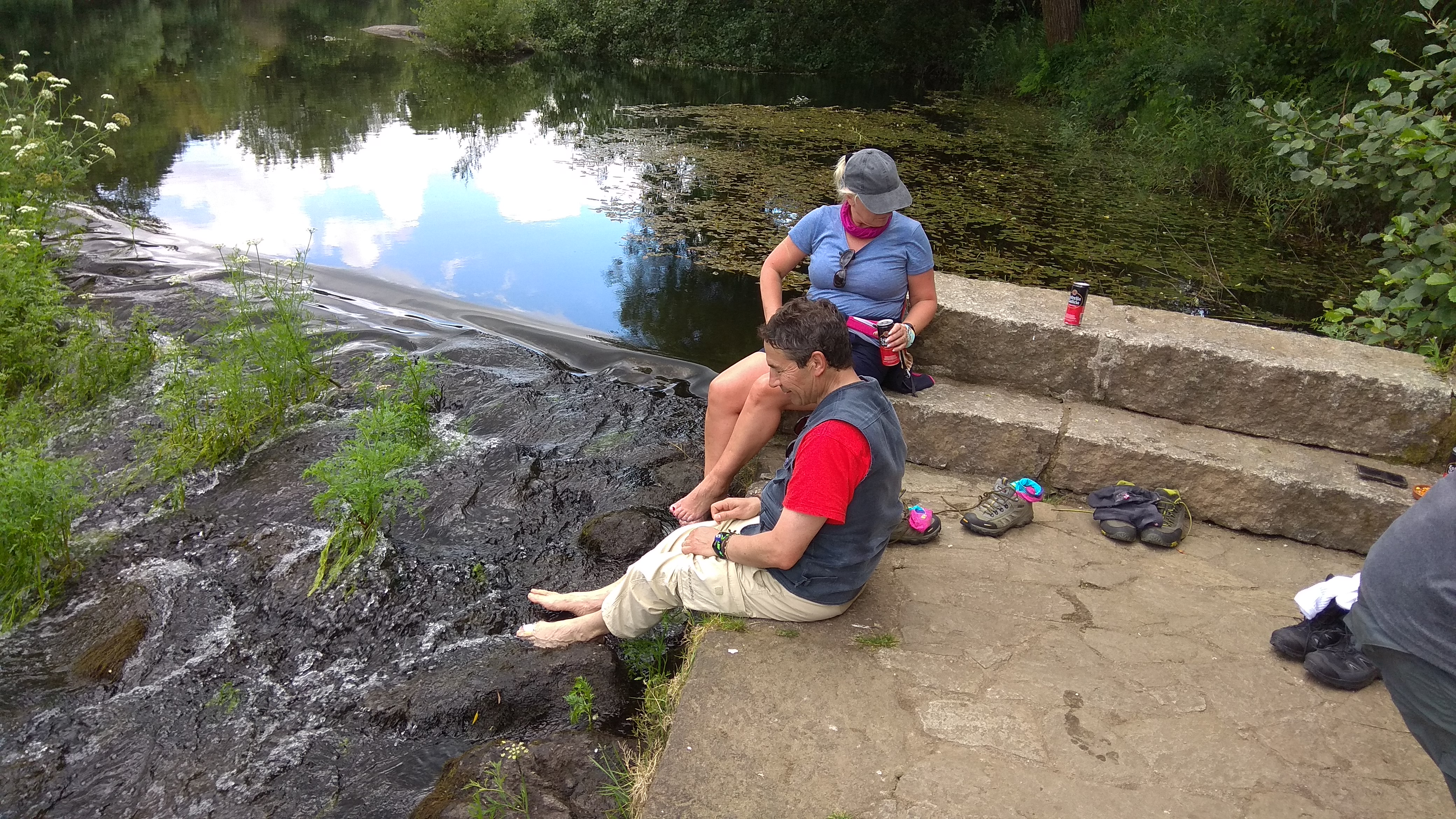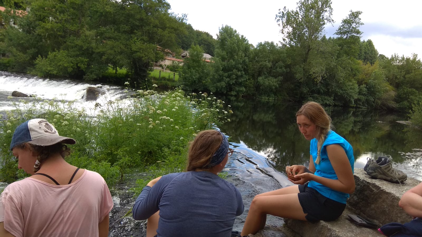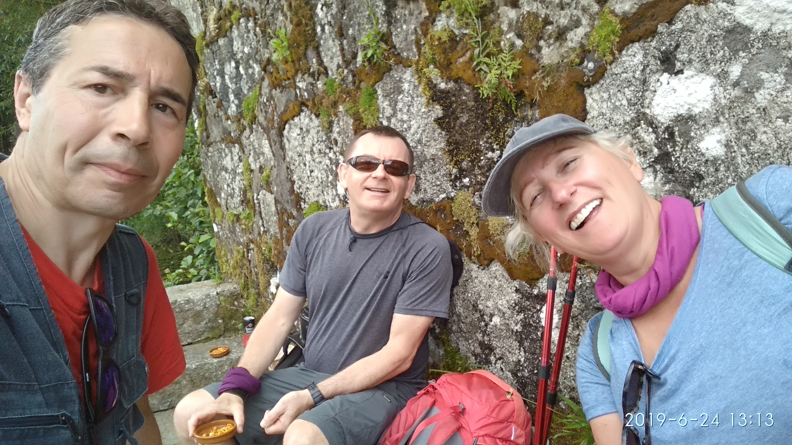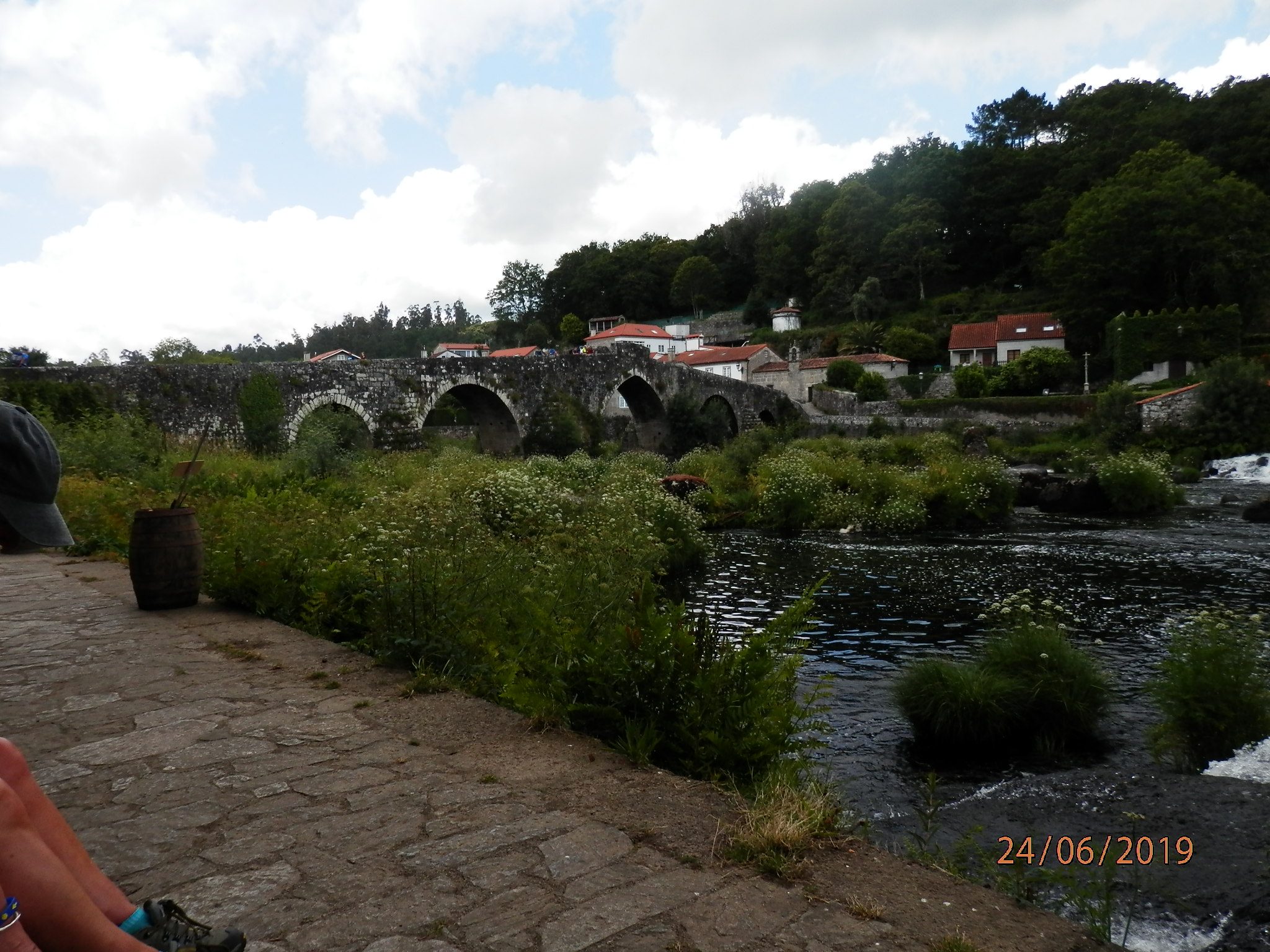 El lugar es ideal, junto al rio Tambre, que a estas alturas de primavera-verano trae bastante caudal. Había una pequeña terraza y un chiringuito instalado en una antigua construcción restaurada. También cabía la posibilidad de meter los pies en el agua. Volvimos a coincidir con Caroline, la irlandesa, que ya venía con su marido Paul.