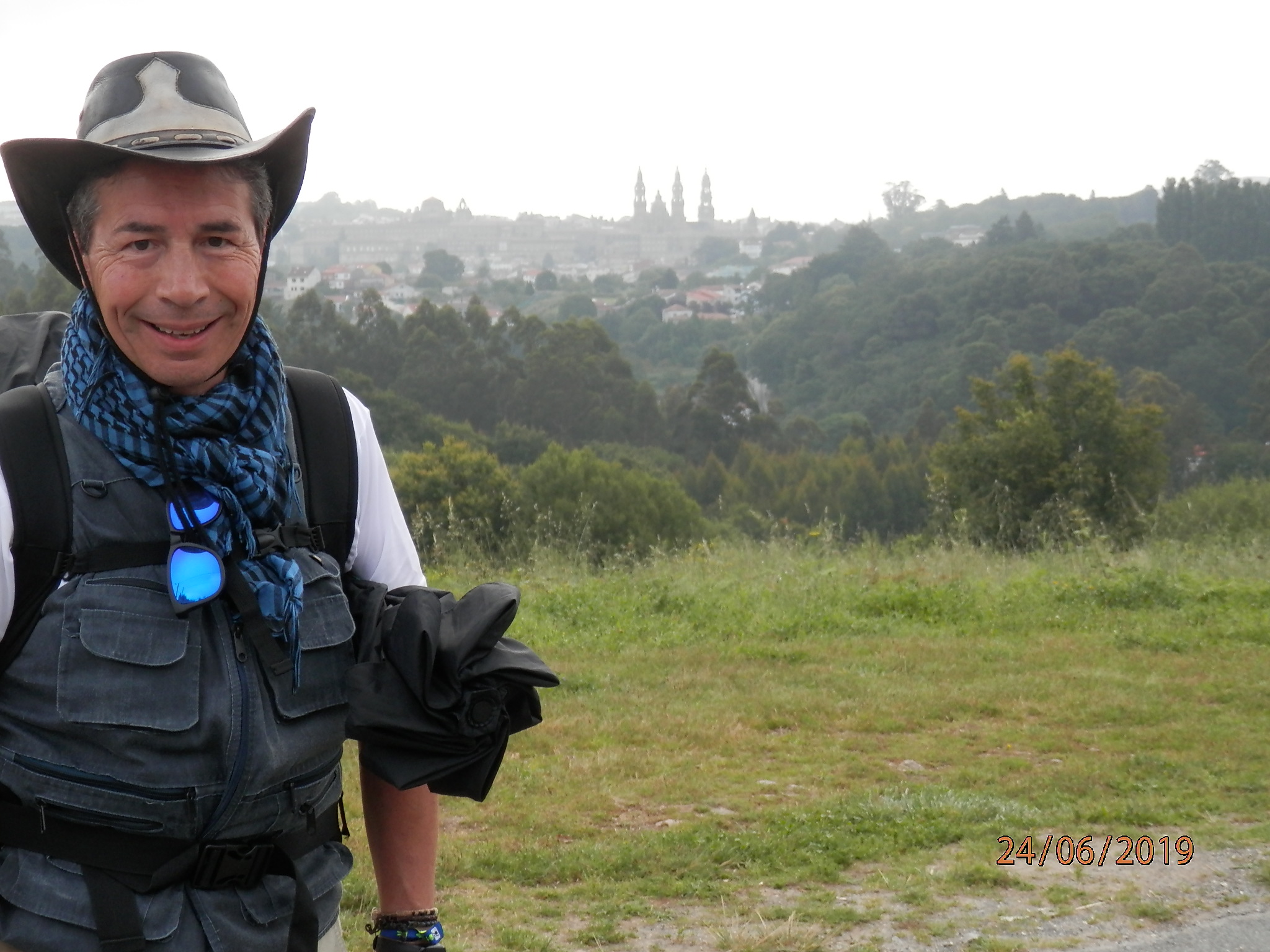 Una fuerte subida nos espera; Primi va avanzando y adelantando gente, entre ellos un grupo de Barcelona. Desde el alto y, sin haber perdido de vista Santiago, se pueden tomar buenas fotos con las agujas de la catedral al fondo.