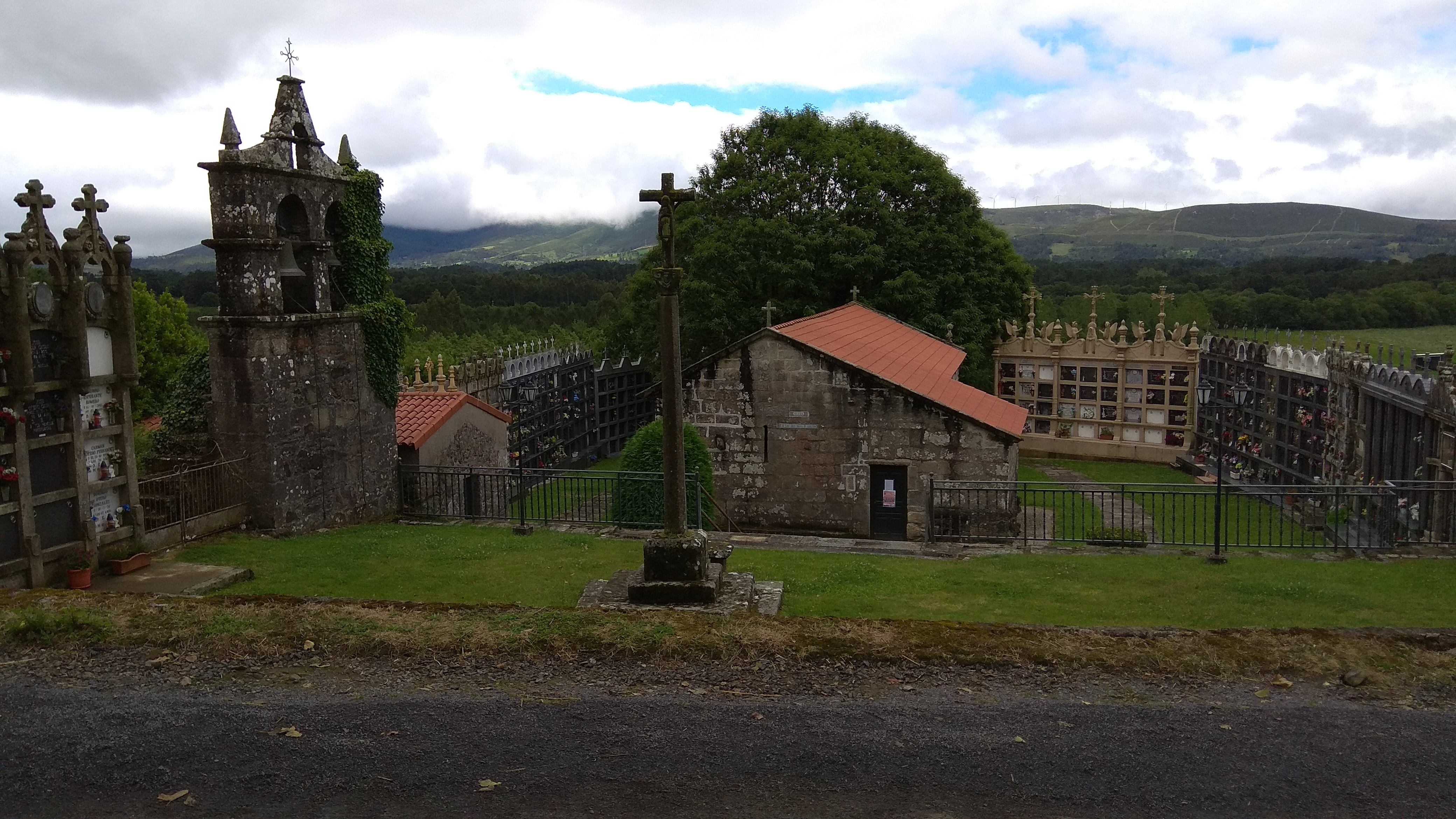 Estamos en el Concello de Mazaricos y en torno a las 8 de la mañana nos pusimos a caminar. No habían pasado 20 minutos de marcha y ya estaba lloviendo, por lo que tuvimos que hacer una incómoda parada para colocar la funda y sacar el paraguas. Así estuvo durante las dos o tres horas siguientes, intercambiando entre carretera y caminos rurales; pasamos el río Maroñas, la aldea de As Mariñas, con dos bellos hórreos, donde se habrían albergado algunos peregrinos que conocimos el día anterior.