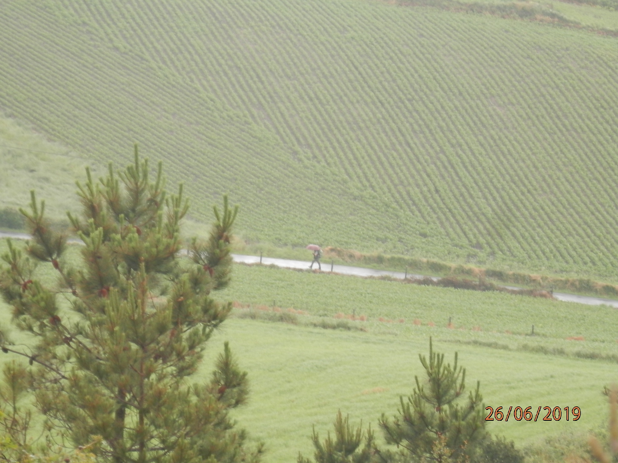 Pasamos un peligroso cruce de la carretera general con un bar, en el que no paramos, intentando hacer los mejores tiempos a esta hora de la mañana. De vez en cuando nos cruzábamos con peregrinos que marchaban en sentido inverso hacia Santiago.
