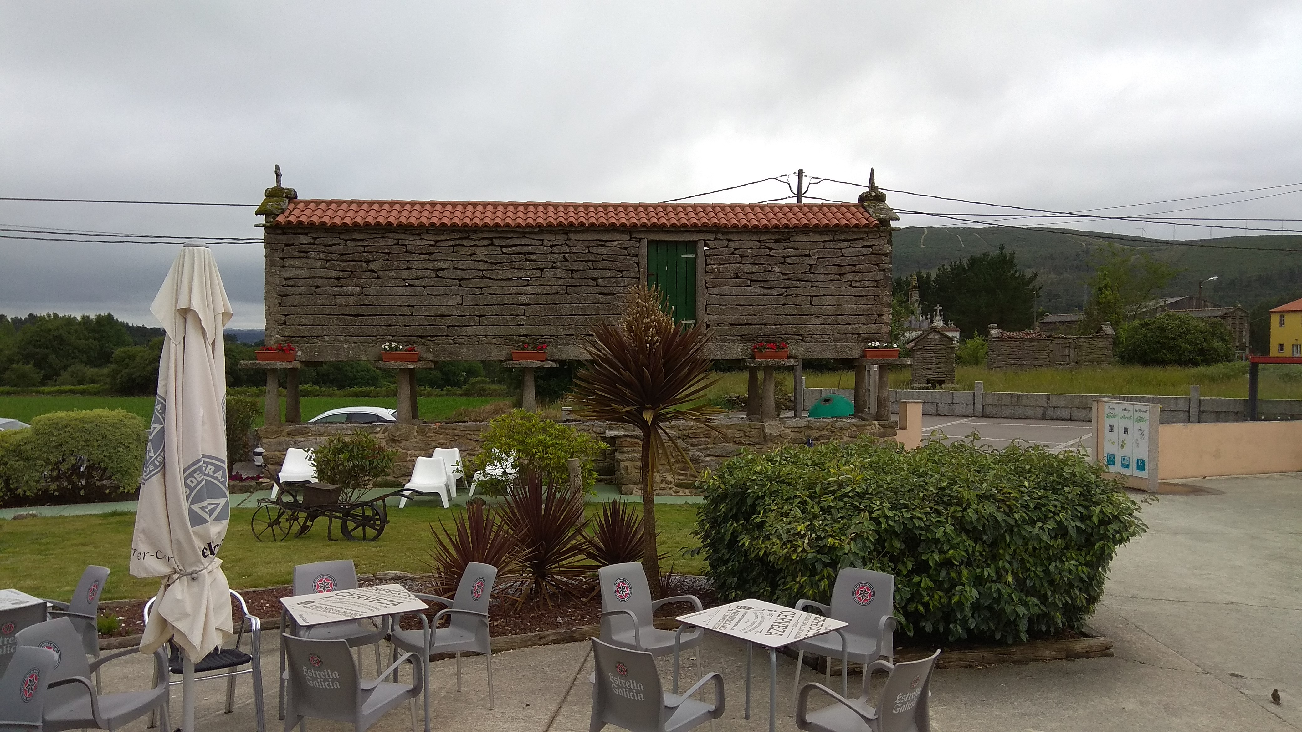 Ya no llueve, el camino es bastante llano y se hace muy agradable el paseo. Llegando a Olveiroa se nota que hay bastante gente en el albergue bar casa Manola, que tiene una terraza bastante grande y se ve movimiento de peregrinos.