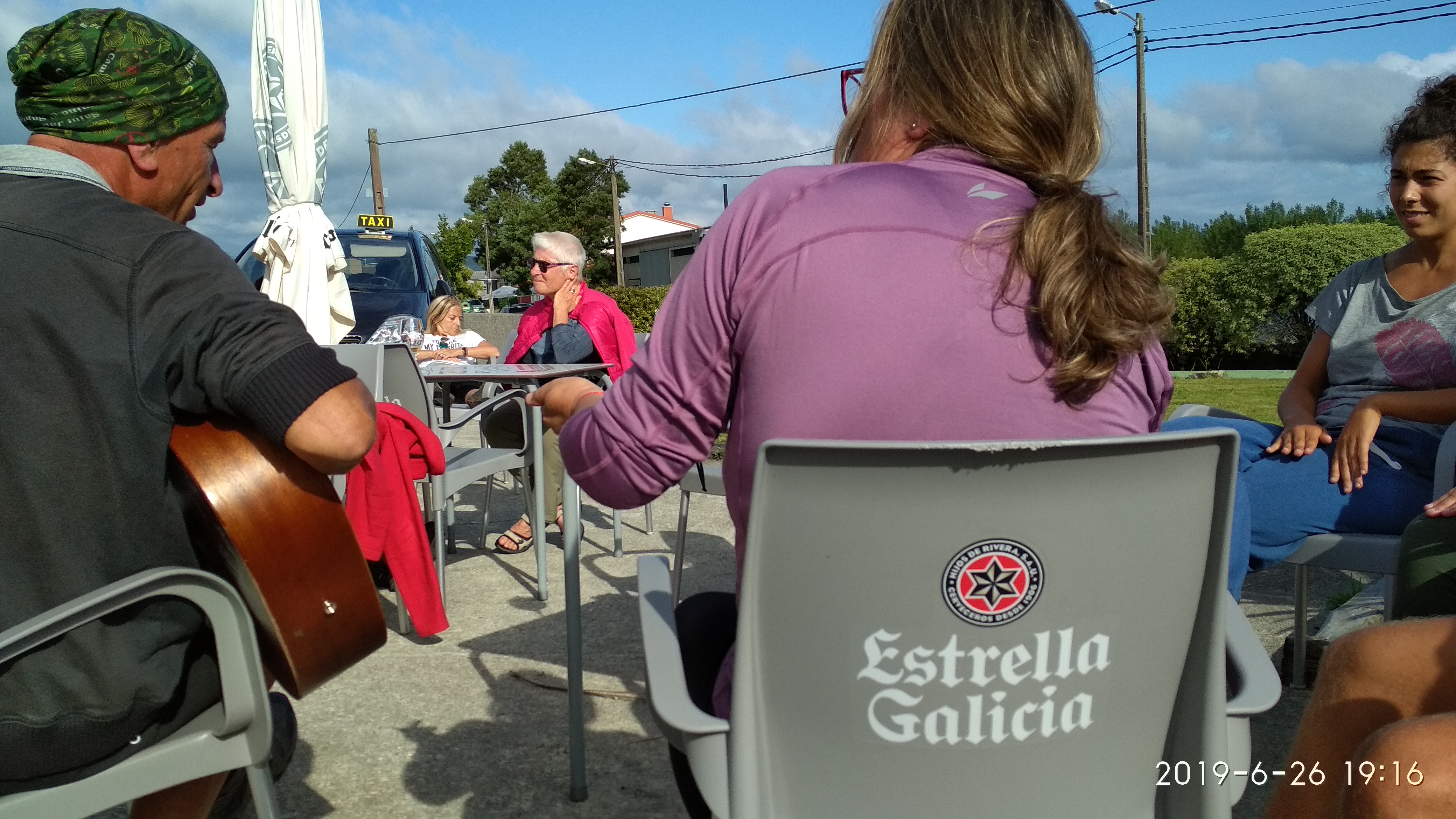 Este grupo se marchó y al poco rato llegan una serie de chavales jóvenes, de entre 17 y 18 años, alborotando y en 3 taxis. Eran casi todos chicos menos una chica. Mantenemos conversación con ellos y nos dicen que son de Arganda del Rey (Madrid), qué son un grupo más numeroso donde cada uno se organiza como puede. Que ellos han venido desde Negreira en taxi porque la mañana estaba hoy nubosa y muy lluviosa. Preparan un jaleo en el bar de muchísimo cuidado, y la camarera que tenía una pachorra que no podía con ella, no les hacía ni caso. Por eso ellos se alborotaban cada vez un poquito más.