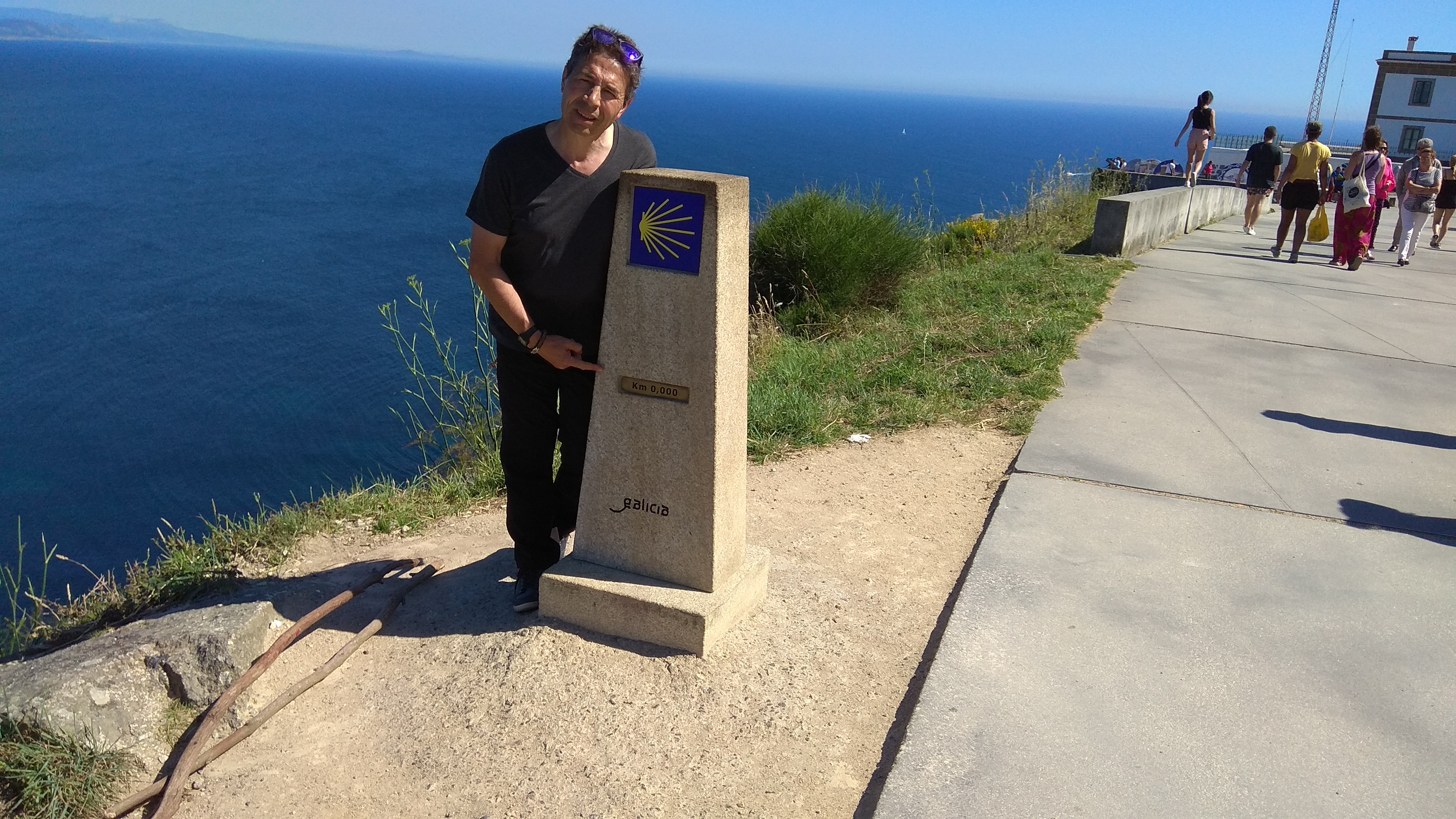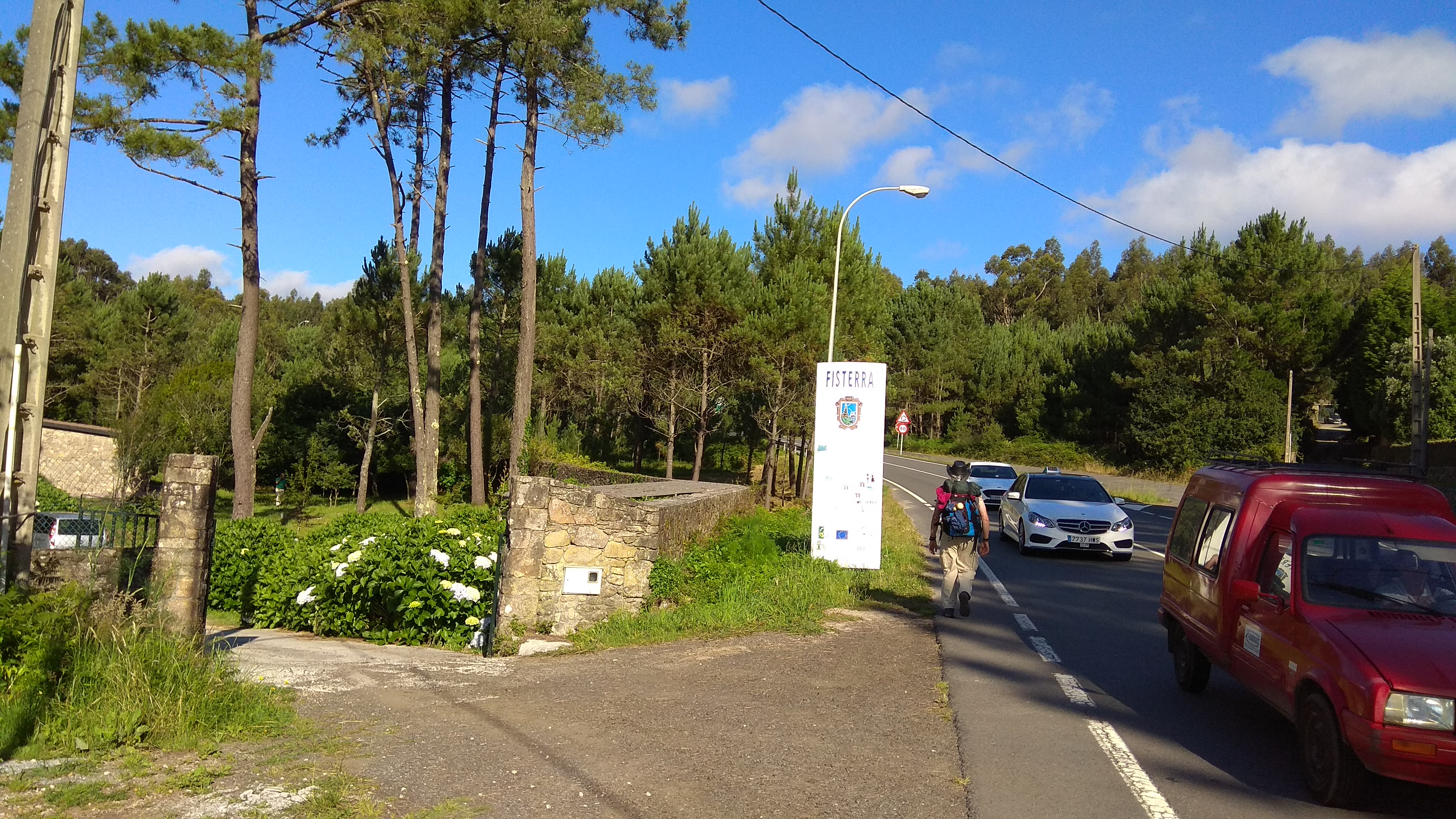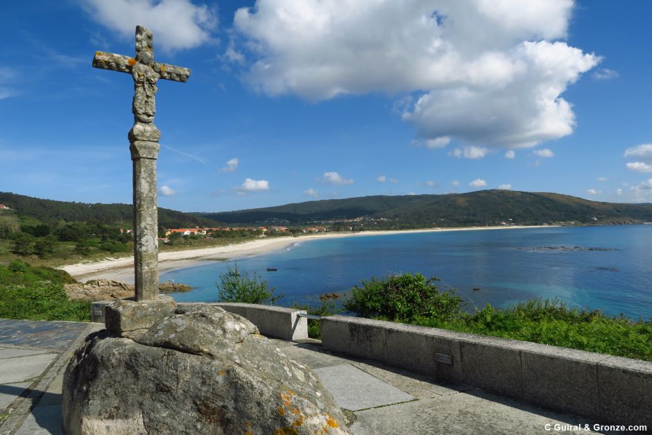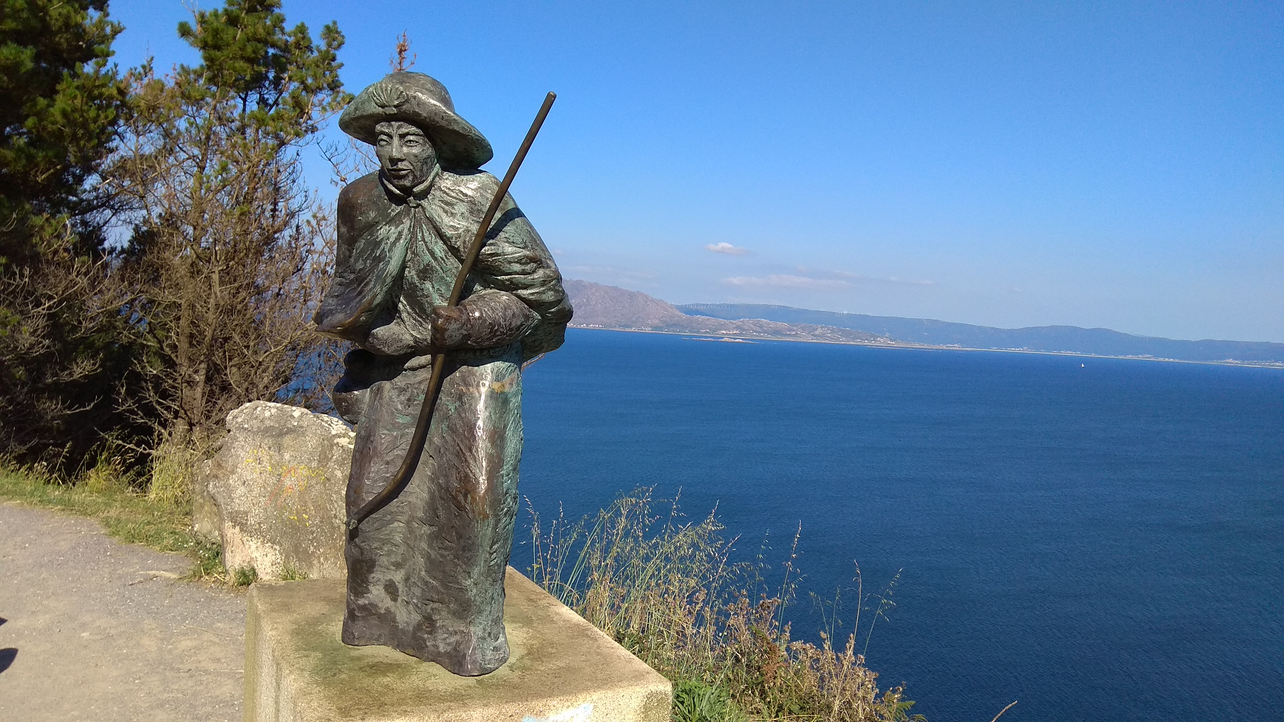 Y por fin arrancamos por la senda litoral de Langosteira que nos lleva directamente al pueblo de Finisterre. En apenas una hora entramos en Finisterre por el barrio de San Roque, pasando por la cruz de Baixar del s XVI, que representa al Cristo crucificado por un lado y, en el otro, María Inmaculada con el niño.