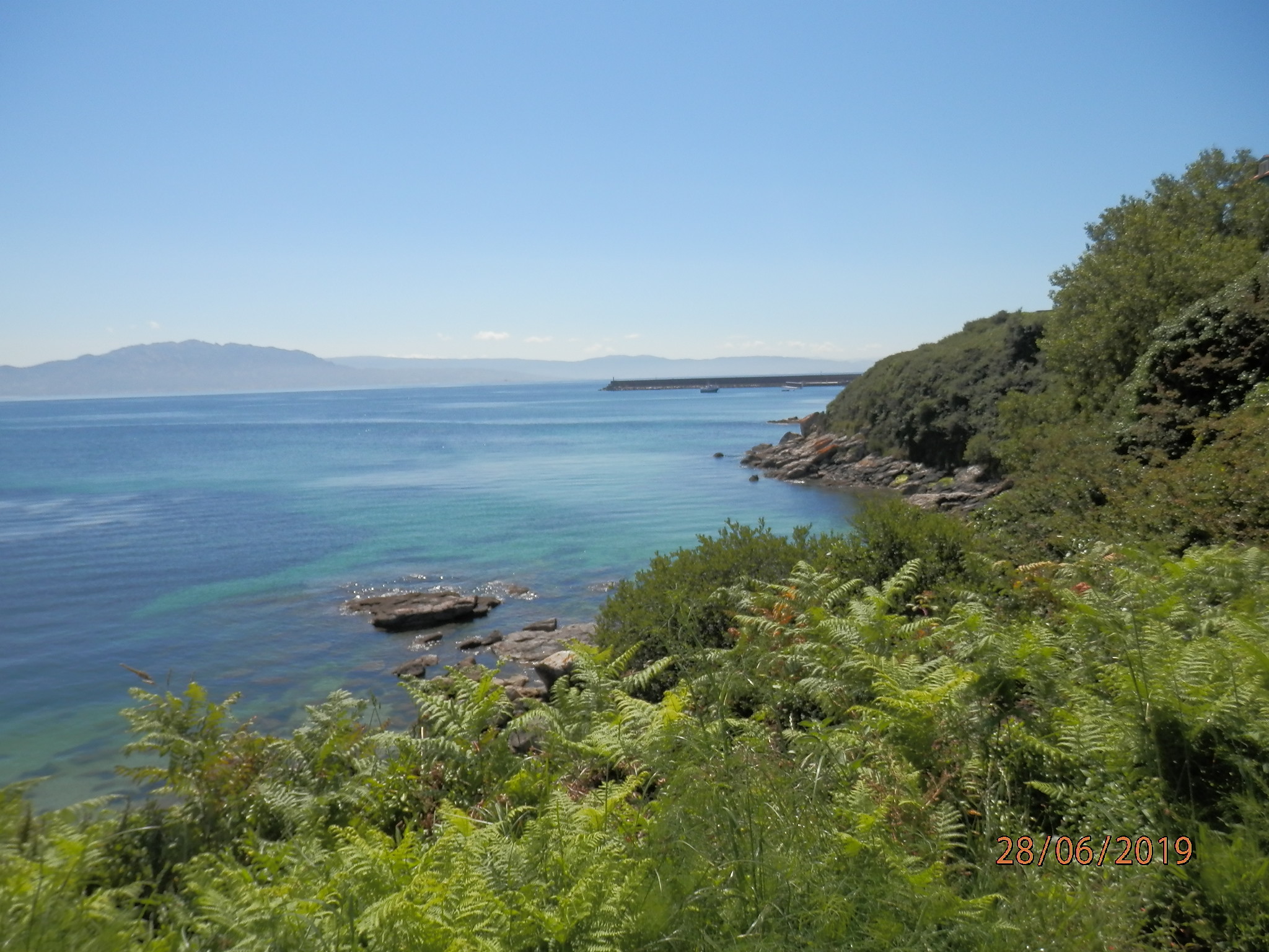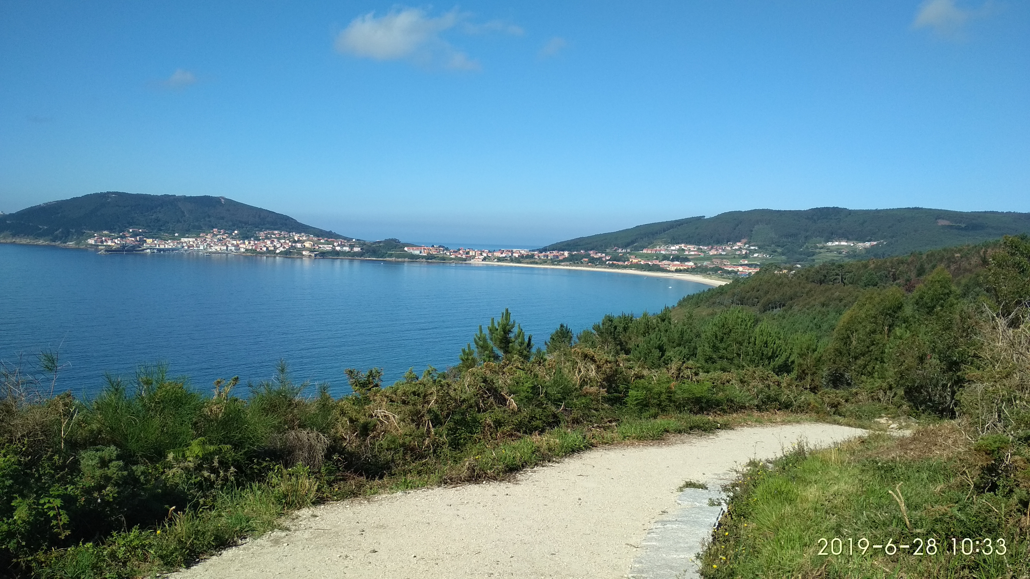 El desayuno que nos puso el jefe, fueron unas tostadas enormes que tuvimos que pedir dos cafés para poderlas pasar. Pasadas las 9 de la mañana nos pusimos en marcha, al principio por el paseo marítimo junto al mar, pero al llegar al cementerio la cuesta se empina considerablemente. Es aproximadamente media hora de subida dura y permanente. Después algún que otro sube y baja, pero el camino se suaviza bastante entre la vegetación y ya con las playas de Estorde y Sardiñeiro a la vista y con unas bonitas panorámicas de Cee y Corcubión; así alcanzamos el campo de San Roque y el albergue que gestiona la Asociacion galega de amigos do camiño de Santiago (AGACS).