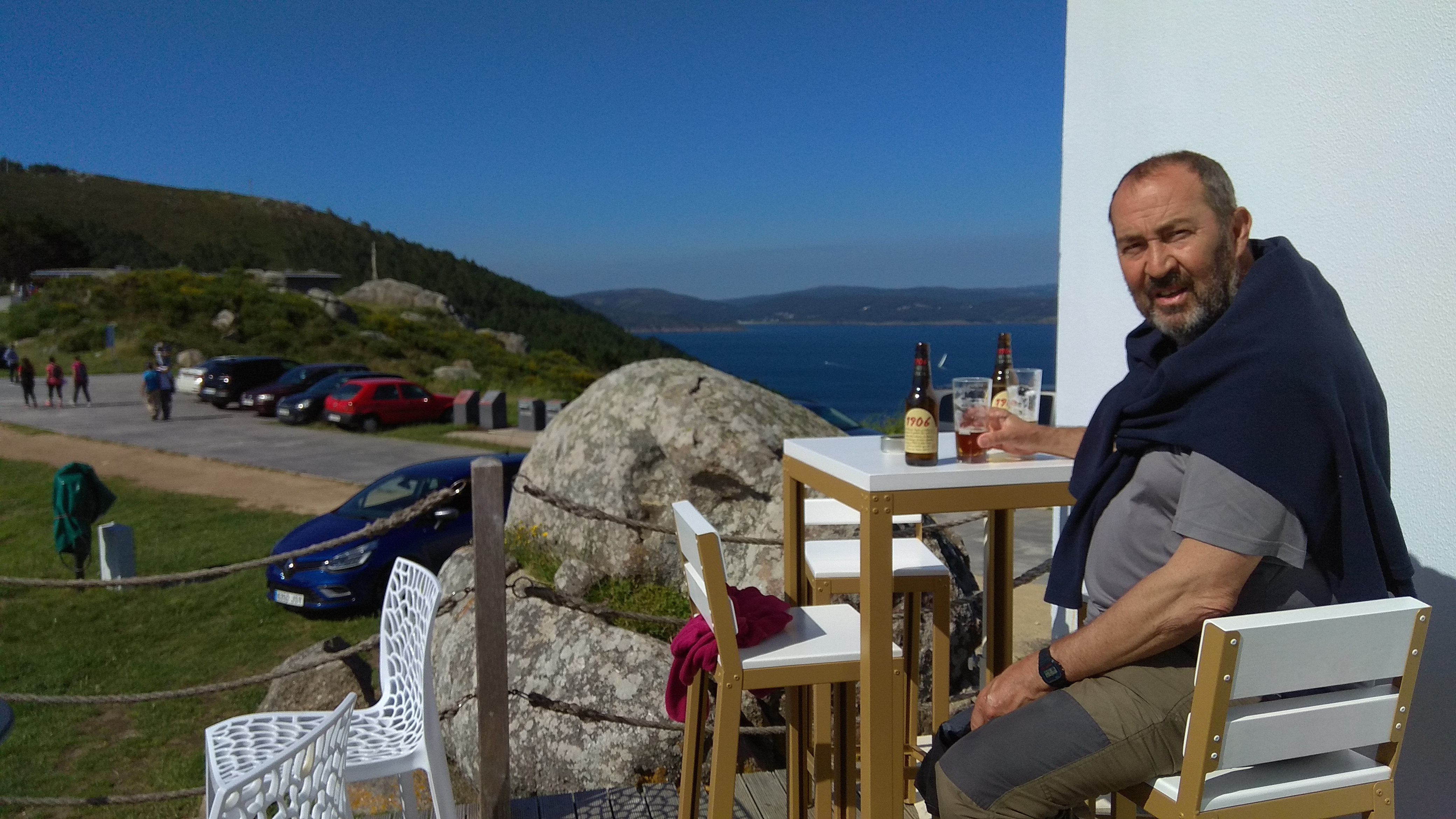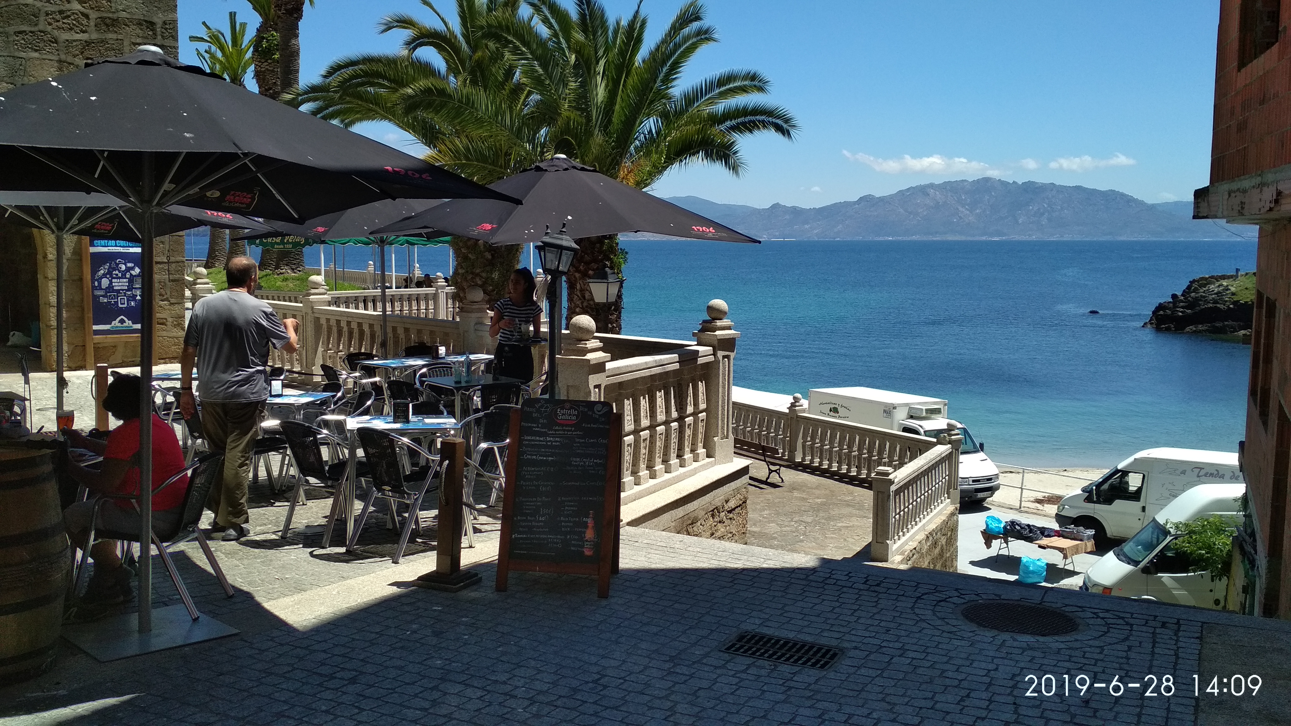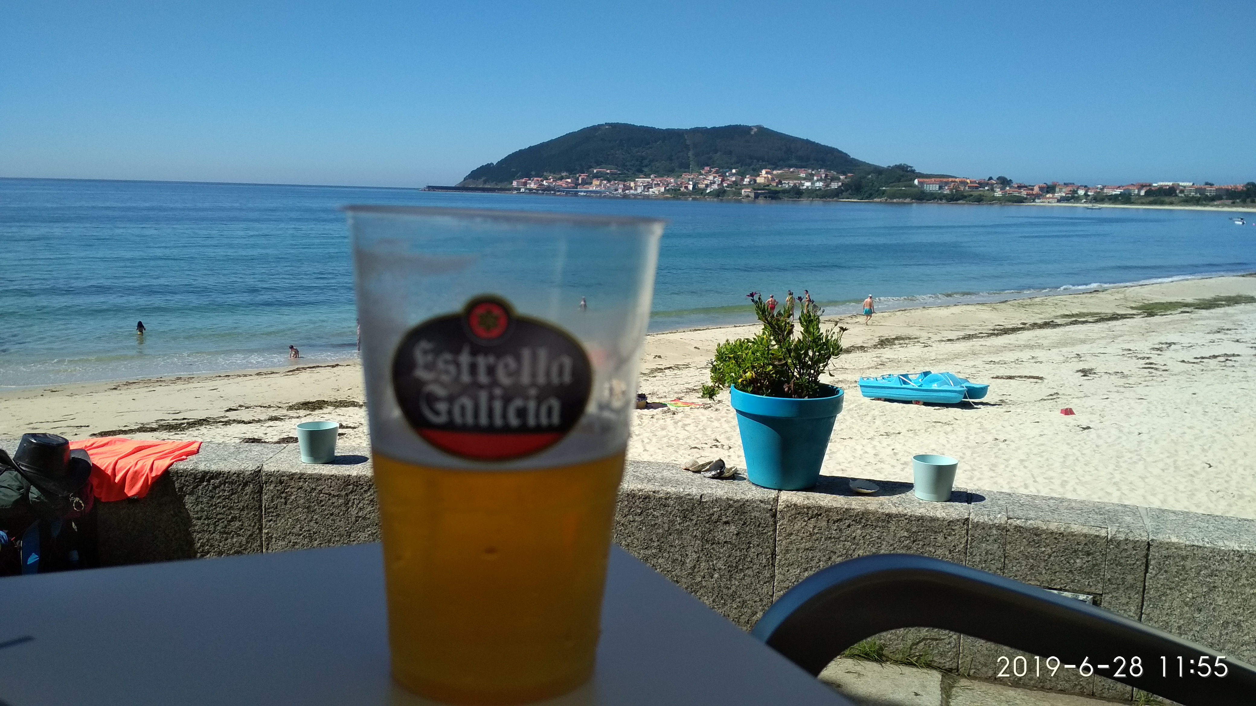 Alcanzamos al grupo de Marta y los chicos justo en el momento en que ellos iban hacia la playa; su idea era comer y pasar parte de la tarde de playa y más tarde subirían a Finisterre (llamaba la atención todos de amarillo paseando por la playa). Nosotros nos dirigimos hacia unas terrazas que nos llamaban a gritos, pero después de estar allí media hora no se presentó nadie para atendernos y eso que la puerta del bar estaba abierta. Reculamos un poco y al principio de la playa un pequeño chiringuito nos sirve para tomar la primera caña del día.