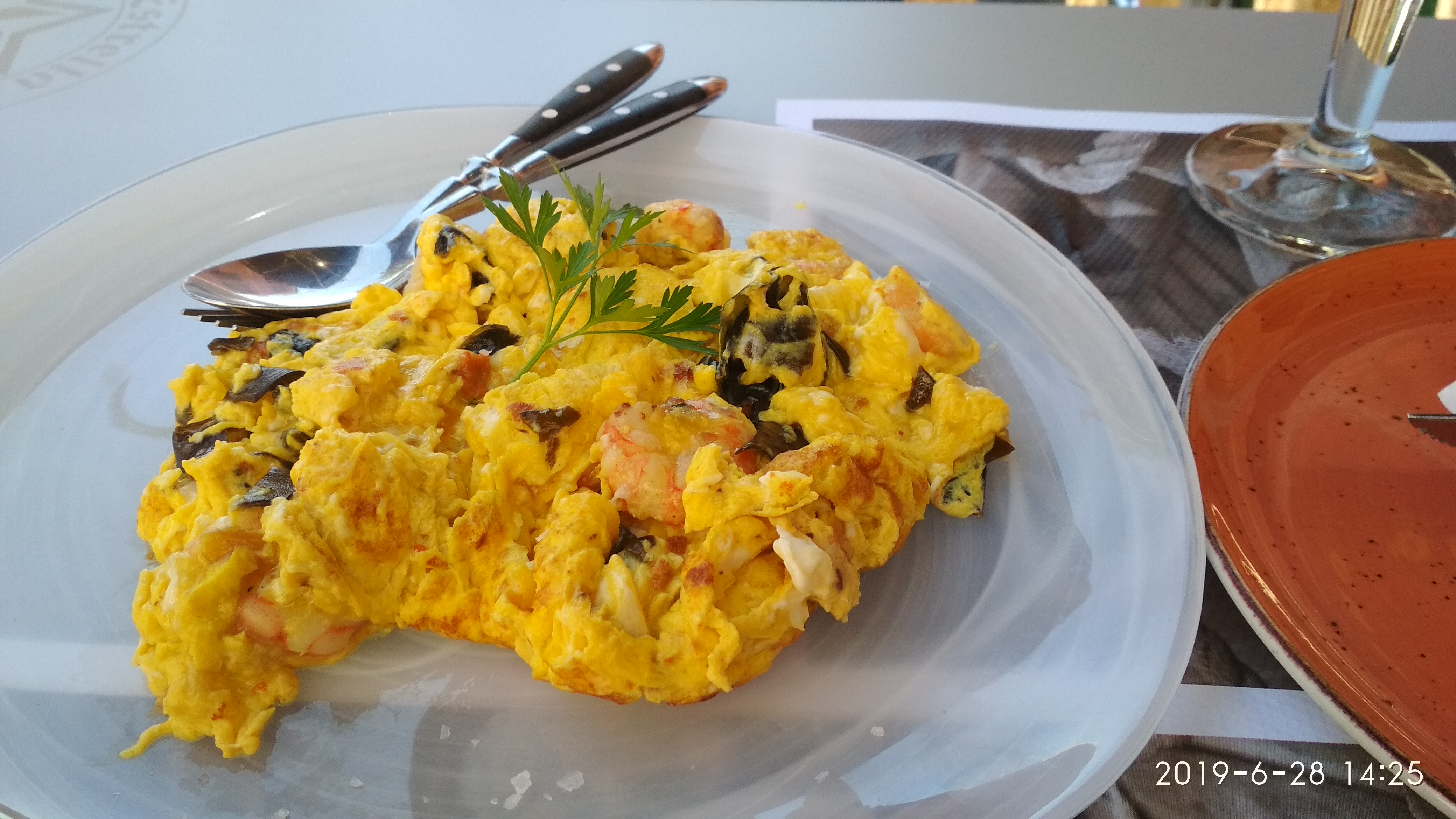 Nos sentamos en una terraza y con un revuelto de gambas, algas y erizos de mar, comimos los dos. El plato estaba delicioso.