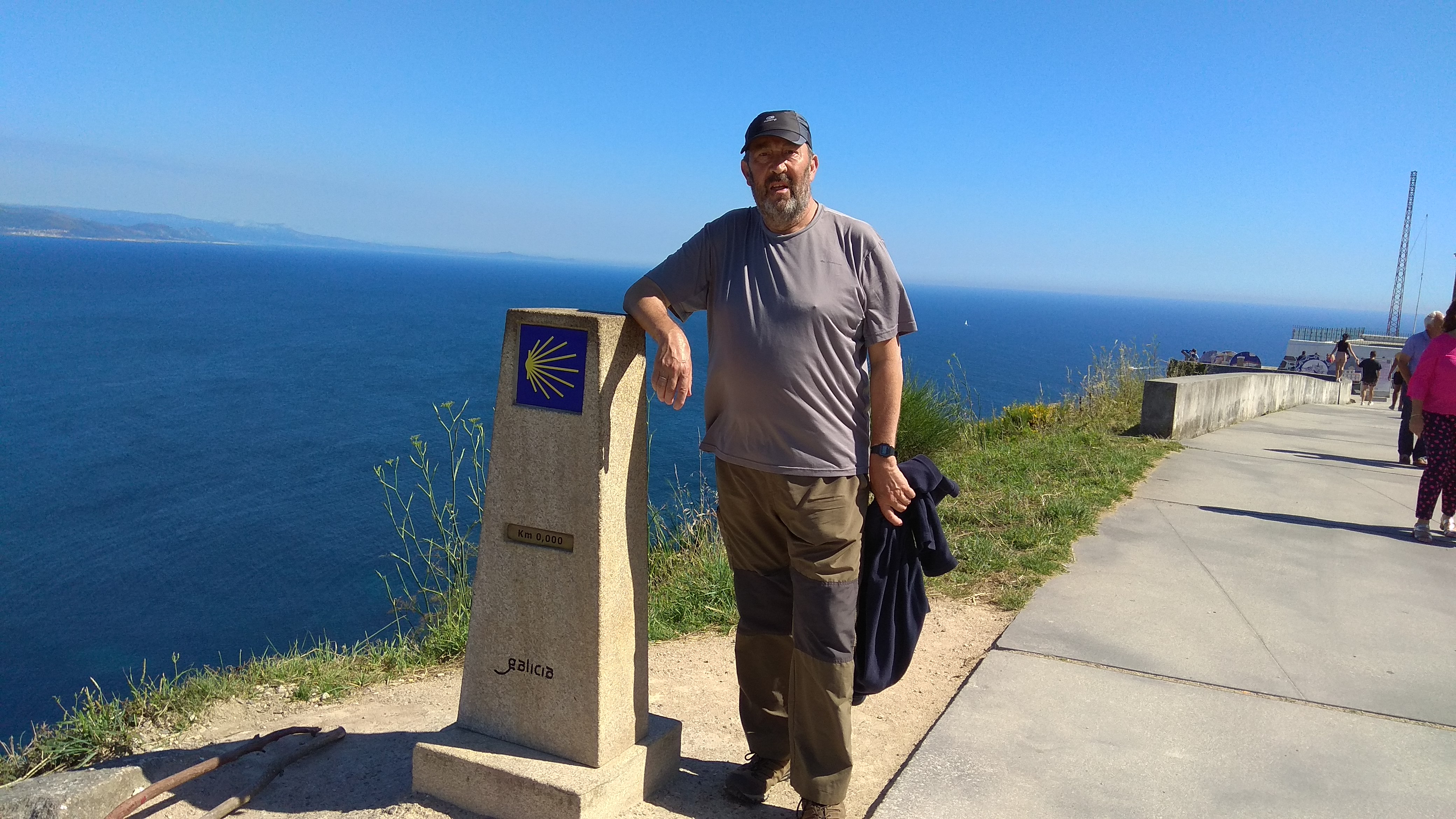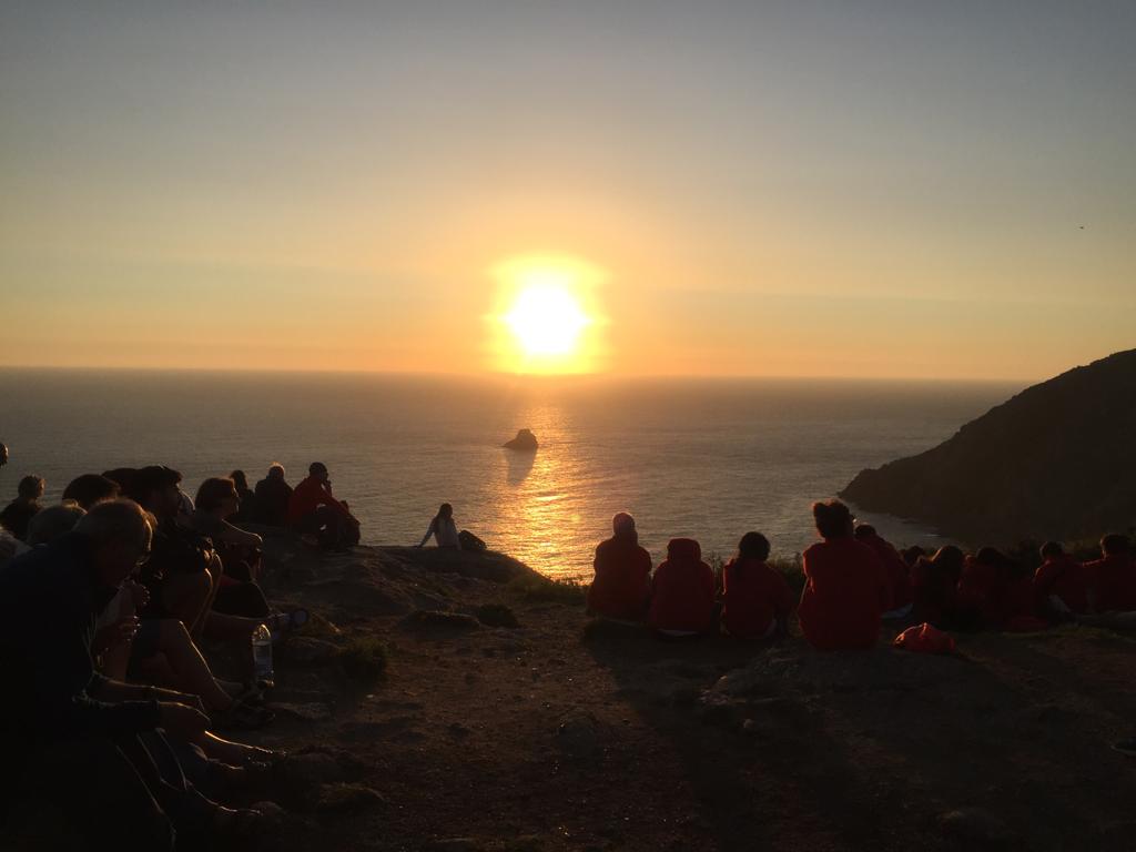 Poco después empezamos el regreso a Finisterre. Teníamos la colada aún tendida en el albergue y había que recogerla. Después nos bajamos a la zona del puerto a tomar unas cañas y ver el ambiente que había que era bastante agradable, con muchos peregrinos que había por allí. Vimos al grupo de Salas de los Infantes, que habían llegado a Finisterre y se disponían a subir al Cabo para ver la puesta de Sol. La siguiente foto nos la enviaron ellos.
